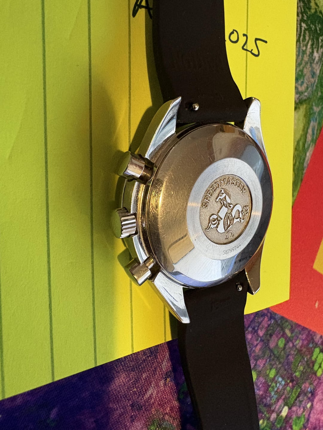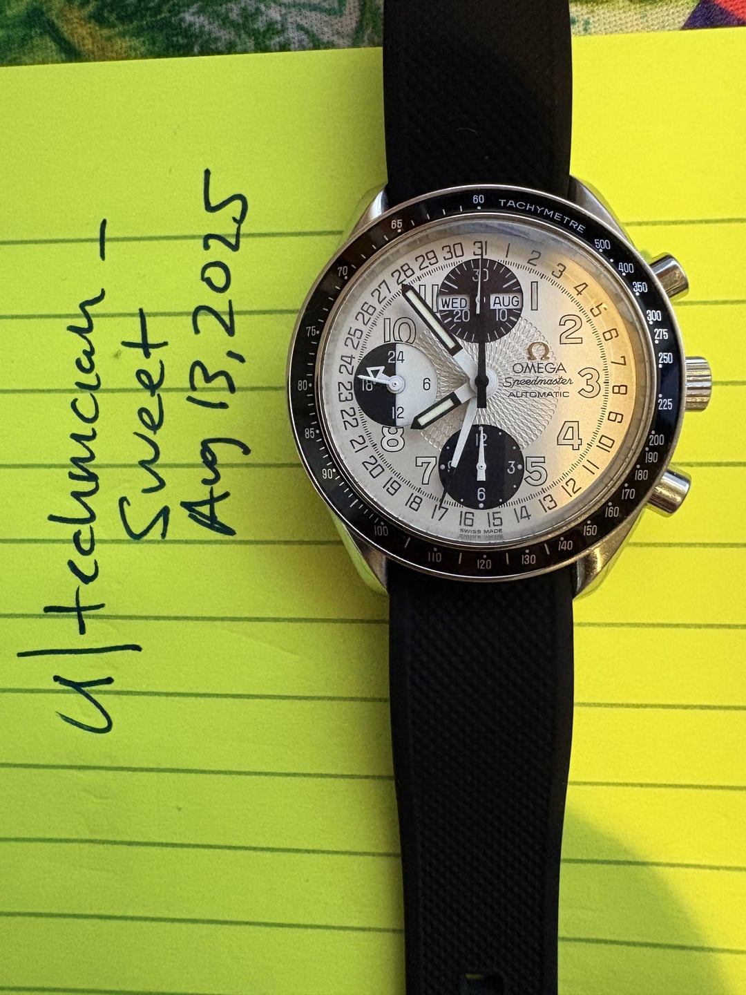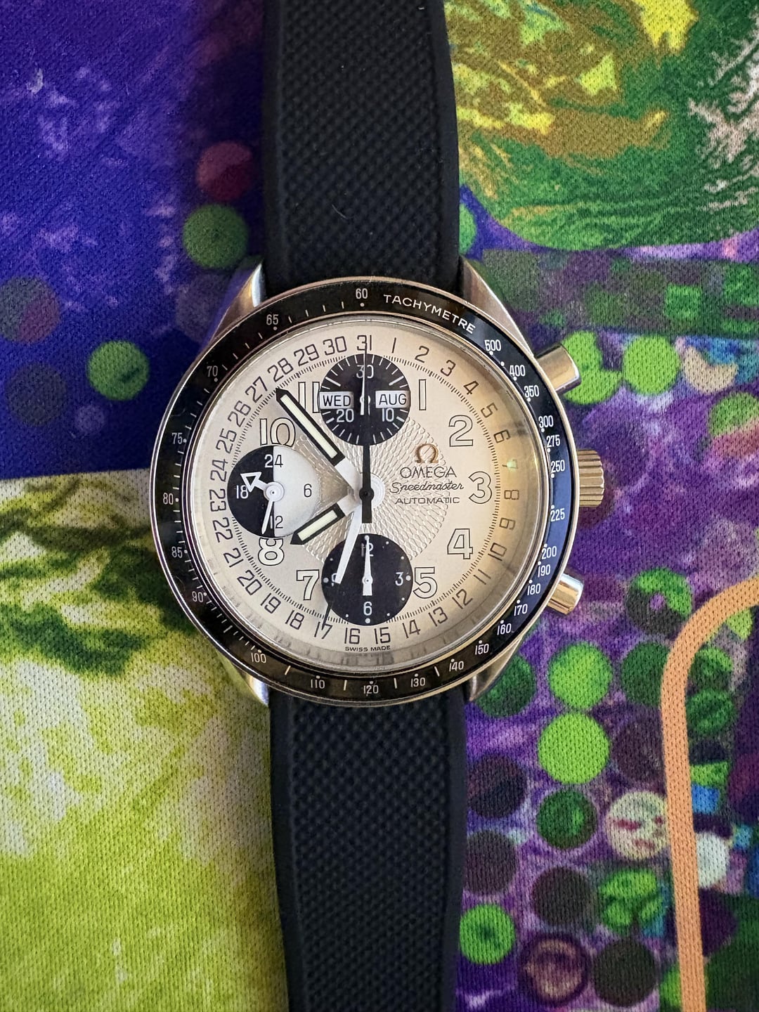 Hi all, selling this Omega Triple-Date 3523.30 customized with Omega sourced guilloche panda dial from an 3623.33 and black bezel and hands. I received this watch on a trade and did not know much about it. Through Google searches I was able to track similar pieces to Tambo Watches. I confirmed via the serial number over email with Tambo Watches that this was a piece they did in 2017. Here is a link to a similar watch: [https://tambowatches.com/product/omega-speedmaster-triple-date-mk40-am-pm-guilloche-panda-build/](https://tambowatches.com/product/omega-speedmaster-triple-date-mk40-am-pm-guilloche-panda-build/). Previous owners have passed it off as some mysterious Omega boutique special or an unknown reference. But it is a custom piece by an independent watchmaker who specializes in Omega. This is for full transparency. It is a unique piece with the stunning 3623.33 dial that has a slight rose gold tint. Fully functional, and chrono features work as expected.  Measurements include a 38mm case size and 18mm lug width. Omega calibre 1151 movement. Asking for $1700, or best offer. Priced low to move and with the strange backstory in mind. Price includes shipping. US buyers preferred. Thanks!