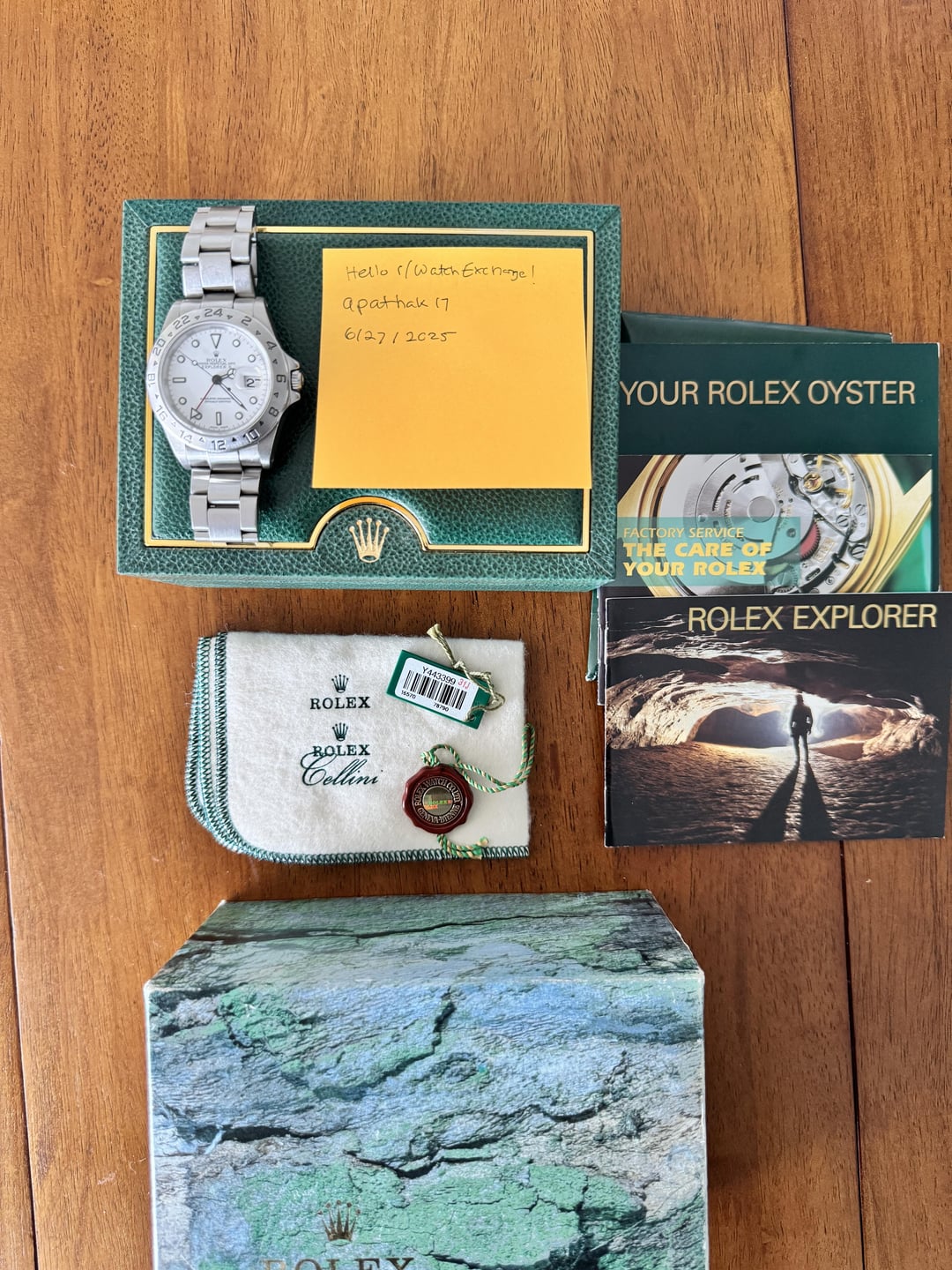 Hello r/WatchExchange, This is a repost. Previous listing used ChatGPT copy, as I was in a rush, didn’t double check it. This is now fully updated info: Up for sale is a Rolex Explorer II “Polar” Ref. 16570, an absolute icon in the Rolex lineup. This is the Y-serial (circa 2002) with the sought-after lug holes and no-rehaut dial, offering that perfect blend of old-school charm and modern Rolex robustness. It is in great condition for its age, including the original box, booklets, and both hang tags, which matching serials to the watch. Papers were lost in a move and do not come with it. I had it taken to my Rolex AD in Chicago and they were able to authenticate it, but they don't provide any paperwork for that. No service history. Watchmaker at the AD said it didn’t need any servicing which was incredible given the watches age This reference features the white “Polar” dial, a 40mm stainless steel case, and the Rolex Caliber 3185 movement with independently adjustable GMT hand. It’s a versatile, rugged travel watch with daily wearability. What’s Included: 1. Unpolished Watch Y-serial (2002), no rehaut, lug holes case 2. Box, booklets, both hang tags with matching engraving on the watch head 3. Oyster bracelet (missing some links, but should fit up to a 7.5in wrist with micro adjustment) Price: $6999 The money is going toward an unexpected bill that came up, so this is not a flip of any sort. Some people may look to take advantage of that, but I’m an honest collector and enthusiast trying to make sure myself and my family are taken care of. Low ballers will be not responded to. Shipping: Fully insured, two day, CONUS shipping preferred. Insured shipping will cost about $100-$140 depending on your location. Payment: Wire preferred, can discuss other verified methods like Zelle, PayPal F&F Feel free to reach out with any questions or for additional photos/video. Thanks for looking!