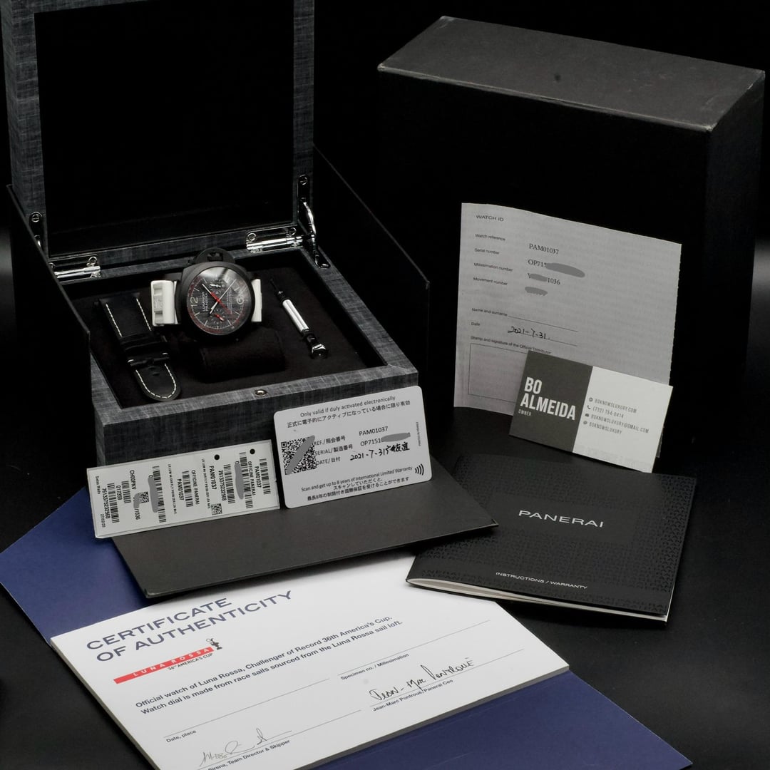 [https://www.dropbox.com/scl/fo/sbkbrezm1ac61xqgy1kg2/ANlt5J8WPBlPqplJ4p2Pnpc?rlkey=f5ubuousb3oq1mtri0o7fskyh&st=t4nn62lr&dl=0](https://www.dropbox.com/scl/fo/sbkbrezm1ac61xqgy1kg2/ANlt5J8WPBlPqplJ4p2Pnpc?rlkey=f5ubuousb3oq1mtri0o7fskyh&st=t4nn62lr&dl=0) **PAM01037 LUMINOR 1950 FLYBACK CHRONOGRAPH "LUNA ROSSA" AUTOMATIC GREY SAILCLOTH DIAL - 44MM - BOX AND PAPERS** **.** The PAM 1037 was released in 2019 to celebrate the partnership with the Luna Rossa racing team. The dial is “sandwich” cut from a piece of sailcloth pulled from one of the ships! The full black ceramic 44mm 1950s casing is very lightweight and nearly scratch-proof! . **- Reference: PAM 1037 | PAM 01037** **- 44mm ceramic case, titanium caseback** **- Calibre P.9100, 72 hour reserve** **- $19,600 plus tax MSRP** **.** ***Contents*****:** Watch, Luna Rossa box set, 2021 warranty card, 2x PAM branded straps (1x rubber and 1x leather), tool, booklet, and certificate of authenticity. ***Please note: Manufacturer warranty on this watch is valid until 07/2029!*** . ***Condition*****:** This watch is in near mint condition, and will only show light handling marks, and wear on the straps included with the watch. The photos in this album are shot on a macro setup in aggressive lighting, and accurately represent this watch. The movement is running well and does not need a service. . ***Price: $9,450.*** *Fully insured overnight shipping included in the US. Payment accepted via:* * *Bank Wire* * *Zelle* * *All major credit cards* . Please message me directly to confirm availability before marking sold! USAF veteran owned company with hundreds of successful deals done, and plenty of references available to any interested buyers. Thanks for looking! 🙏