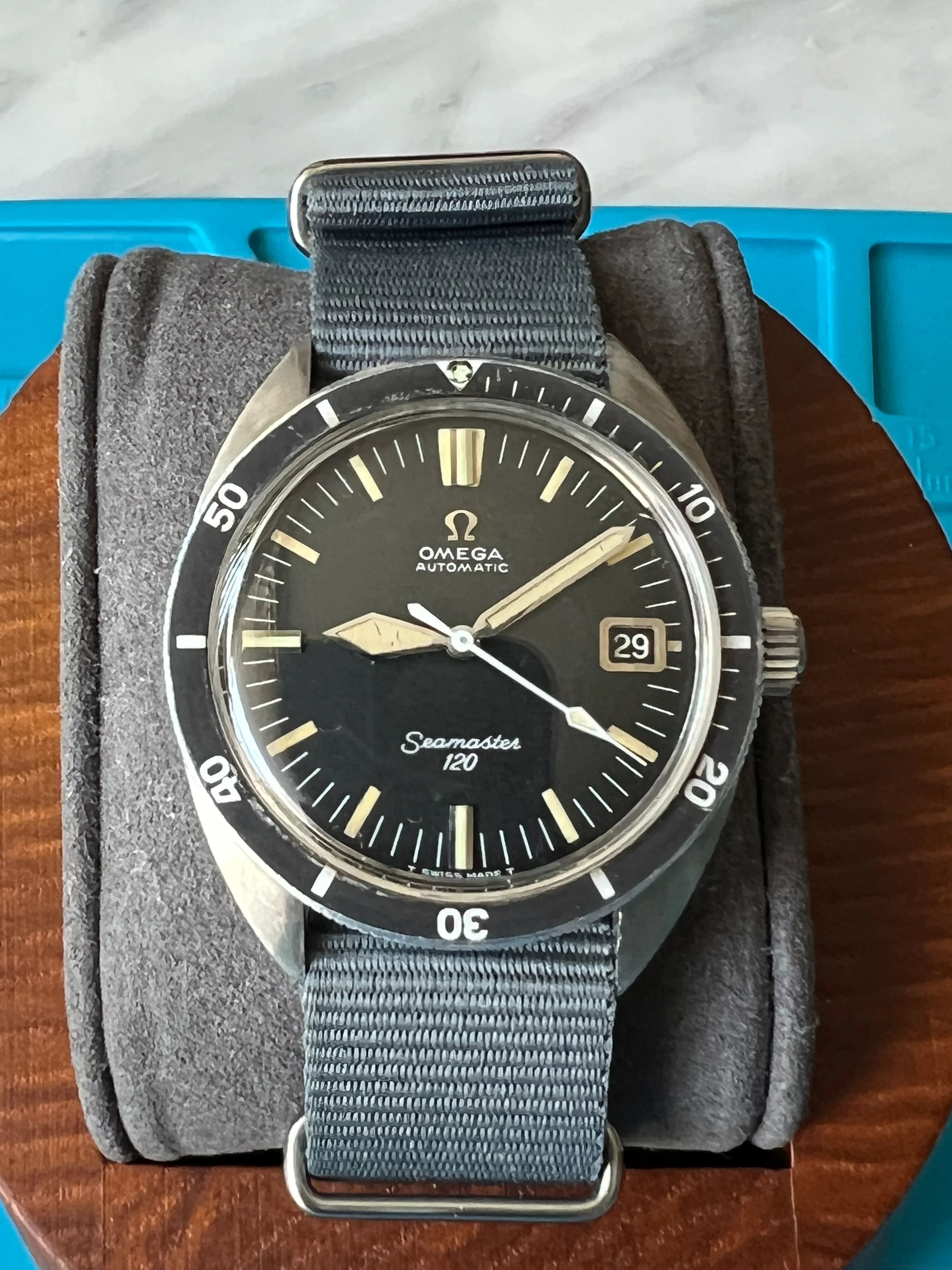 For sale I have an Omega Seamaster 120 166.027 with automatic caliber 563. This watch has sword hands and a Speedmaster style second hand, which are different than the hands usually seen on this model.
