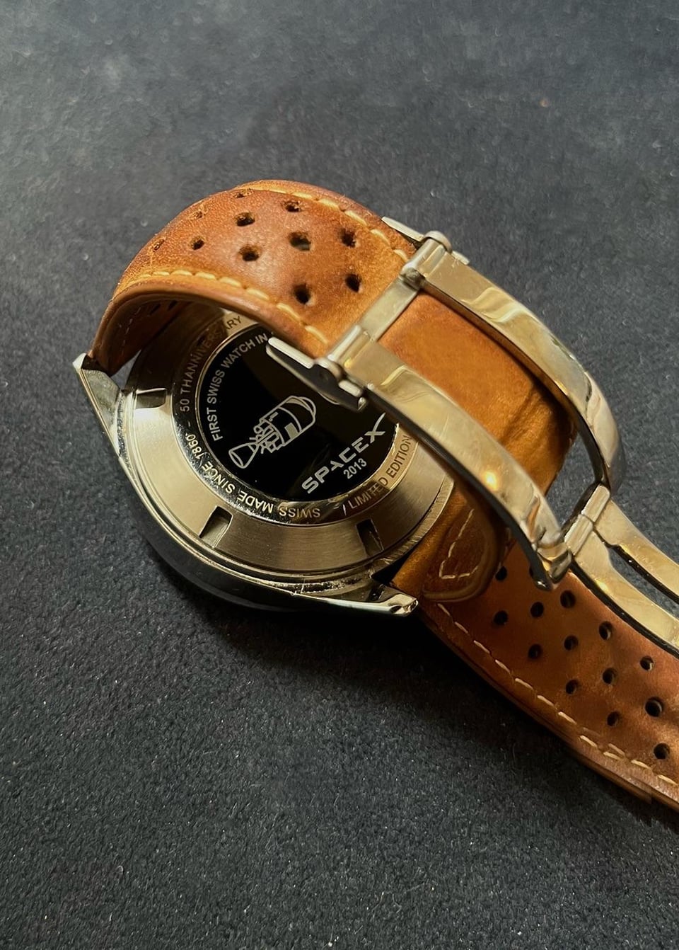 Selling my TAG Heuer Carrera Calibre 1887 SpaceX Chronograph Limited Edition. This model was released in 2013 to commemorate the 50th anniversary of John Glenn’s orbital flight. Limited to 2012 pieces worldwide, it’s a true collector’s piece and rarely comes up for sale. Model: Carrera Calibre 1887 SpaceX Limited Edition Reference: CAR2015.FC6321 Year: 2013 Case material: Stainless steel Crystal: Sapphire (front and exhibition caseback with Falcon 9 engraving + numbered limited edition) Strap: brown leather strap with folding clasp Water resistance: 100m Condition: Good with light signs of wear. Runs perfectly. Watch only.