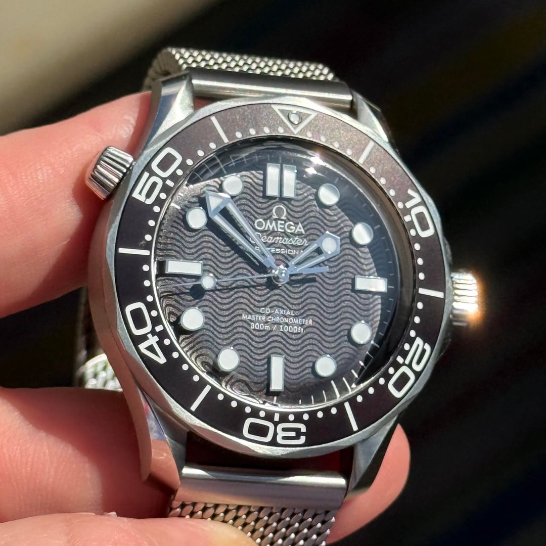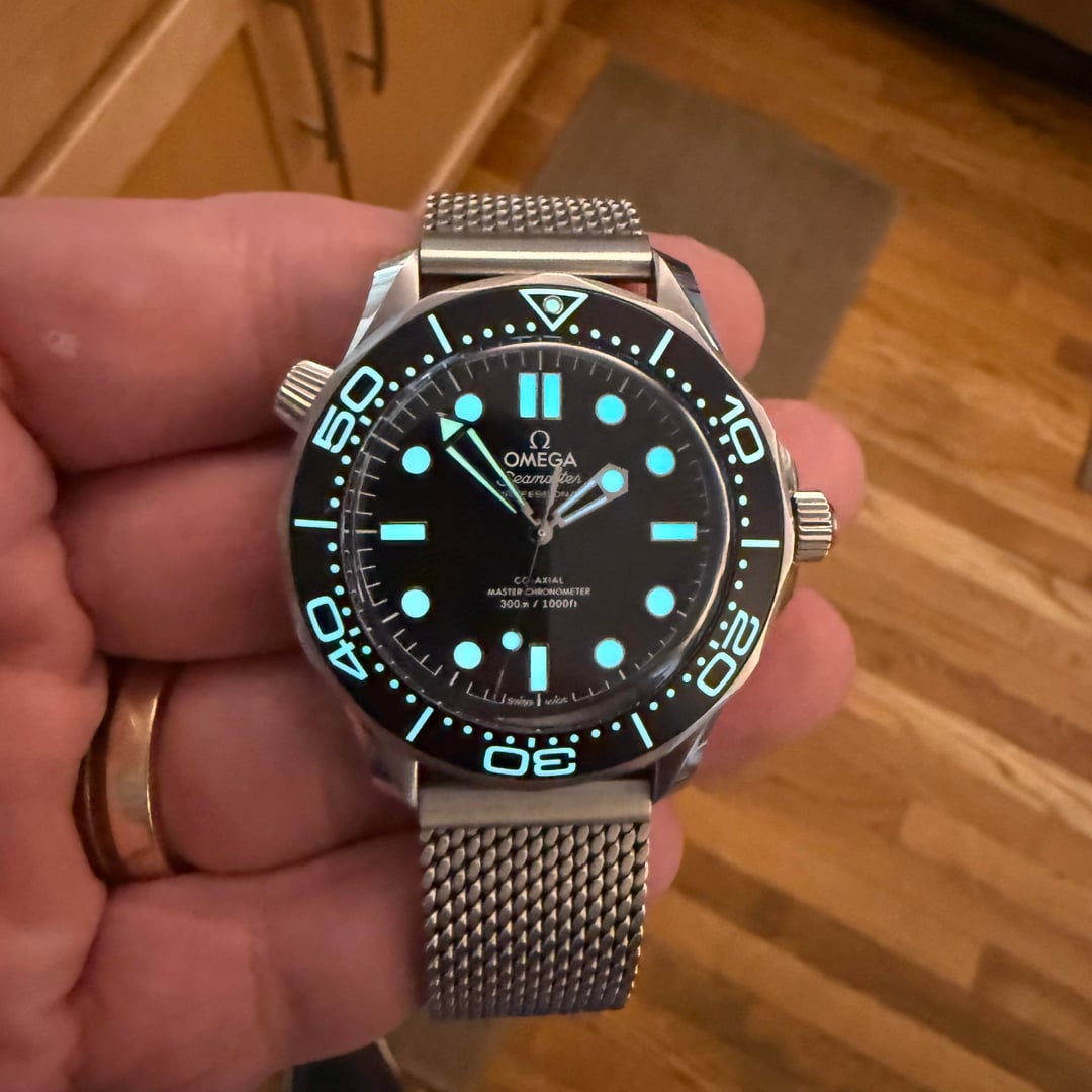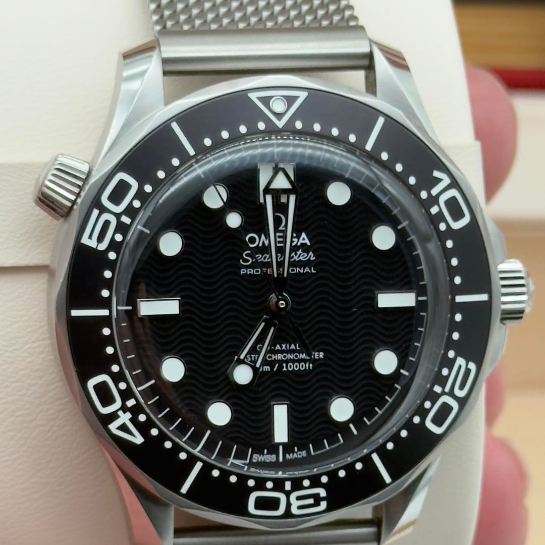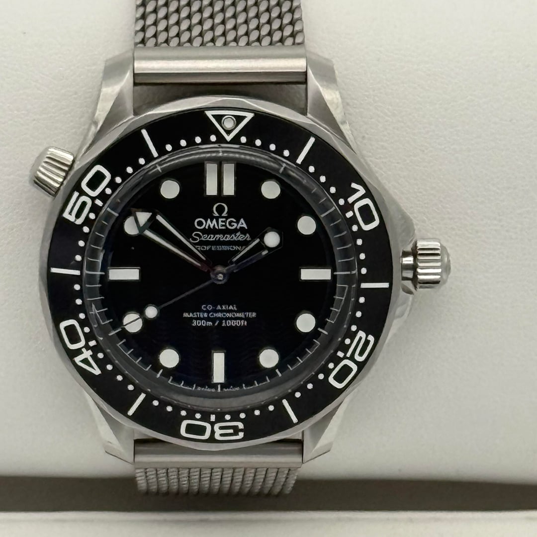Up for sale is my Omega Seamaster Diver 300M Co-Axial Master Chronometer 42mm, purchased new in Nov 2024 and in excellent pre-owned condition. This is the current generation Seamaster with the black ceramic wave dial and Omega’s METAS-certified movement. Specs: • Model: Omega Seamaster Diver 300M – 210.30.42.20.01.010 • Case: 42mm stainless steel, brushed & polished • Dial: Black with laser-engraved wave pattern • Bezel: Black Aluminum unidirectional, white enamel diving scale • Crystal: Domed sapphire with AR coating on both sides • Movement: Omega Caliber 8800 Co-Axial Master Chronometer (METAS certified, anti-magnetic to 15,000 gauss) • Power Reserve: 55 hours • Water Resistance: 300m / 1000ft • Bracelet: Stainless steel mesh • Helium Escape Valve at 10 o’clock • Transparent sapphire case back Condition: Excellent – minimal wear from careful use. Crystal and bezel are flawless, bracelet shows light desk wear only. Runs within COSC/METAS specs. Included: Full kit – triple box set (outer, inner, and presentation), warranty card, pictogram card, master chronometer card, hang tag, manual, all links. Price: $5,595 shipped, insured. Payment by bank wire, Zelle, or credit card add 3.5%. So Cal residents add sales tax. No trades at this time.