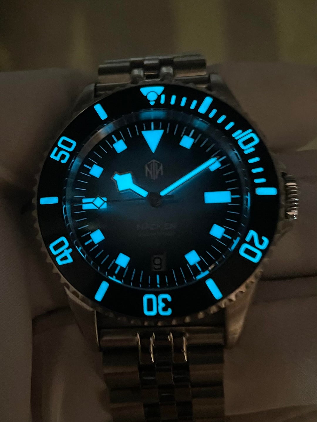 Here we have a beautiful Nth Näcken Renegade Date Sub. This is the later V2 Sub case with the crown guards and sub bezel. Comes on a nice Gekota jubilee to spiffy it up. Running well and looking great! * Movement: Mechanical * Calibre: Miyota 9015 * Hacking: Yes * Power reserve: 40 hours * Hand winding: Yes * Automatic: Yes * Glass: Sapphire with AR coating * Date: Yes * Width (without crown): 40mm * Thickness: 11.5mm * Lugs: 20mm * Lug to lug: 48mm * Water resistance: 300m Asking $350 shipped in the USA with PayPal Friends and Family. International shipping is extra. Thanks for looking!