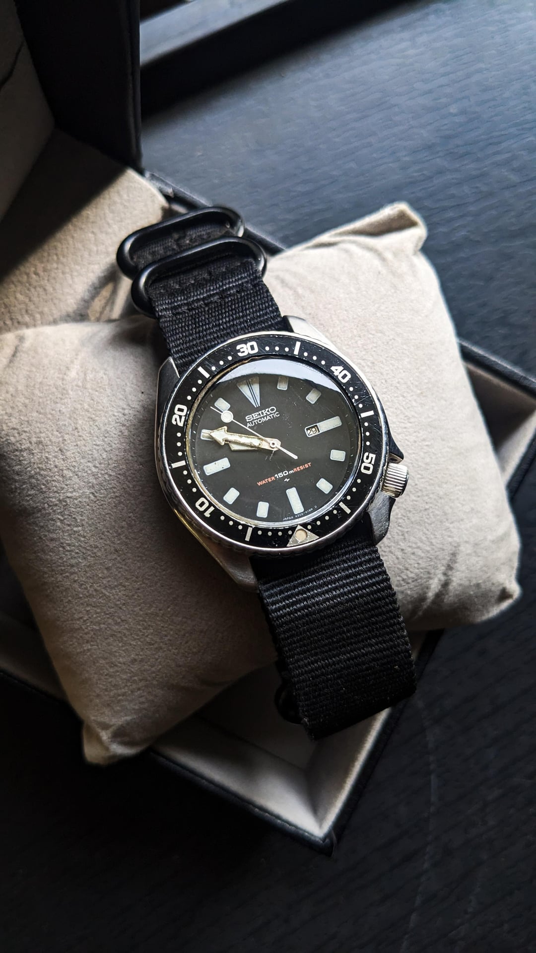 Hello WatchFam, A very Beautiful and very Rare 1995's Seiko scuba automatic diver watch with mid sized , automatic movement , working fine for daily usage wave controlled Solar Titaniu watch . This is also one of my favorite watch from Seiko due the the beautiful presence . The watch contains aftermarket nato strap and comes with an aftermarket Box.no original papers/box Watch reference number is 4205-0156 movement working fine (not serviced) Watch is in very good condition as shown in the pictures. And can be gifted to your loved. ones as a vintage article Watch Measures are lug to lug 36mm with crown 32mm approx. Bracelet NATO aftermarket Price $260$ Timestamp: https://imgur.com/a/r13DS09