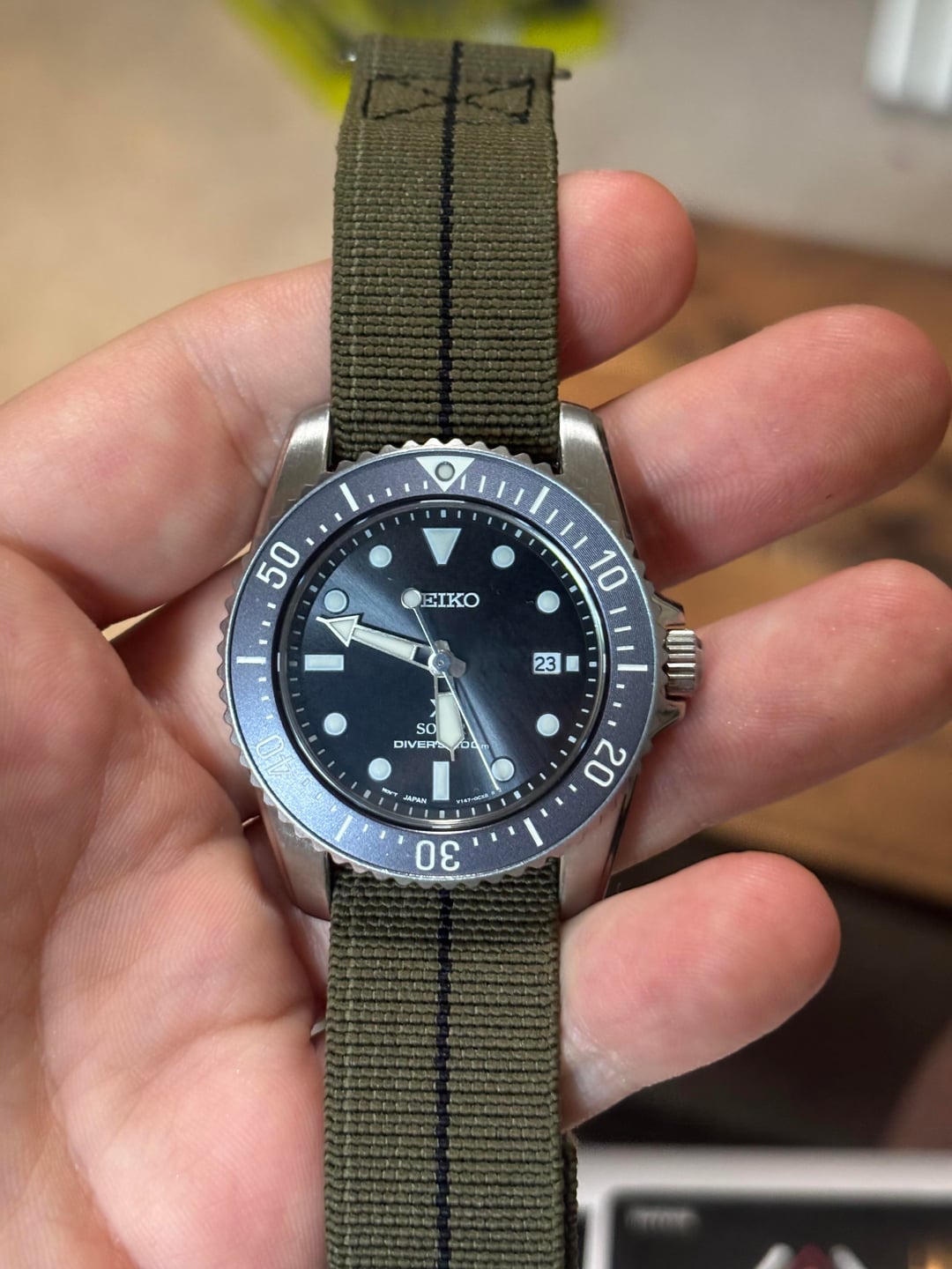 Selling a few watches to fund a grail and the solar Seiko is one of them. 38.5 mm of grab-n-go goodness with a gray/blue bezel kinda like a poor man’s sub ghost bezel. Comes with an Islander oyster bracelet with extra links and an extra strap. No box or papers (I didn’t get any when I bought the watch). The extra strap I have on it now is a CNS paratrooper, though I have a ton more 20mm straps and am happy to let you choose from those if you want. General specs: V147, 38.5 width, 46.5 l2l, 10.5 thickness, 200 meter water resistance. More pics at https://drive.google.com/drive/folders/1yEMpwZegFv53lR4K_o-DPnzTIDdQkuyf More info at https://www.seikowatches.com/middleeast-en/products/prospex/sne569 Asking $400 to me via PayPal (FF or GS, buyer pays GS). Shipping included for CONUS.