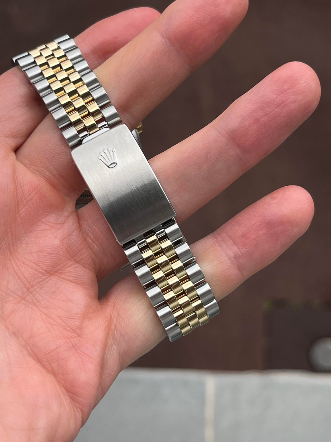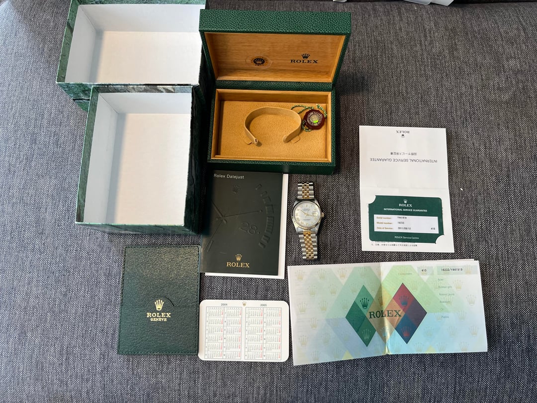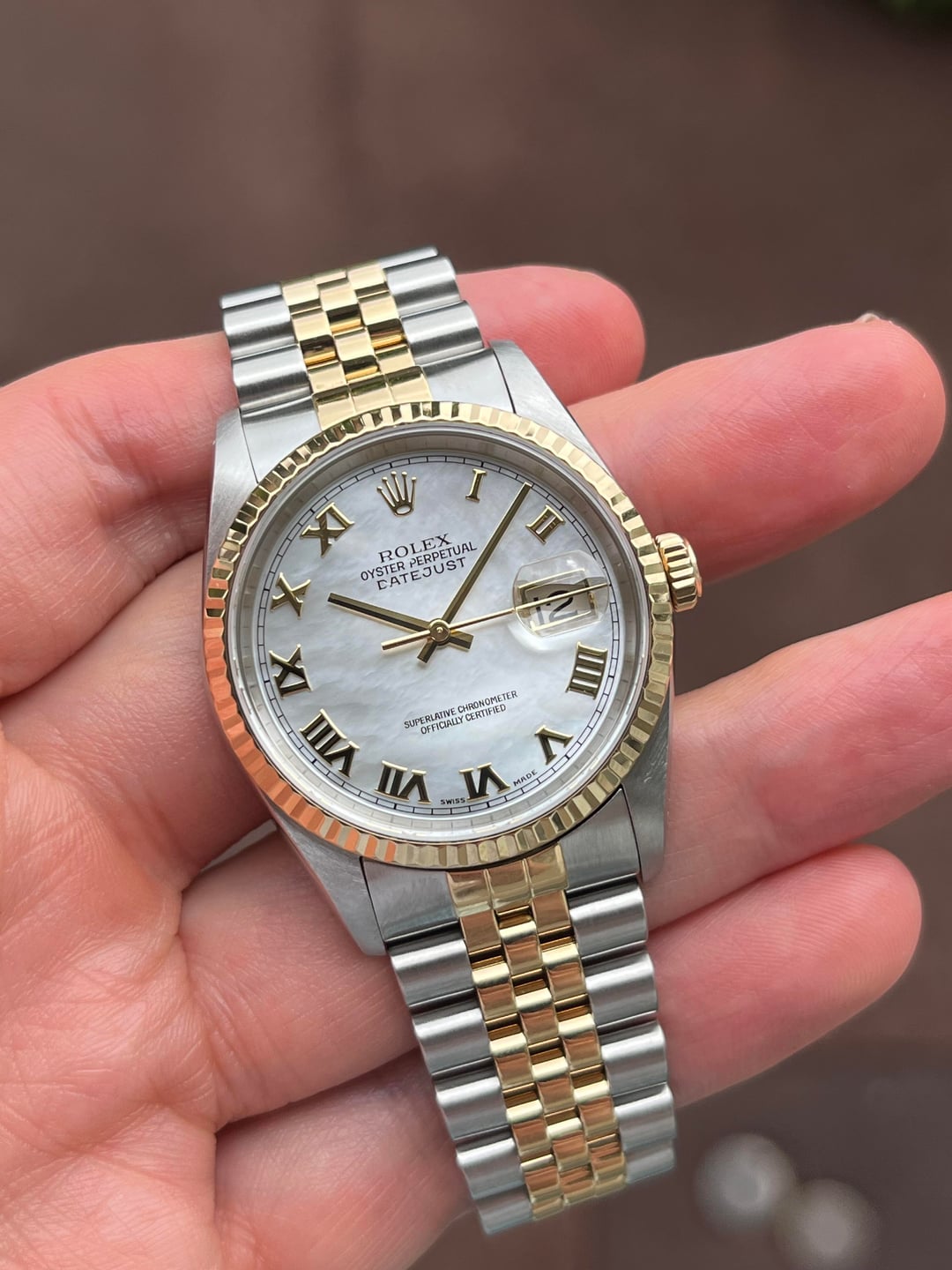 Up for grabs today is something very very cool. This is a two-tone **Rolex Datejust** (ref. 16233) with a **Roman Mother of Pearl dial!** MOP's don't come up for sale too often, and it's a real head turner when you see one. The texture and color of the dial changes depending on the light, and no two dials are ever the same design. Comes with box and papers from 2004, as well as the original booklets and calendar card. The watch was serviced approx. 12 months ago and as such, is running nicely when tested. The watch is in very good to excellent condition with perfectly clean case and bracelet. There is a small mark on the crystal and this can likely be polished out. **Price: $7,560.** Have been a trusted seller on Reddit since 2018. Can provide references from 600+ prior successful watch transactions. If you have any questions or would like to see a video, just let me know! Thanks
