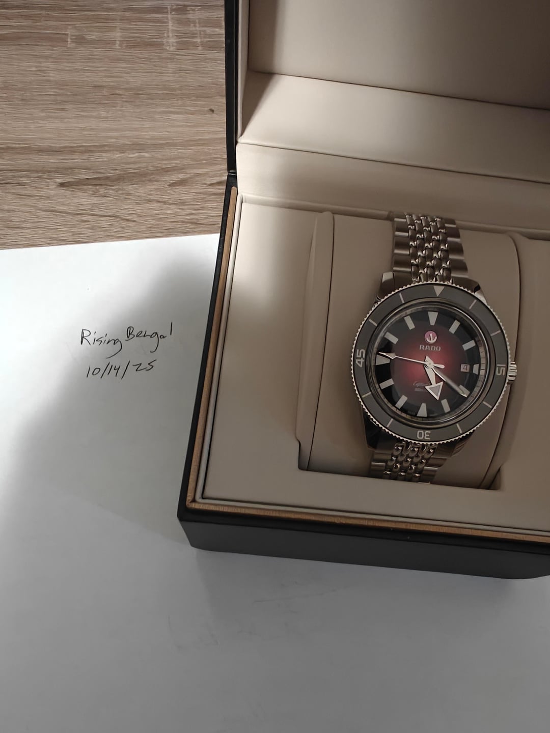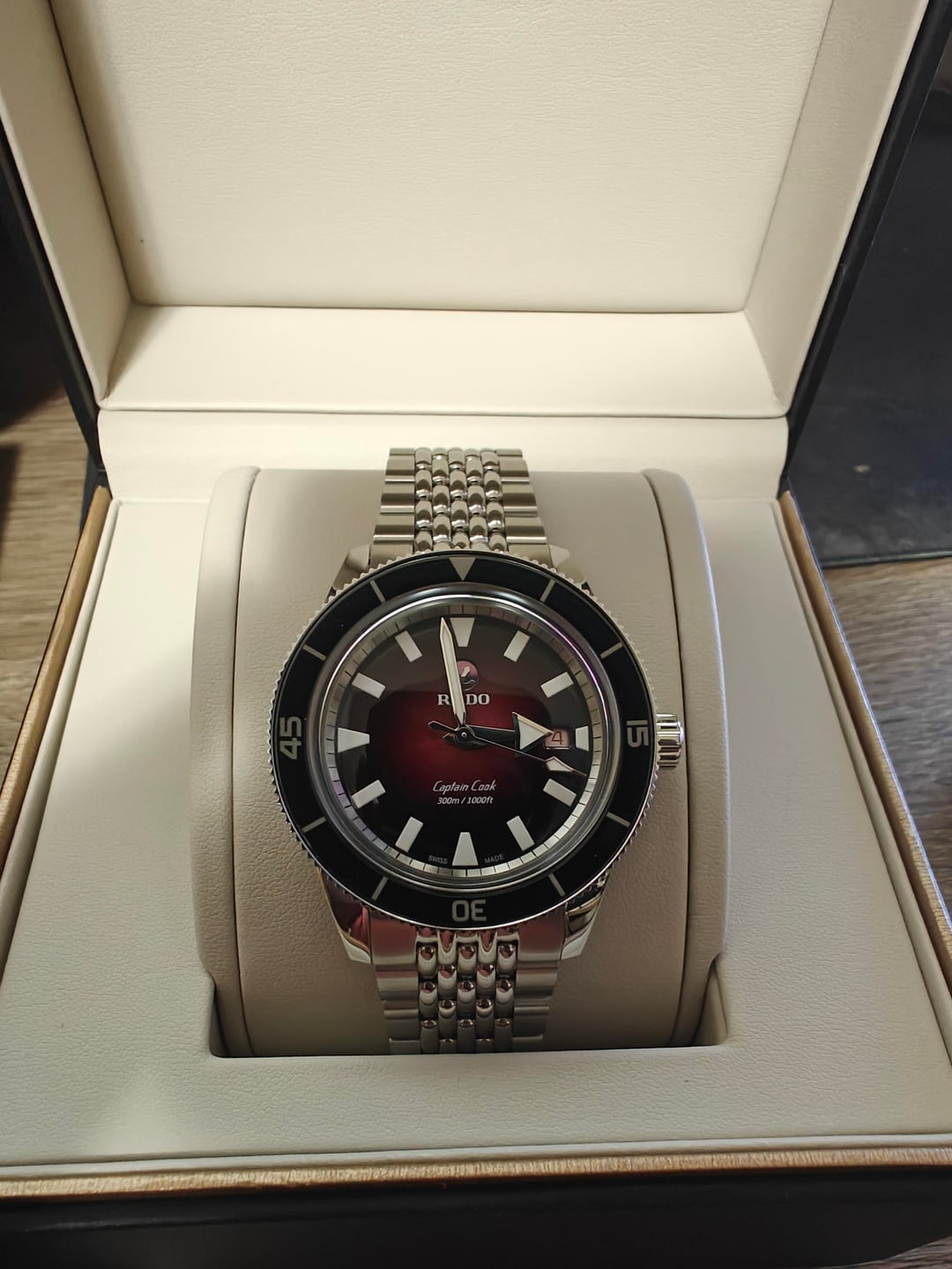 Hello [r/watchexchange](https://www.reddit.com/r/watchexchange/), up for sale is a brand new Rado Captain Cook in Red. ***Quick description:*** *The dial presents a dark red colour gradient that ends in black. The black is taken up by a rotating bezel in black high-tech ceramic. A striking three-row stainless steel bracelet enhances the powerful first impression, lending it an aura as mystical as it is masculine.* ***Specification and condition*** \- Condition: Watch is brand new, never worn **-** Bracelet: Watch comes with original bracelet plus brand new authentic Rado Beads of Rice bracelet (currently installed) \- Reference Number: R32105353 \- Case material: High-Tech Ceramic, Stainless Steel \- Case diameter: 42.0 mm \- Movement type: Automatic \- Functions: Date \- Weight: 164g **Timestamp**: See attached photo ***Pricing, Payment & Shipping*** **Price**: $1,350 USD **Shipping Method**: Included in price **Payment Method**: PayPal F&S or G&S invoice (buyer must pay fee), Zelle **No trades**
