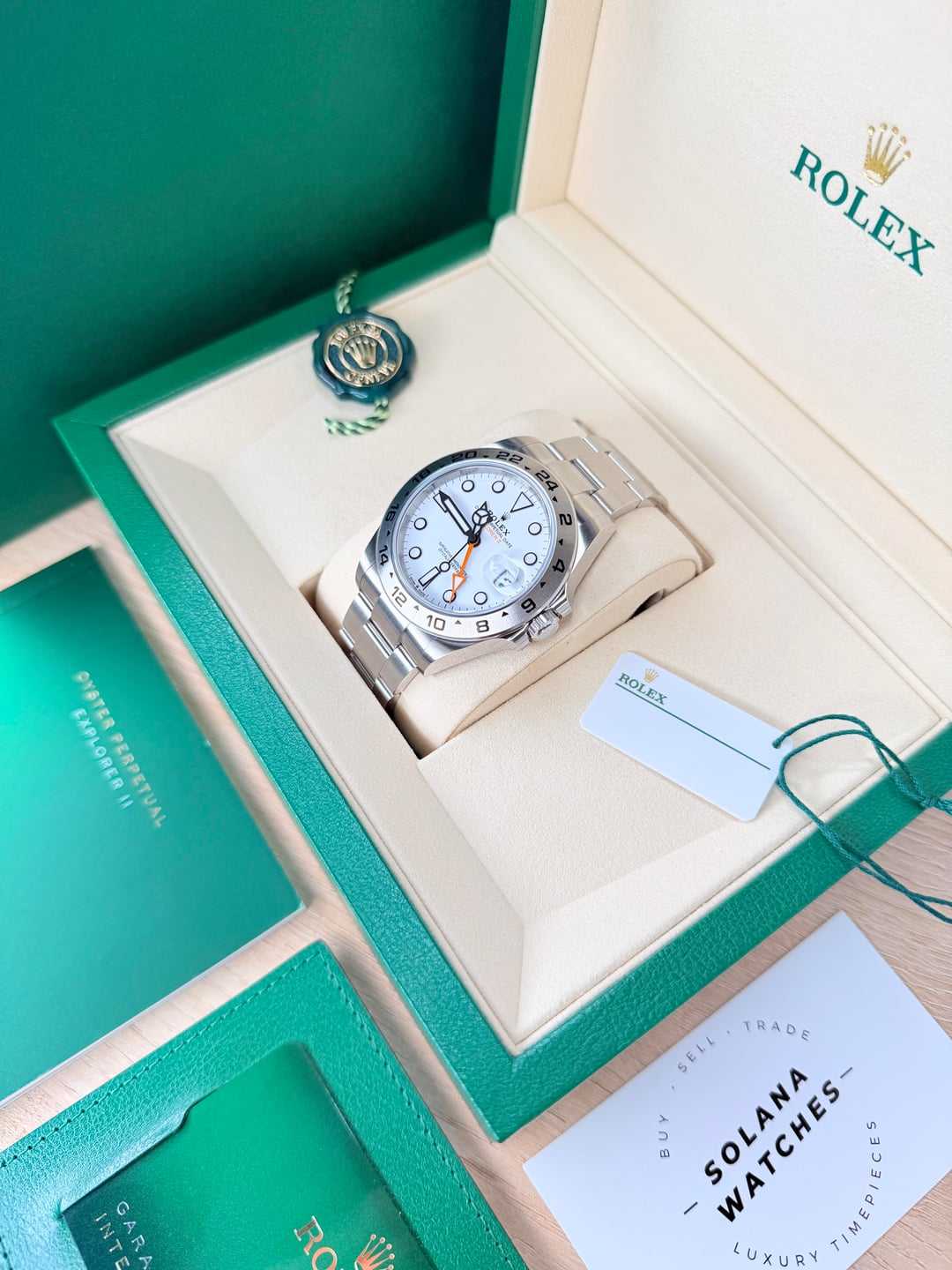 Selling this beautiful brand new Rolex Polar Explorer II reference 226570 . **This Explorer is brand new, unworn.** **It** **comes as a full set**, including the Rolex green box, outer box, booklet, warranty booklet, leather wallet, warranty card dated September 2025, the serialized hangtag, and the green Rolex hangtag. **Photos:** * [Album](https://imgur.com/a/new-sept2025-polar-explorer-s0EKSzM) * [Timestamp](https://i.imgur.com/hS9uiaW.jpeg) * [More on my Instagram @SolanaWatches](https://www.instagram.com/solanawatches/) **Price is $12,700 delivered **in the US. **I am a full-time watch dealer, and I have completed many transactions here. **I can provide additional references upon request. **Feel free to contact me** via PM here so we can exchange numbers and get on the phone or do a video call. You can also [find me on Instagram @SolanaWatches](https://www.instagram.com/solanawatches/). _Private showroom located in San Diego, CA. Reach out to schedule an appointment._ _All my watches are guaranteed 100% authentic, and I will stand by their authenticity. _ _California buyers without a seller’s permit are subject to sales tax._