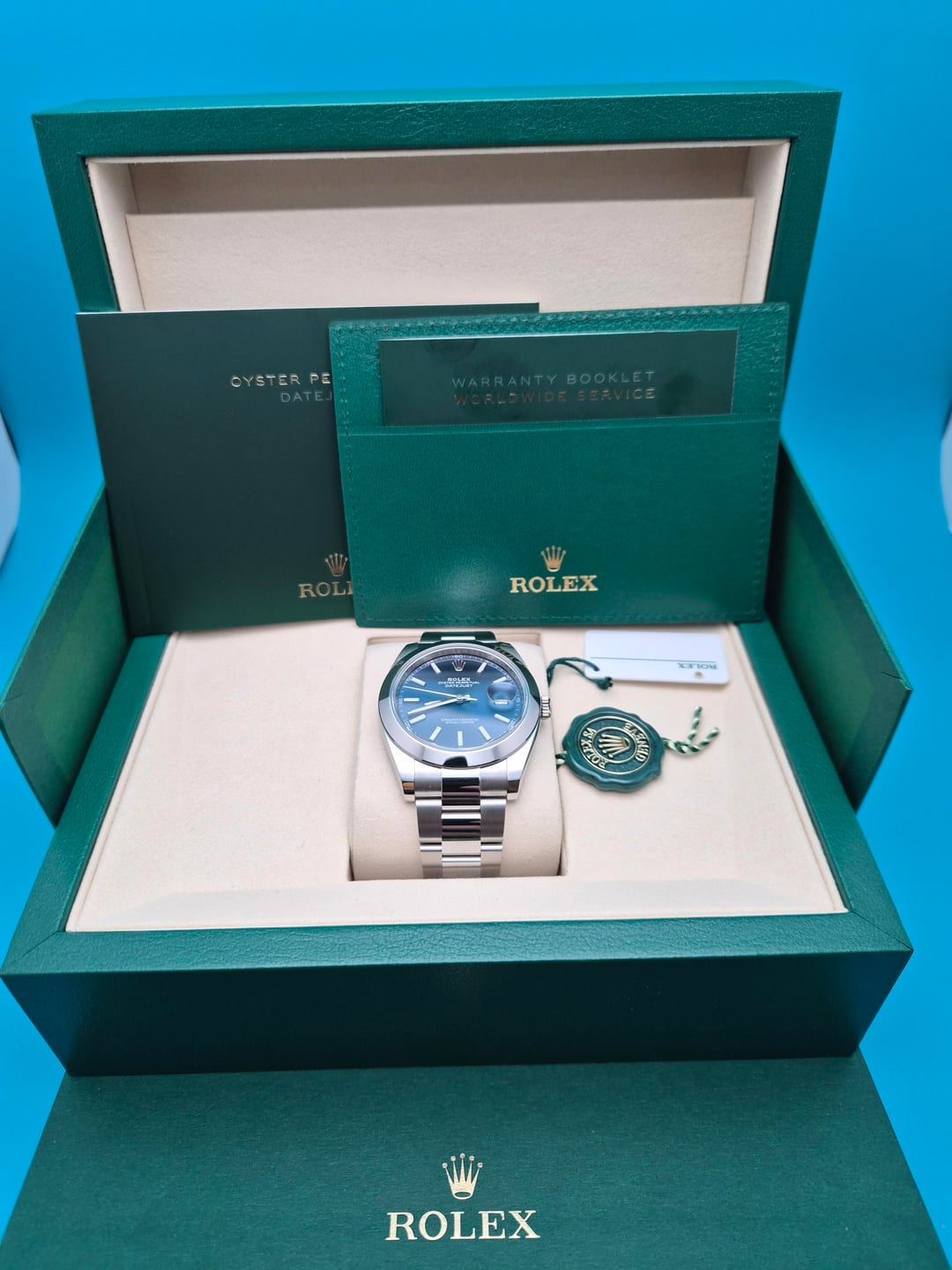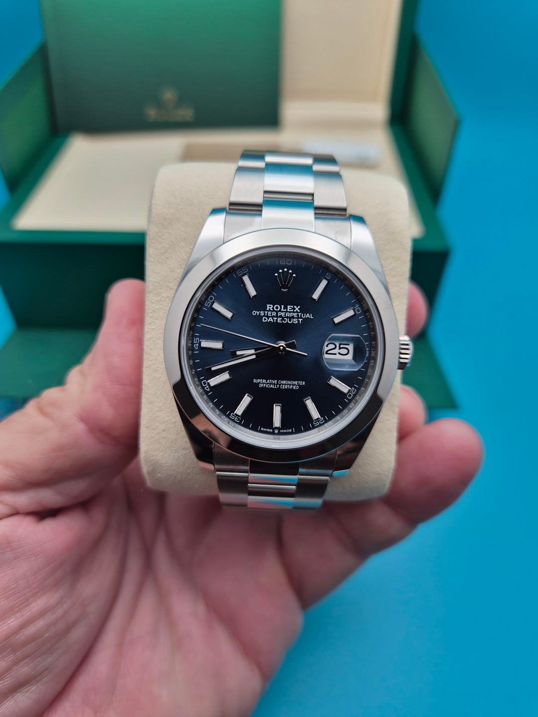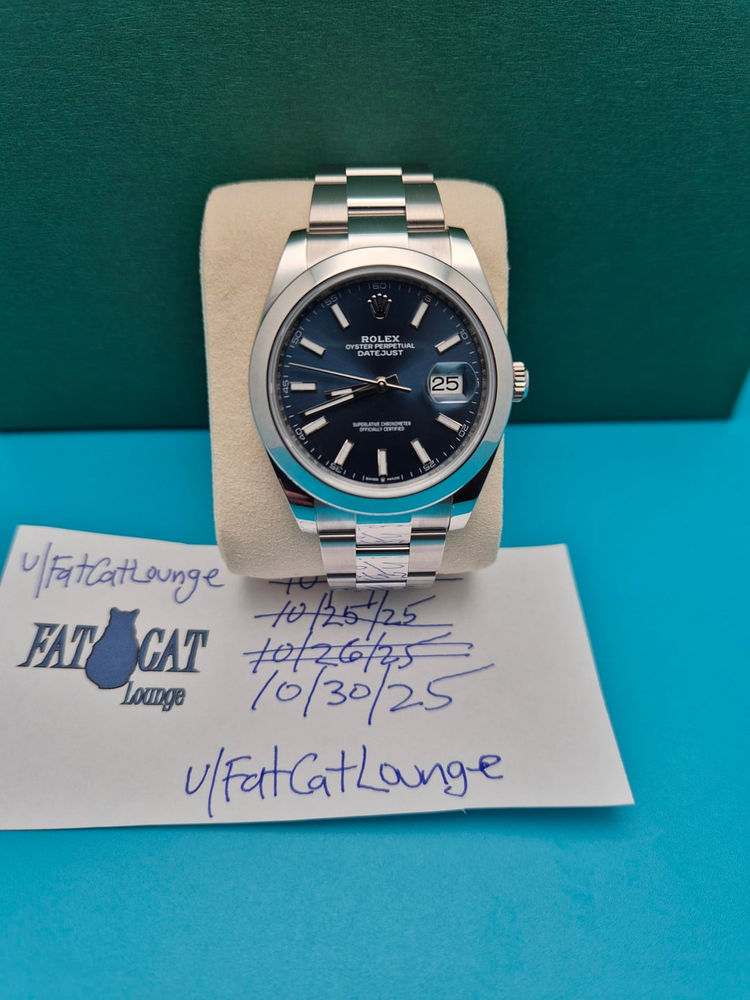 For sale: 2025 Rolex Datejust 41mm, Oyster Bracelet, Reference 126300, Complete Set Condition: New, unworn. Details: Case size: 41mm Bracelet: Oyster bracelet with Oysterclasp Crystal: Scratch resistant saffire with cyclops over the date Bezel: Smooth Dial color: Blue Hour markers: Luminous baton-style markers Movement: Rolex Calibre 3235 perpetual, mechanical, self-winding Power reserve: Approximately 70 hours Functions: Center hands for hours, minutes, and seconds; instantaneous date with rapid setting; stop-seconds for precise time setting. Purchase Date on Warranty Card: September 2025 Price: $11,300 Payment: Bank Wire, PayPal F&F, Venmo F&F, and Zelle accepted. Shipping: Free, insured shipping (signature required) within CONUS. Location: Fernandina Beach, Florida Trades: No trades at this time. All sales are final.