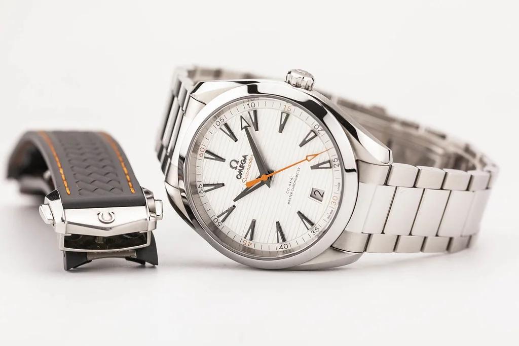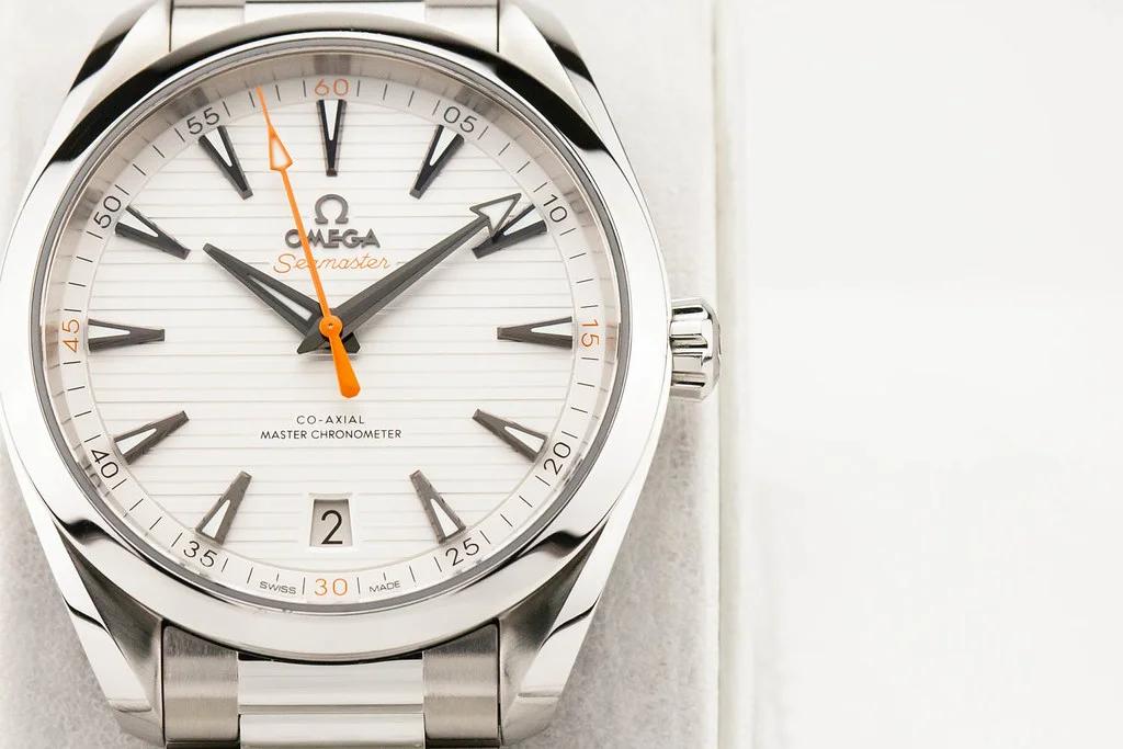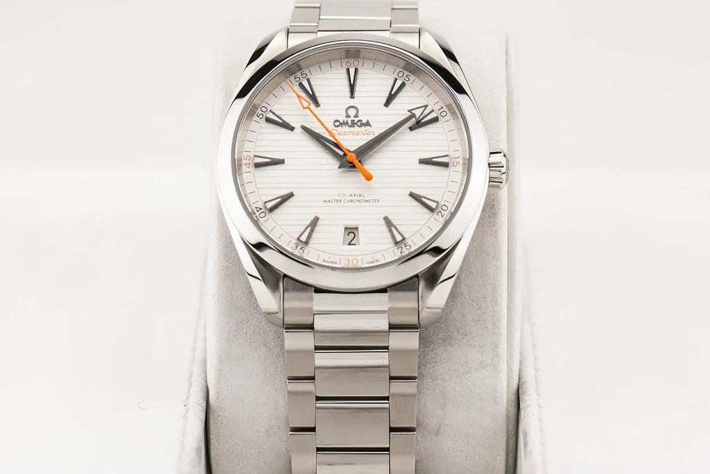 Up for sale is an excellent Omega Aqua Terra 8900 41mm with Silver Dial / Orange Accents on Bracelet, reference # 220.10.41.21.02.001. It comes complete with all boxes, papers, booklets, hang tag, OEM Rubber Strap and Omega Warranty Card dated April 2023.