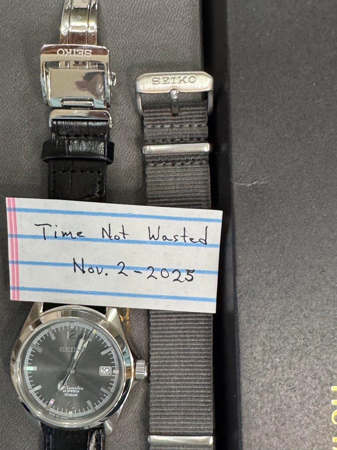 The SEIKO SZSB007 TiCTAC 35th Anniversary Collaboration Automatic Watch is a classic dress/formal timepiece designed for men. Featuring a silver stainless steel case with a smooth silver bezel, this watch has a sunburst gray dial with Arabic numerals and baton indexes. With a date indicator and water resistance up to 100m, this watch is both stylish and functional. The self-winding mechanical 4R movement is keeping very accurate time (~+5 seconds a day), while the leather band adds a touch of sophistication. BONUS: OEM Seiko Nato Strap Priced to SELL: $380 shipped Payment: Venmo or Zelle Buy with confidence. Currently, 159 positive transactions on Reddit and counting. Happy to FaceTime with Seiko in hand.