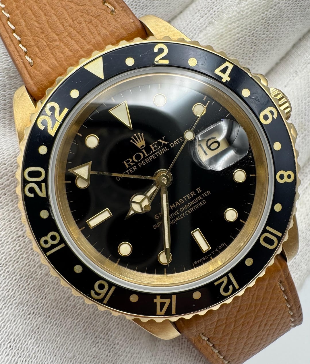 Rolex GMT-Master II Ref. 16718 18K Yellow Gold in excellent overall condition, representing one of the most refined executions of Rolex’s iconic dual-time design. The 18K yellow gold case retains sharp and well-defined lugs, possibly polished in the past but done to precise Rolex standards. The original black tritium dial is beautifully preserved, paired with matching yellow gold tritium hands that have developed a warm vintage tone. Its black bezel insert remains in very good condition, showing only light wear consistent with age. The movement was professionally serviced in October 2025 and runs perfectly, with a successful pressure test to 3ATM (30m). All case engravings are crisp and fully legible, with the serial number prefix “N” dating the watch to approximately 1991. Fitted on a new handmade 20/16mm brown leather strap with a gold-plated Rolex buckle, this piece offers a striking combination of sophistication and vintage appeal — a standout example of the GMT-Master II crafted entirely in 18K gold. **Reference:** 16718 **Size:** 40mm **Year:** 1991 📜 Includes: Custom [travel pouch](https://bogossia.com/products/travel-carrying-case) ($50+ value) 💵 Price: $17,100 + FREE overnight shipping with FedEx fully insured. [Timestamp](https://imgur.com/a/ZB2MPwe) 🔥 Follow us on [Instagram](https://www.instagram.com/bogossiajewelers) 📍 Location: New York 🔒 Authenticity: 100% guaranteed, buy with confidence. We have 150+ reviews on Chrono24 with 180+ transactions, and Excellent rating score on Trustpilot. Visit our [profile](https://www.reddit.com/u/BoghossianJewelry/s/vm81HAdB7o) for links and references. 📦 Domestic Shipping: Ships with FedEx overnight, within 24 business hours of payment, from New York, NY to CONUS. The shipment is fully insured against damage, loss or theft. 🌍 International Shipping: Incurs an additional $100. 💳 Payment: PayPal/CC (+4%), Web, or Face-to-face deal in NY. 🔐 [Seller References](https://bogossia.com/authenticity) 🔗 [Other Listings](https://www.reddit.com/u/BoghossianJewelry/s/vm81HAdB7o) 📸 [IG: @bogossiajewelers](https://www.instagram.com/bogossiajewelers)