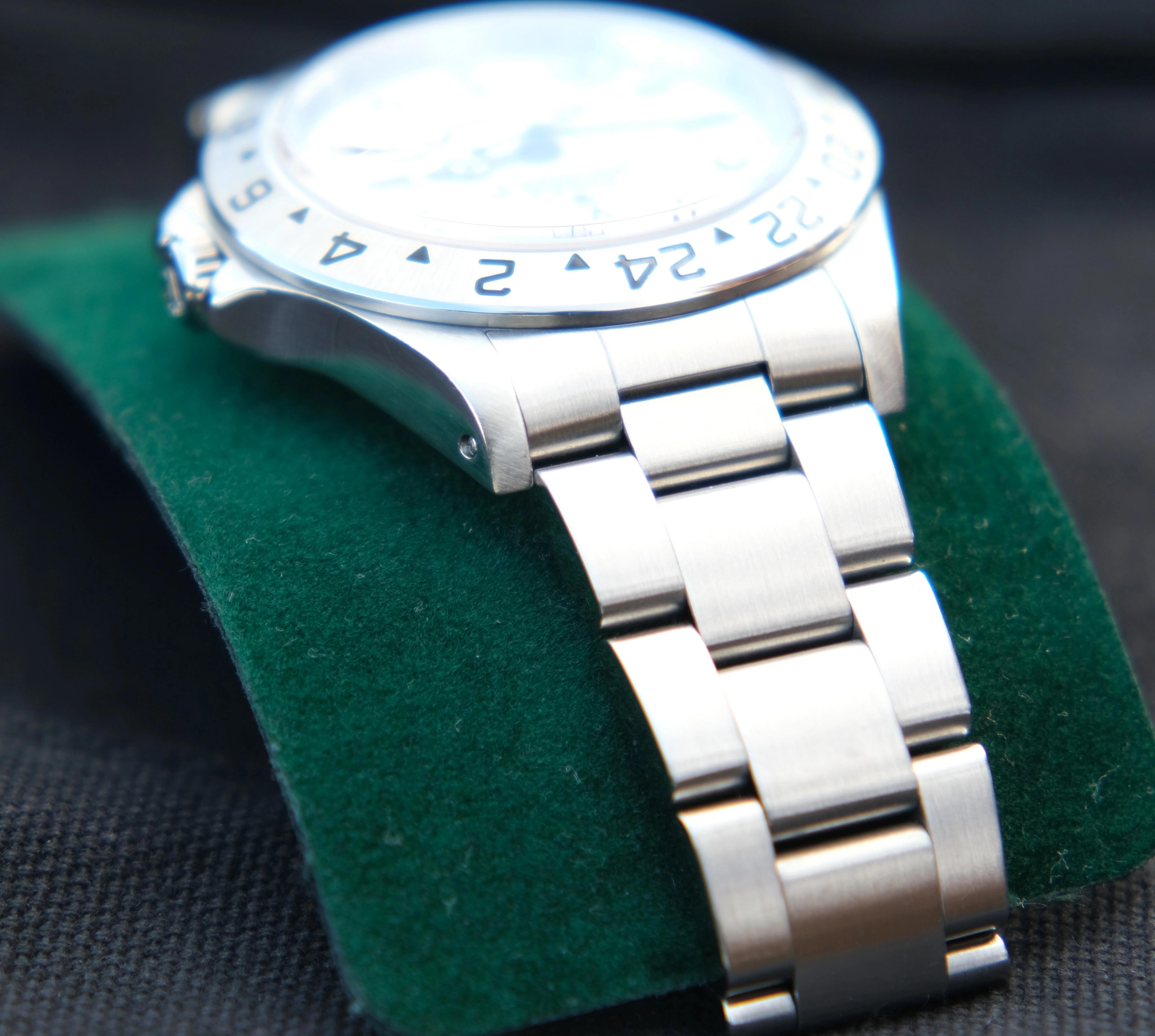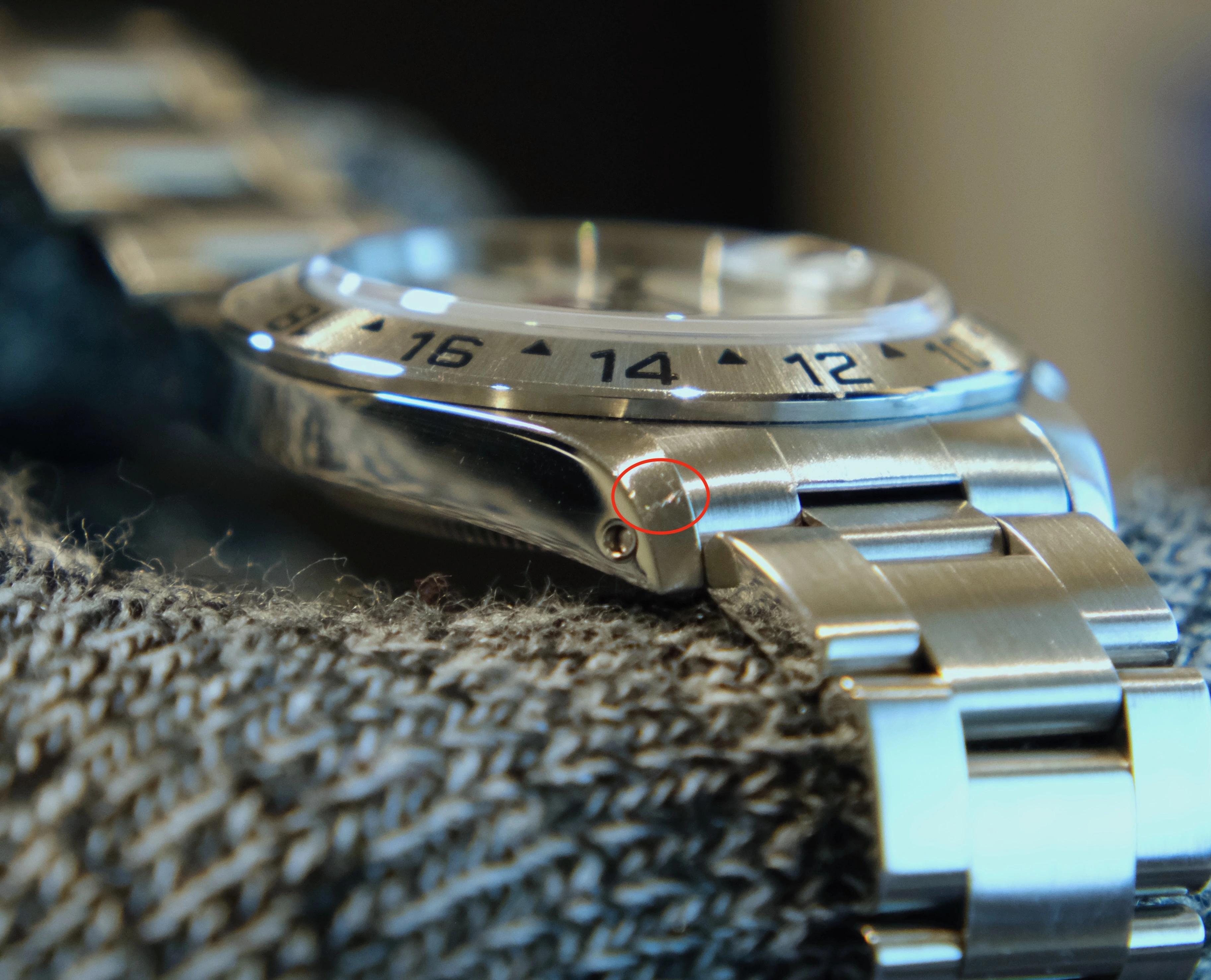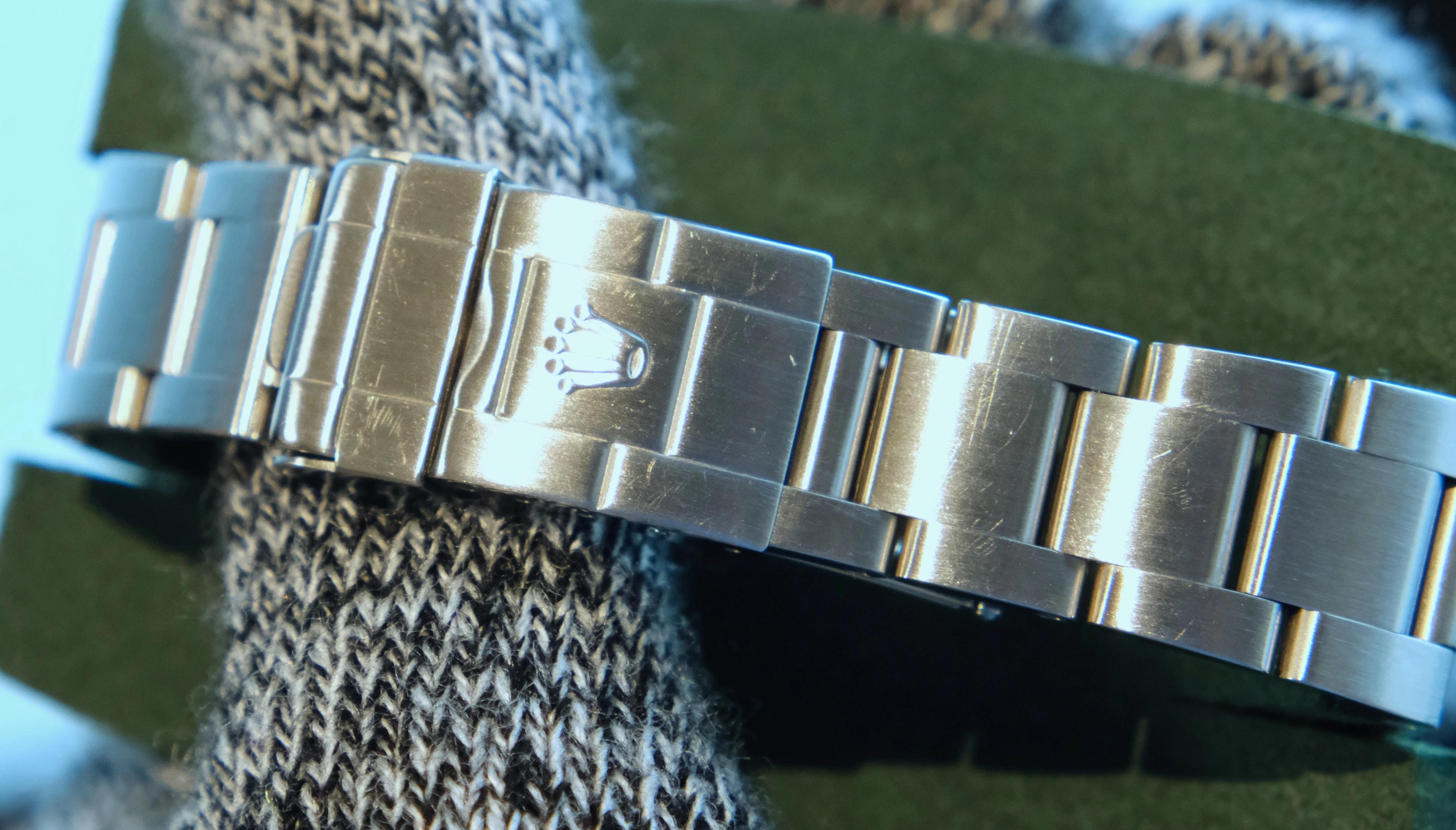 The watch is in overall good condition with light scratches on the case, bezel, and bracelet. The scratches a very superficial and could be removed with the lightest of polishes should one choose to do so. The most noticable scratches (as demonstrated in the pictures below) are one the undersides of the lugs (from strap changes), on the top of the lug at 7 o'clock, and on the edge of the bezel near the 12 hour marker on the 24 hour scale. There are no signs of wear on the crystal that I can see. As the pictures show, the lugs are still thick and the spring bars do not come close to poking through the drilled lug holes. Although I will not guarantee accuracy (though Rolex does until May of 2026), the watch averages +1 sec/day on my wrist.