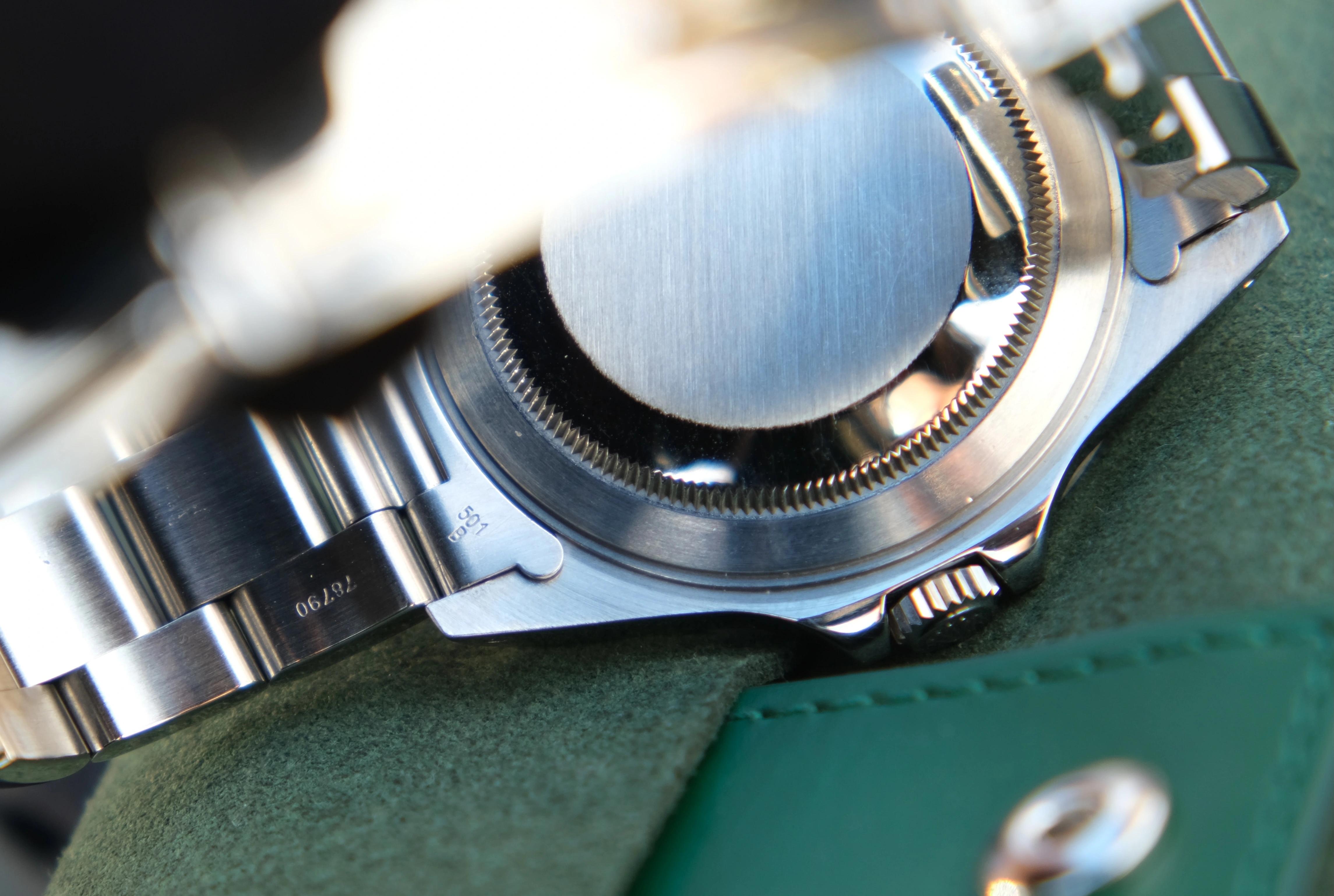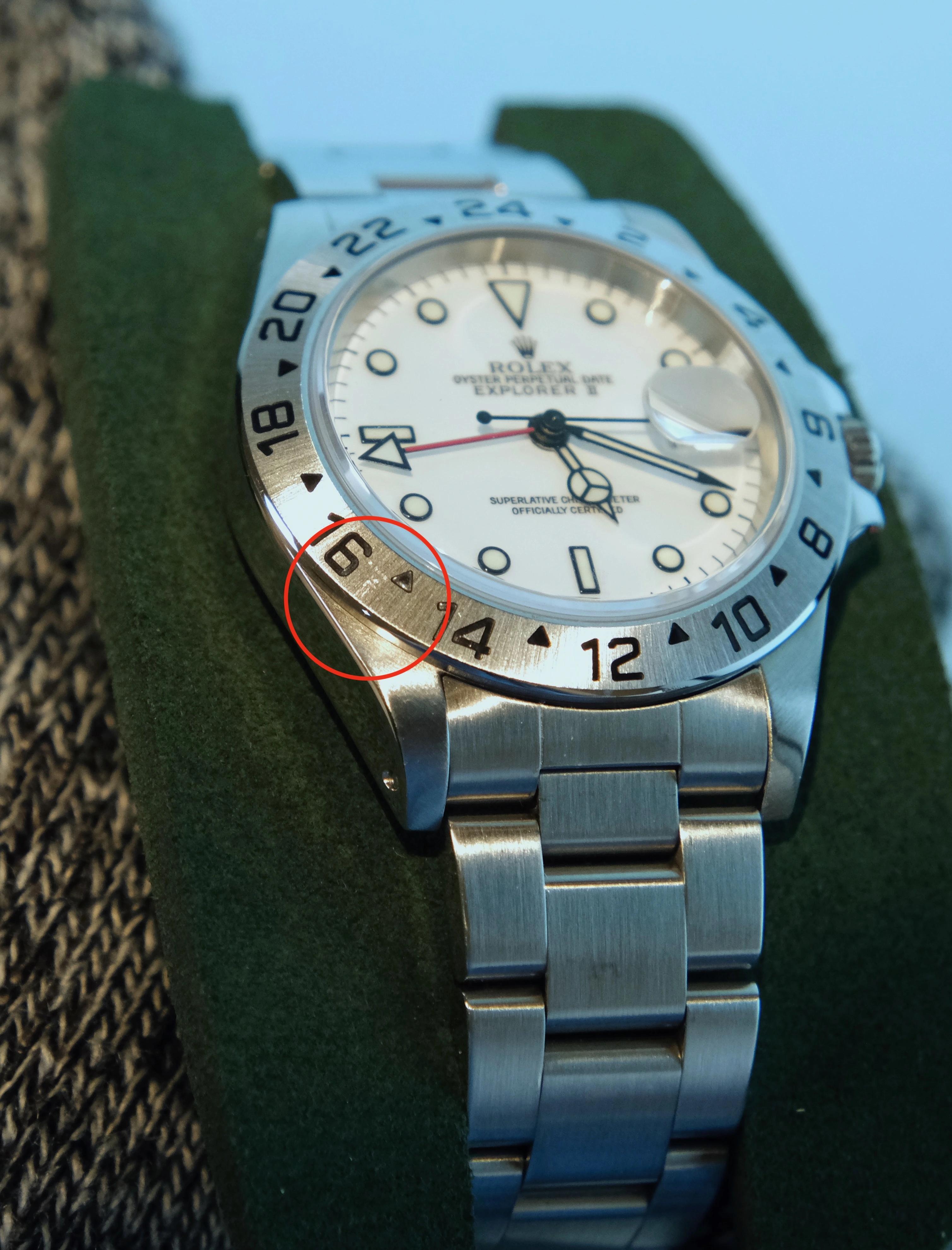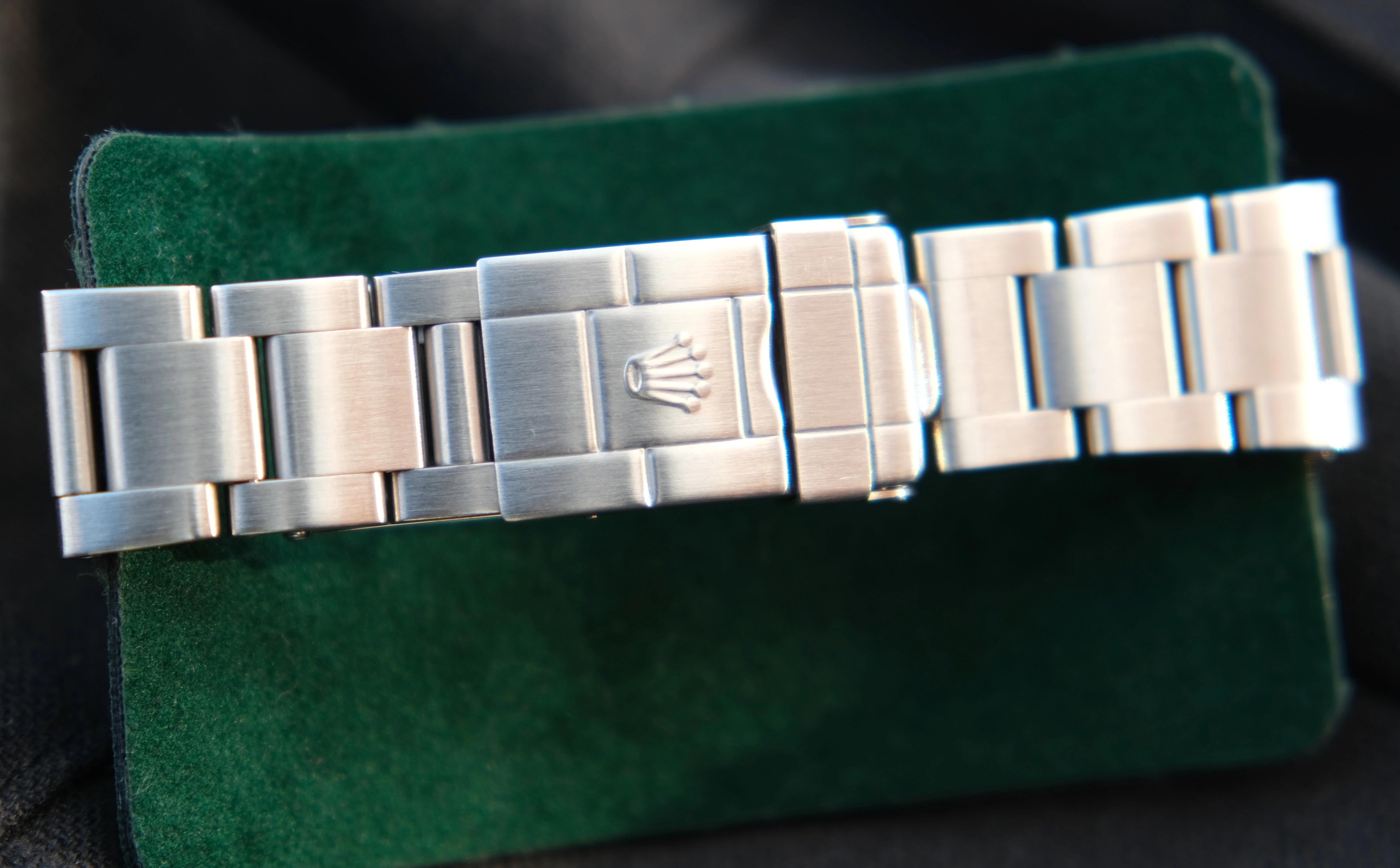 The watch is in overall good condition with light scratches on the case, bezel, and bracelet. The scratches a very superficial and could be removed with the lightest of polishes should one choose to do so. The most noticable scratches (as demonstrated in the pictures below) are one the undersides of the lugs (from strap changes), on the top of the lug at 7 o'clock, and on the edge of the bezel near the 12 hour marker on the 24 hour scale. There are no signs of wear on the crystal that I can see. As the pictures show, the lugs are still thick and the spring bars do not come close to poking through the drilled lug holes. Although I will not guarantee accuracy (though Rolex does until May of 2026), the watch averages +1 sec/day on my wrist.