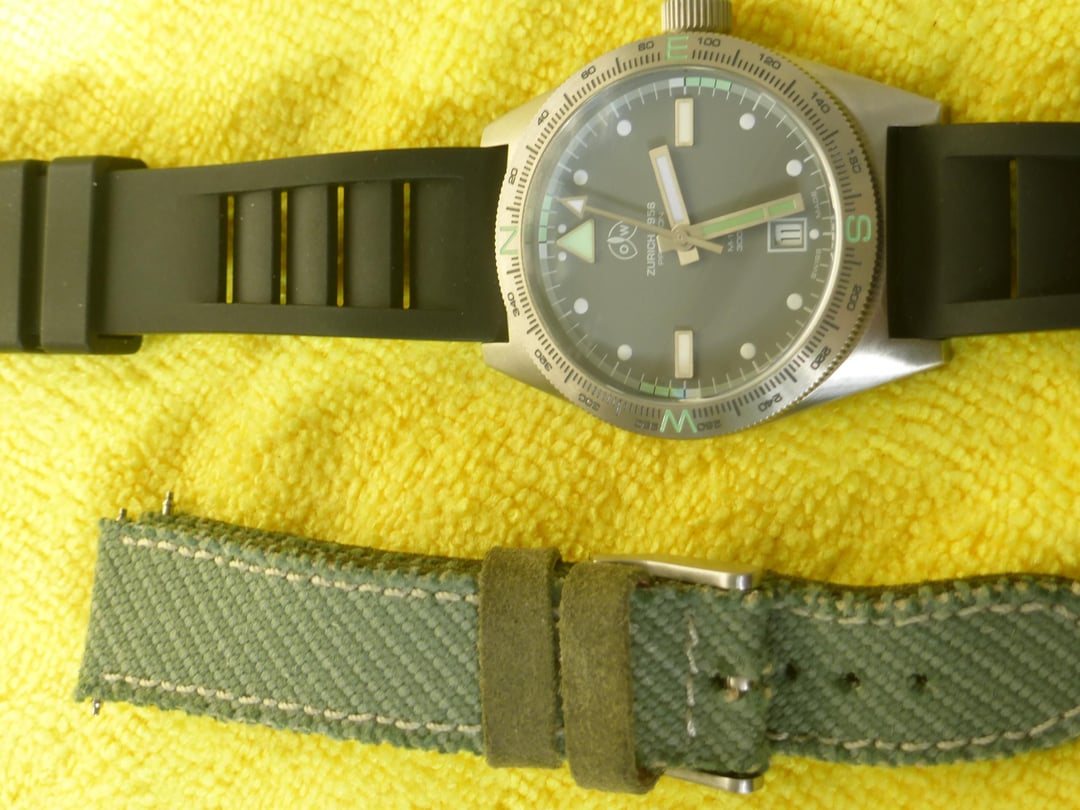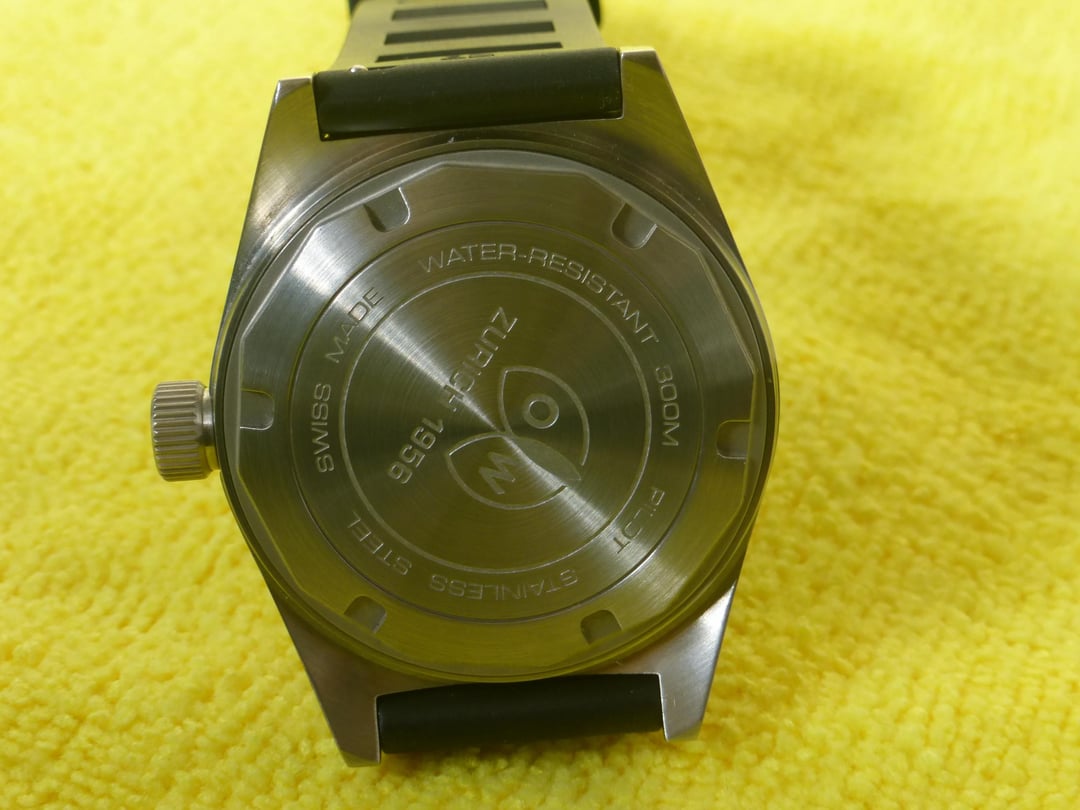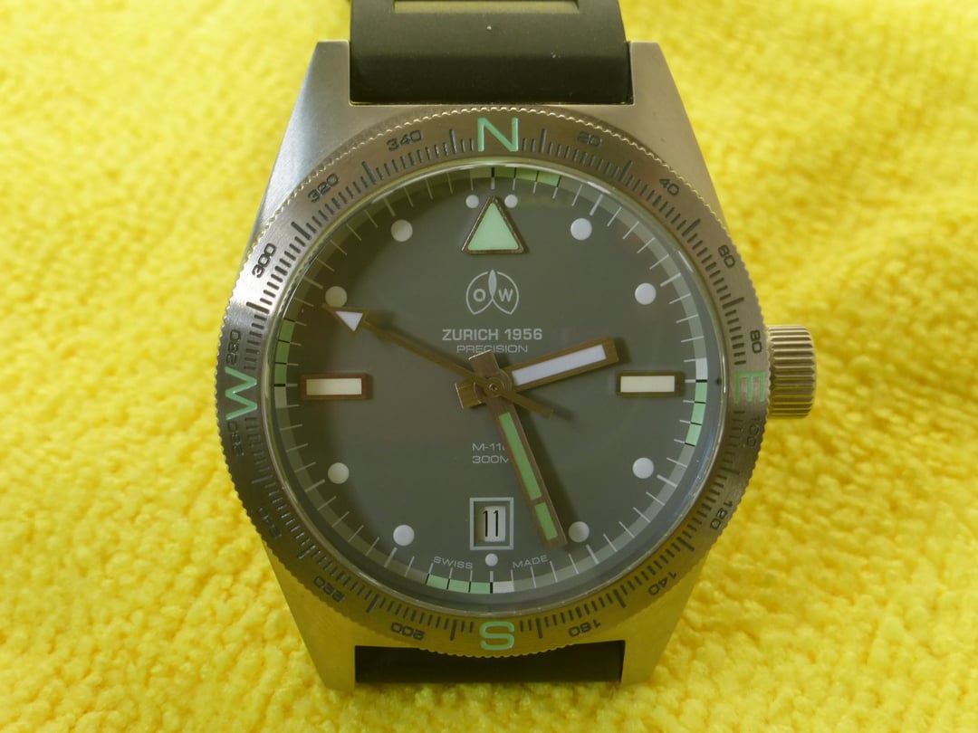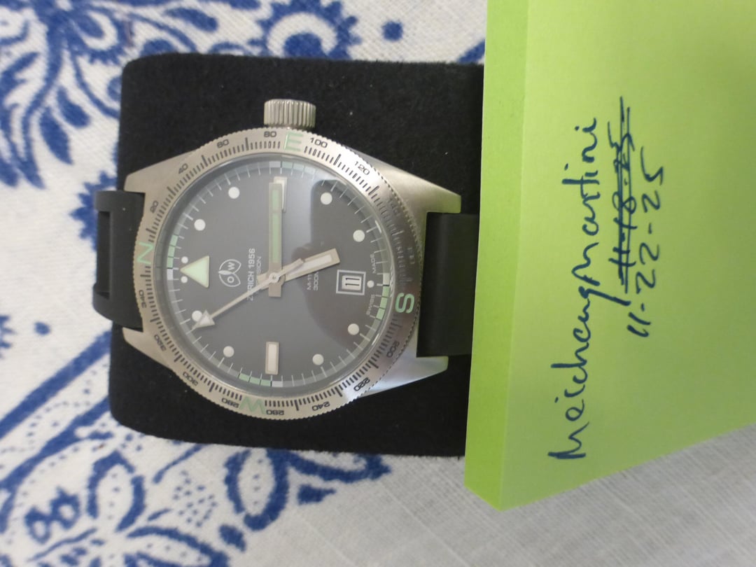 Excellent condition Ollech & Wajs M-110 AS. Comes with original distressed green Swiss military surplus fabric strap and a new black FKM rubber strap. 40mm case size, 12.5mm thick, 20mm lug width with drilled lugs. Bi-directional rotating bezel. 45.7mm lug to lug. 300M water resistant. Swiss Made, Date window at 6. Soprod automatic Swiss movement. Navigational bezel with N, W, E, S markings. Works great, no issues. Includes box and blank warranty card. New retail was about $1600 but I don’t believe these are currently available. Asking $900 shipped in the continental US, not interested in trades at this time.