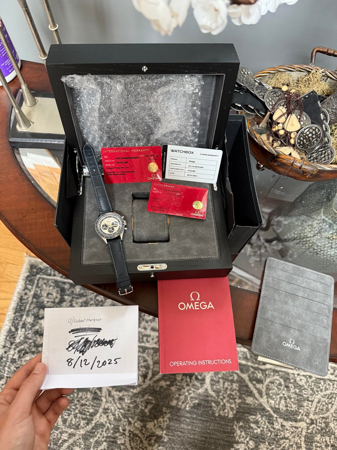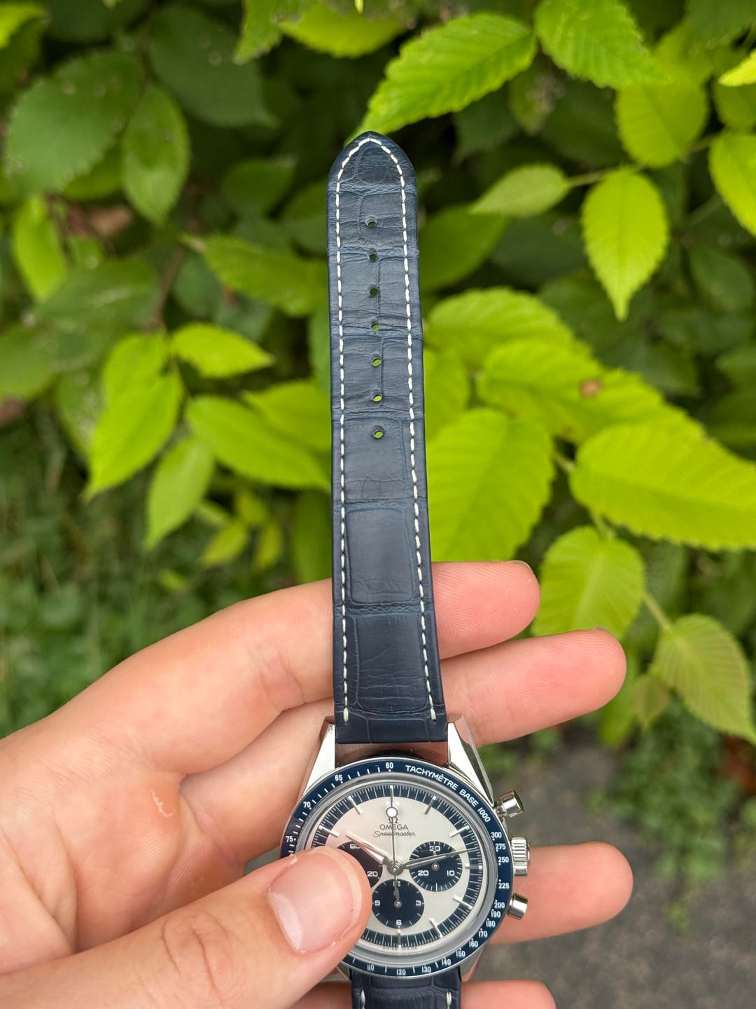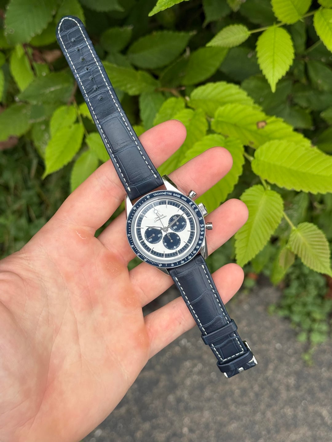 Omega Speedmaster Anniversary Chronograph 'Blue Panda' CK2998 // CK 2998. 40mm stainless steel case, opaline silver dial with blue subdials, on factory blue omega leather strap with buckle. Manual winding OMEGA calibre 1861. Reference 311.33.40.30.02.001. One of the most striking modern Speedmasters released by Omega. Features "lollipop" chronograph seconds hand that is reminiscent of the original CK2998 model first released in 1959. A modern classic. Complete set with outer box, inner box, instruction manual, card sleeve, international warranty card and pictograms card. Also includes the card from WatchMax Extended warranty. Watch and strap are in amazing condition as shown in photos! Watch has barely been worn, and everything on this piece functions well as it should. Thanks for looking! Asking for $6,995 Shipped or best offer to the CONUS! This is one of the lowest prices i’ve seen online for this mode, Send me cash offers if you have them. Zelle and bank wire preferred. Paypal f&f available for clients with strong transaction history here on the sub. Please message me with any questions you may have!