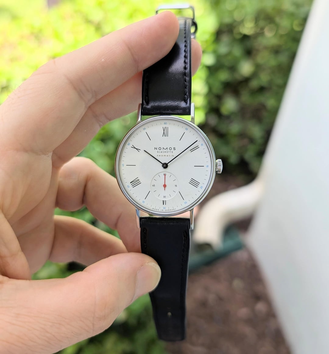 **Nomos Ludwig Neomatic model 282, complete with box and papers** **Size** \- 36.5mm, lug to lug is 46mm **VERY THIN** for an automatic watch, only **7mm** thick Galvanized white silver-plated dial with black numerals; small minute markers in the outer track in cyan blue In-house, well-finished, automatic DUW 3001 movement. Skeletonized rotor, blued screws, etc. Nomos shell cordovan black strap (has a horizontal crease on the long side by one of the holes) Rated water resistance - 50m Excellent condition. Warranty card dated Sept 29 2022. **Price**: $2075 shipped in US (list price is $3660). Paypal F&F or Zelle. Not looking to trade.