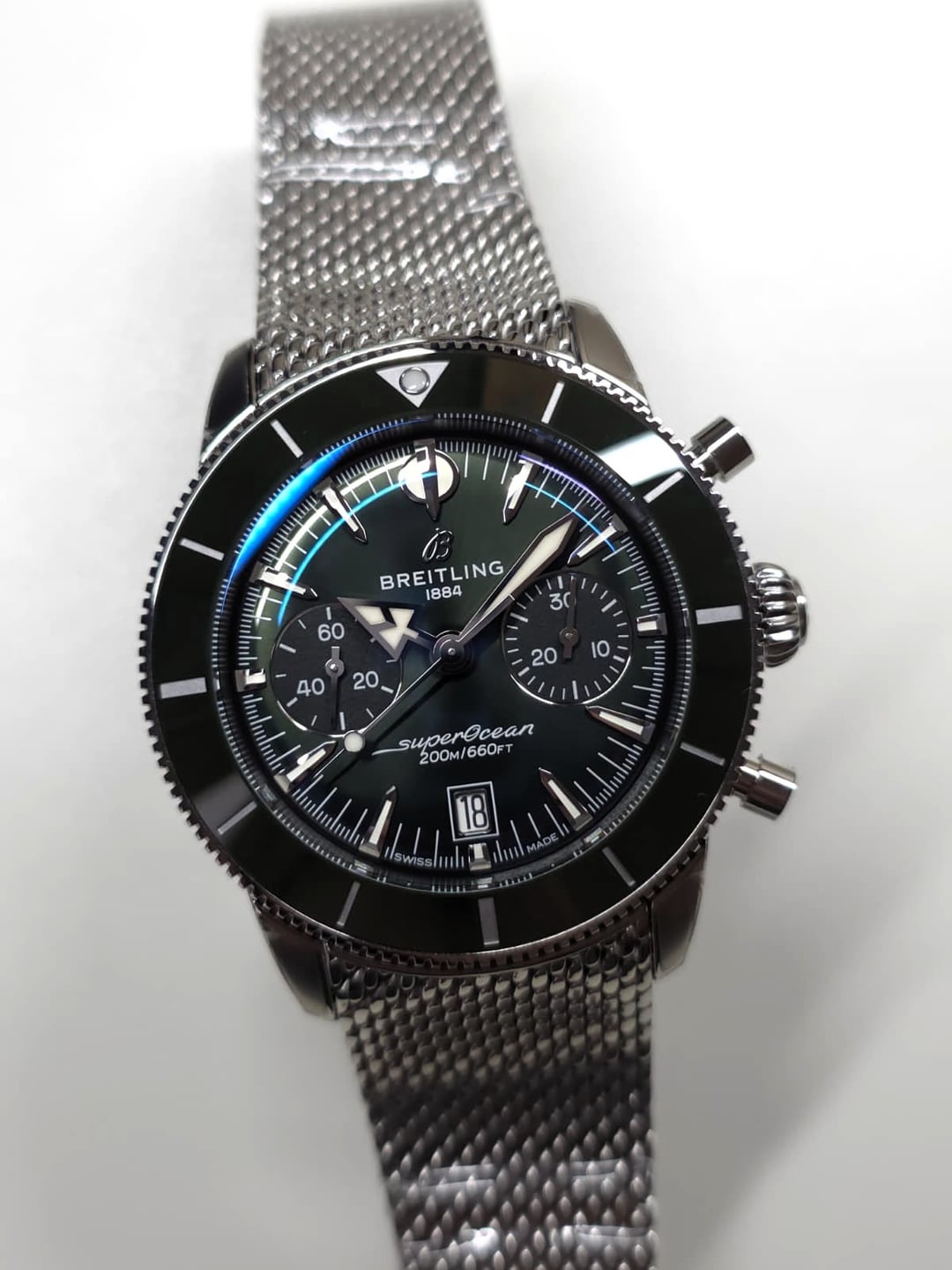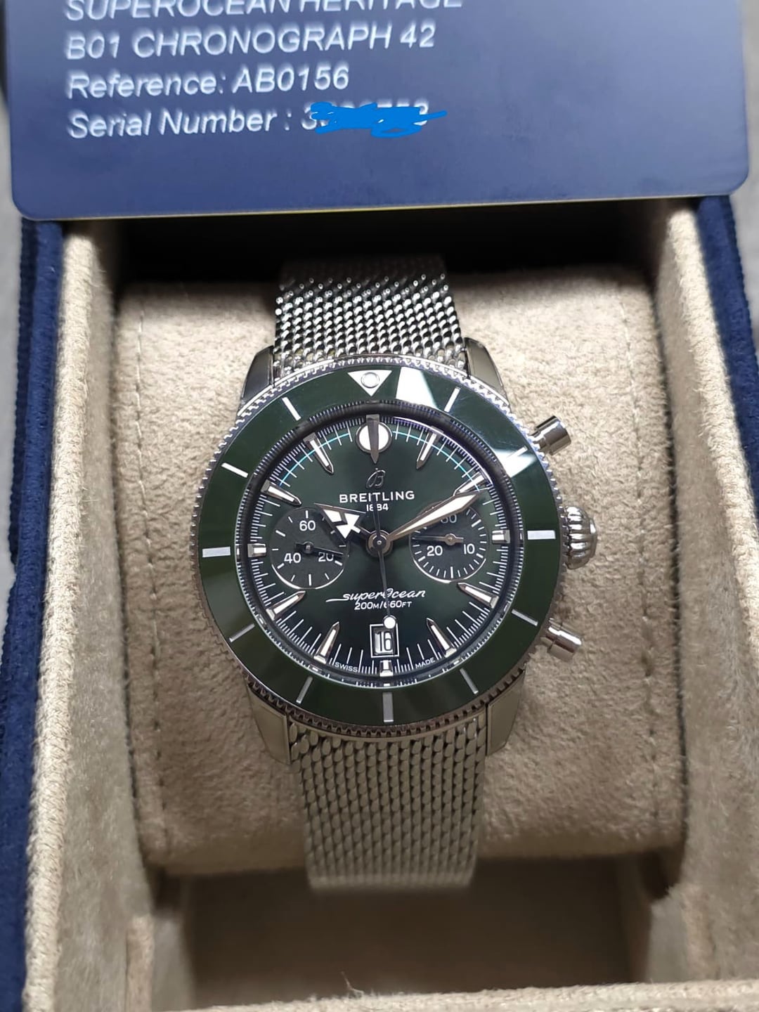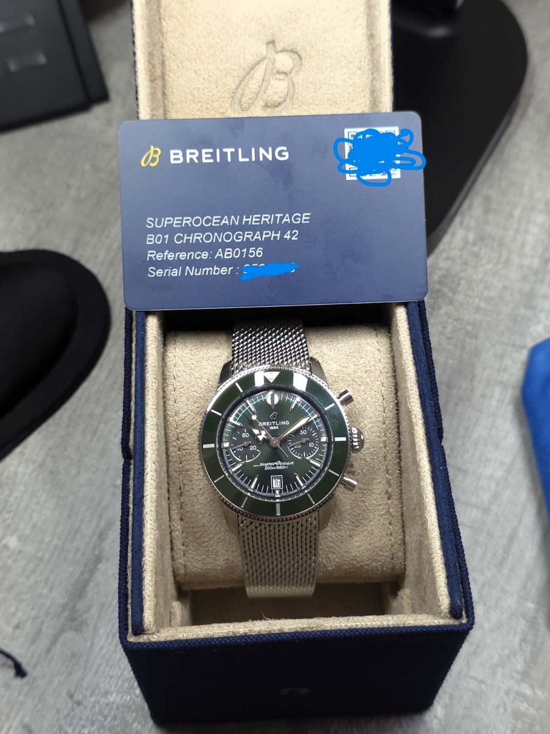 **Breitling Superocean Heritage Green Dial (42mm)** **Ref: AB0156** Have a beautiful example here of the 42mm Superocean Heritage featuring the striking green dial. The watch remains in *like-new* condition — fully unsized and still retaining all factory stickers throughout. It comes as a **complete set** with box, warranty card, and an **extended Breitling international warranty valid through August 8, 2030**, as shown. This model houses Breitling’s in-house **B01 chronometer-certified movement**, known for its precision and 70-hour power reserve. The green dial variant has become increasingly sought after among collectors, offering a modern twist on a timeless heritage design. Pics & Timestamp - [https://imgur.com/a/x0UnnRB](https://imgur.com/a/x0UnnRB) Price = $5,750 shipped IG = watchfonia Cheers, Adam