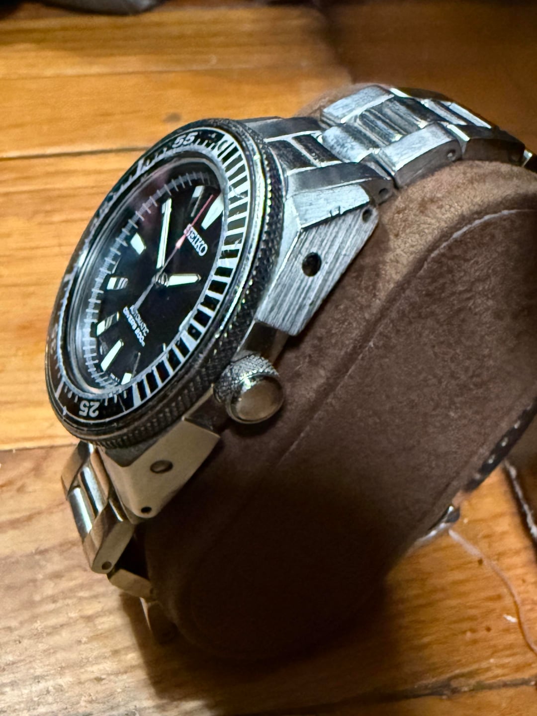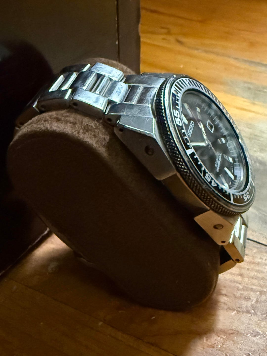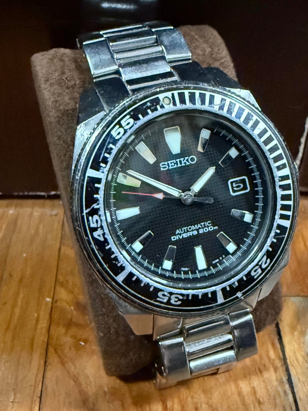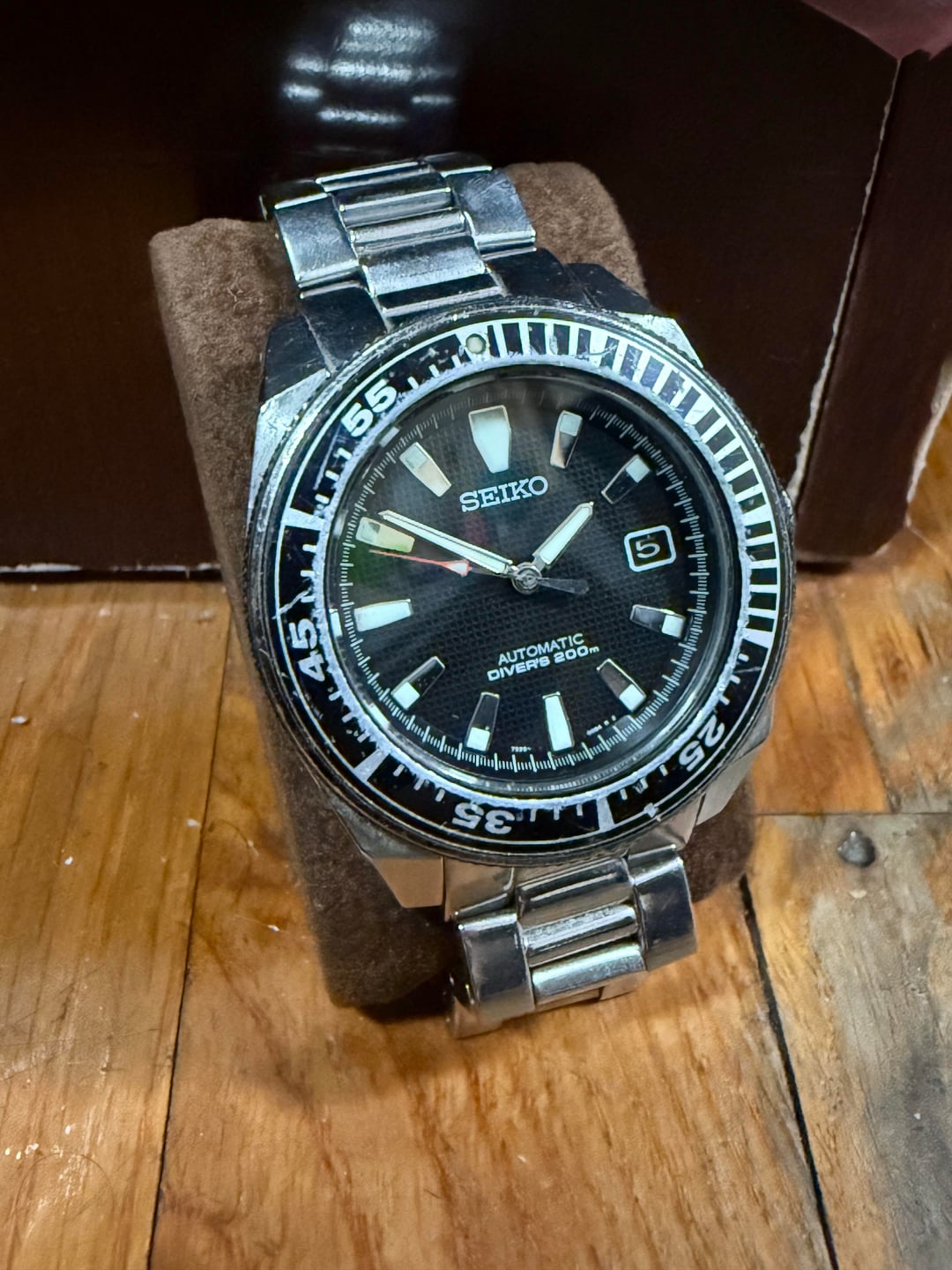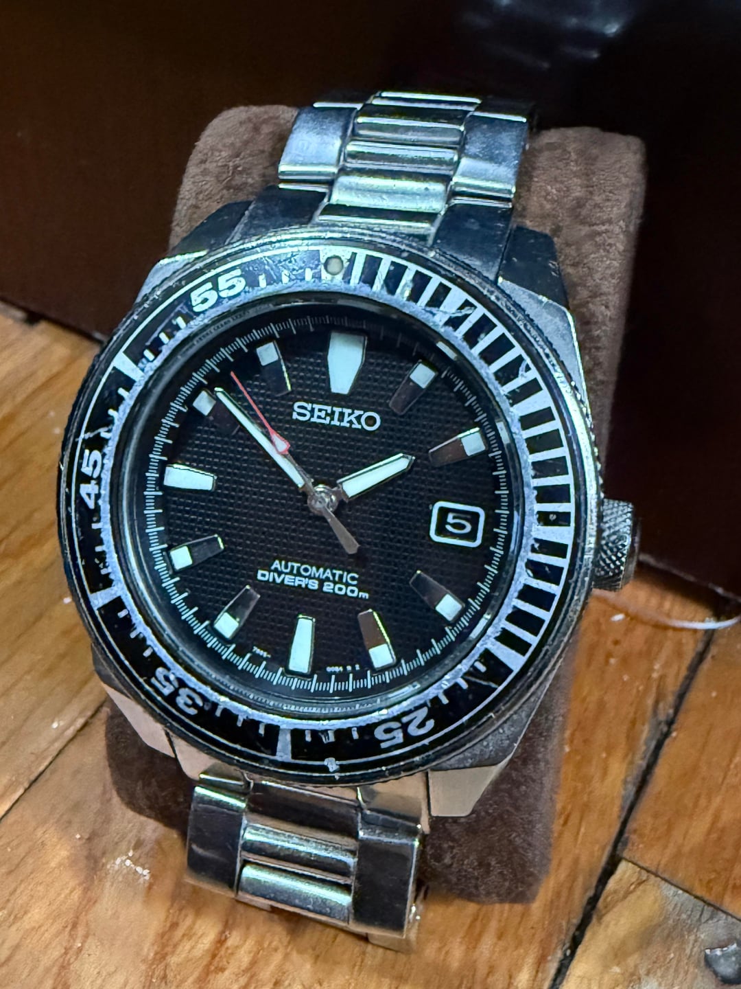 Up for sale is this awesome Seiko 1st generation samurai. This thing is a tank, it is a bigger watch but looks awesome on wrist, bracelet is original and fully linked (~8 inches or so) and the watch is in overall great condition and keeps great time. The crystal and dial are very clean, and case and bracelet have minimal wear. The bezel does have quite a few scratches on it, but the bezel is still firmly in place and turns with expected smoothness and clicks. Asking 260 SHIPPED through Paypal FF/Zelle, shipping anywhere in CONUS!