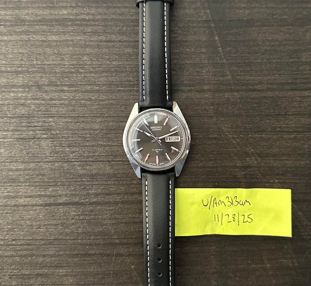 For sale is this beautiful vintage Seiko automatic 7006-8007. This piece was built in March 1974 and is in excellent overall condition. The 7006 automatic movement features a day/date function. The charcoal grey dial is in perfect condition. The hands are great shape with a couple of blemishes on the minute hand as shown in the photos. The crystal is in great condition with only a few thin, small scratches that were hard to capture in the photos. The stainless steel case is in great shape with a handful of wear marks typical for its vintage age. The case measures 37 mm and 18 mm between lugs. Service history unknown, but the movement is clean and keeps good time at around -15 seconds per day on average. Comes with brand new leather strap in photos. Asking $125 which includes CONUS shipping. Prefer Zelle, CashApp, or Venmo. Happy to answer any questions. Thanks for looking!
