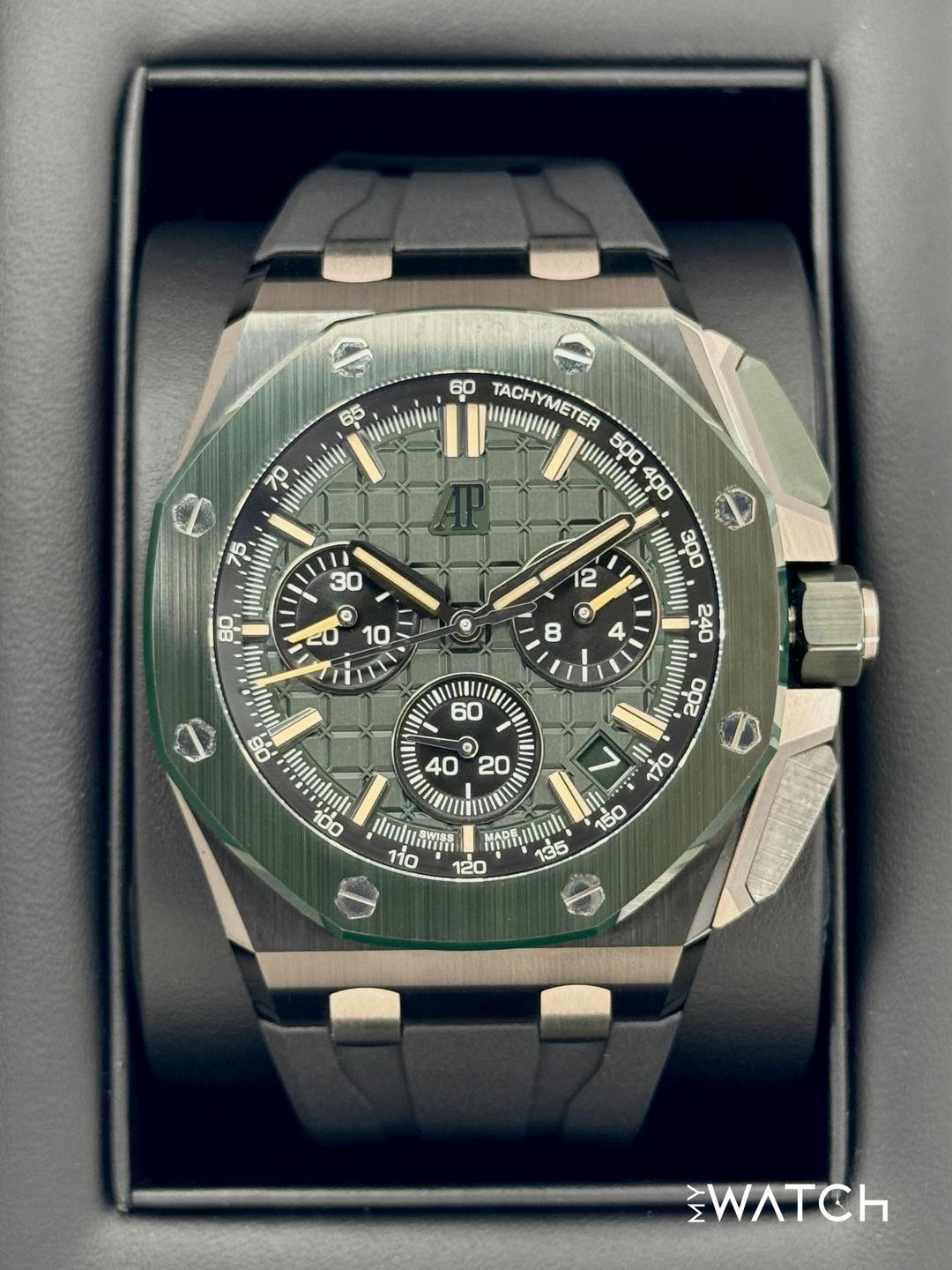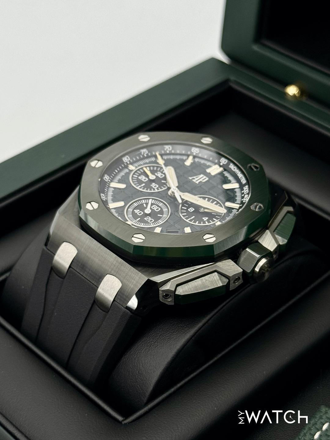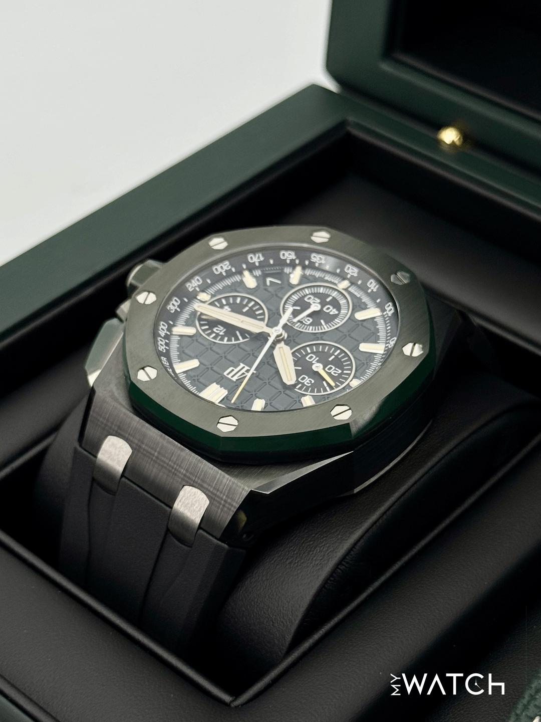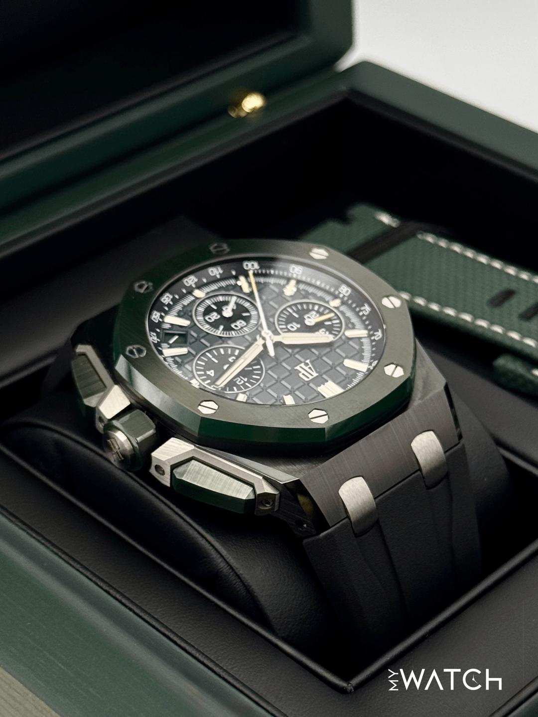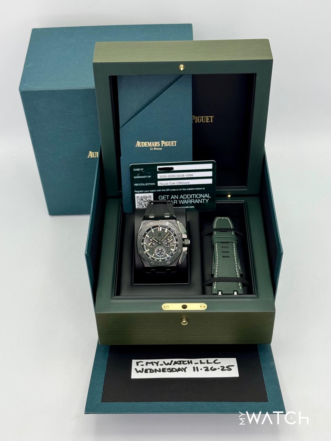 🔵**NEW 2025 Audemars Piguet Royal Oak Offshore Selfwinding Chronograph 43mm 26420CE Ceramic Green Dial** 🔵**TRADE or SELL us your luxury watch, all brands considered. Message me details.** **Includes the following:** **✔️Original Audemars Piguet Double boxed** **✔️Box and Papers - Yes** **✔️International Warranty card** **✔️Size: Adjustable Black Rubber Strap** **✔️Additional Green Textile strap included** **✔️Reference #: 26420CE.OO.A063VE.01** **✔️Watch is BRAND NEW/UNWORN** **✔️**[**Trades**](https://mywatchllc.com/pages/sell-rolex-watch) **welcome** Business Name: **My Watch LLC** LOCATION: Oak Park, Michigan ✔️[MyWatchLLC.com](http://mywatchllc.com/) for current inventory ✔️Google Business Listing [https://g.co/kgs/Cmd6FPW](https://g.co/kgs/Cmd6FPW) ✔️Business Hours M-F 9-6 ✔️Facetime/Video chat/calls welcome to view the watch interested. ✔️Contact: 248-422-0909 via text or call for quickest response. 🟢TERMS: Visit [MyWatchLLC.Com](http://mywatchllc.com/) for payments accepted 🟢REFERENCES/REVIEWS: We are well reviewed on all platforms from google, trust pilot, rolexforums, additionally we have 300+ reference in multiple FaceBook watch groups, reference checks welcome. 🟢SHIPPING: If you are not local, we offer Fully Insured FedEx overnight shipping in the USA for a fee. International shipping available.