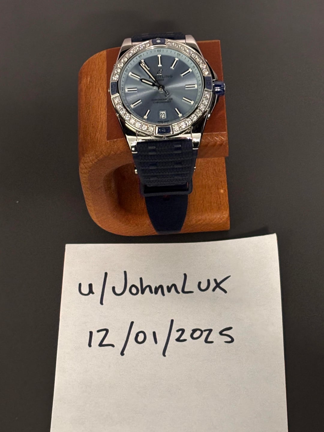 Up for sale is my 2024 Breitling Super Chronomat Steel Diamonds A17356531C1S1. The watch is pre-owned and in very good condition with no issues to note. It’s running exactly as it should and was checked on a timegrapher for peace of mind. It comes as a complete set with the outer box, inner box, papers, and the Breitling warranty active through December 2028. The price is $6,480 shipped and fully insured anywhere in the continental United States. I’m open to trades. If you have something in mind, please include clear photos, what it comes with, and the value you’re placing on your piece so I can take a proper look. Any dust in the photos is from handling. The macro camera picks up things the eye usually misses. Feel free to message me with any questions or if you need specific shots. Thanks for taking a look.