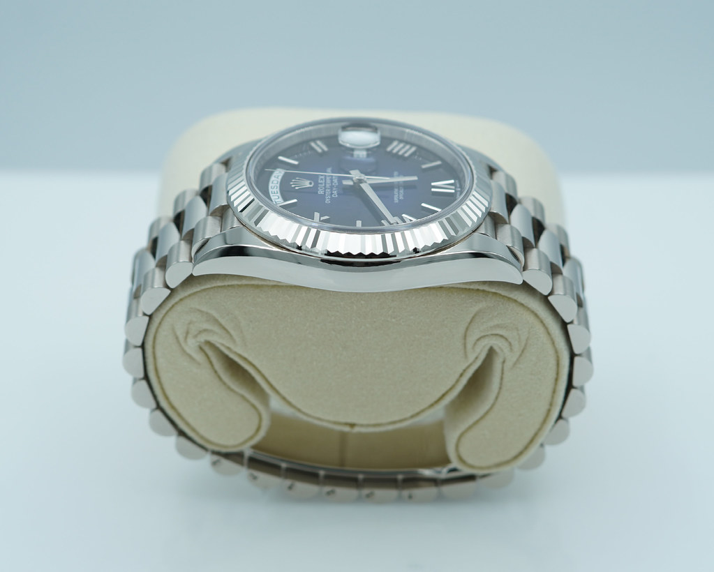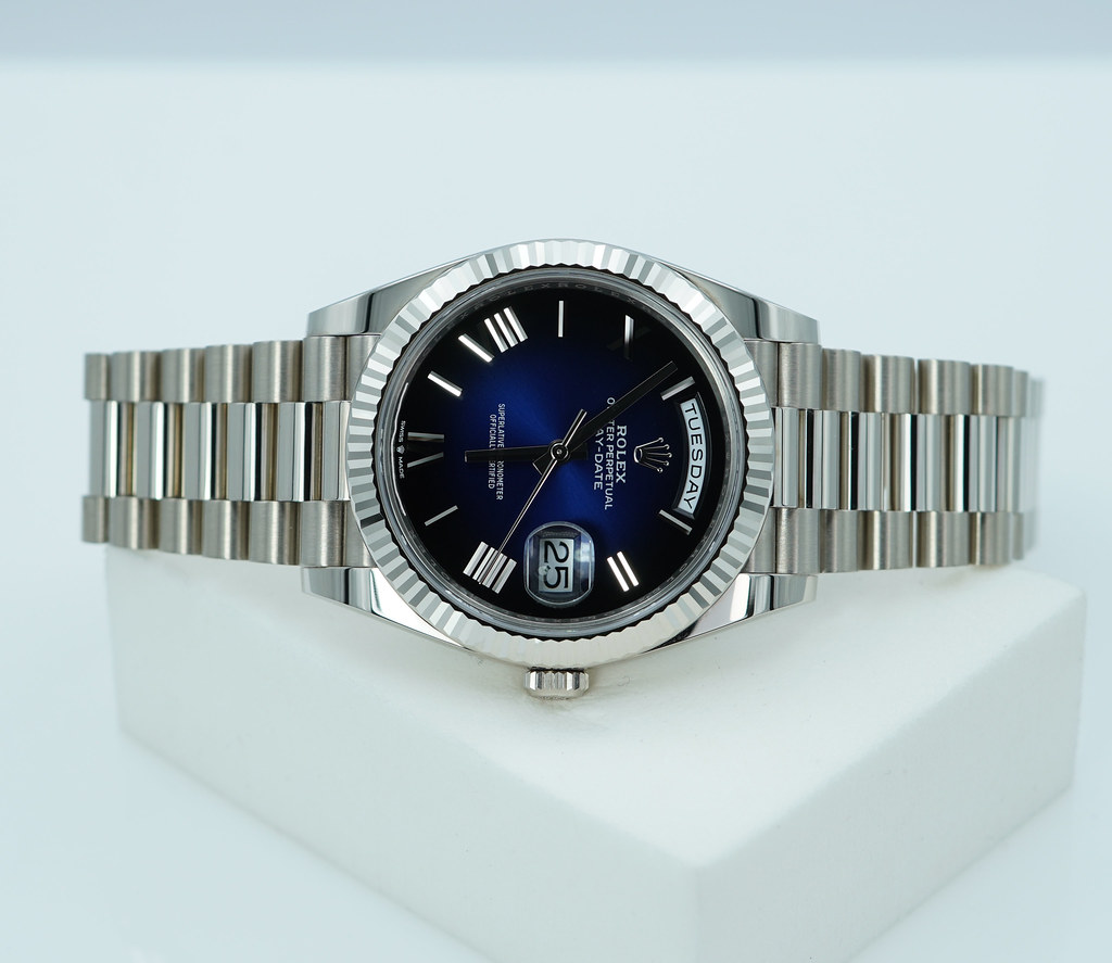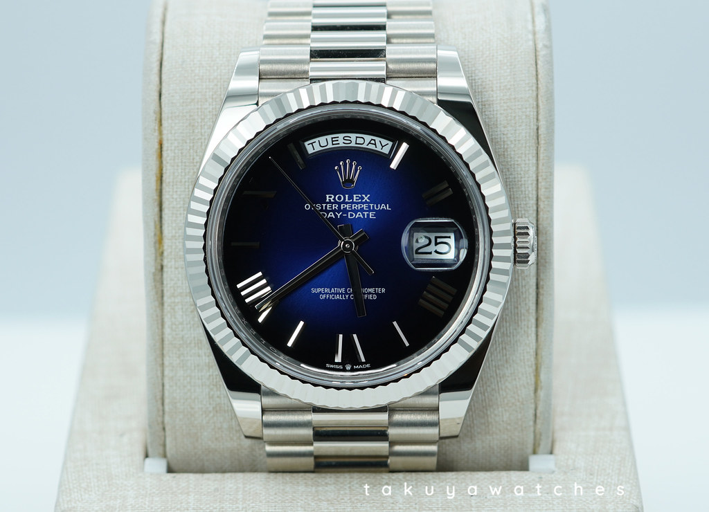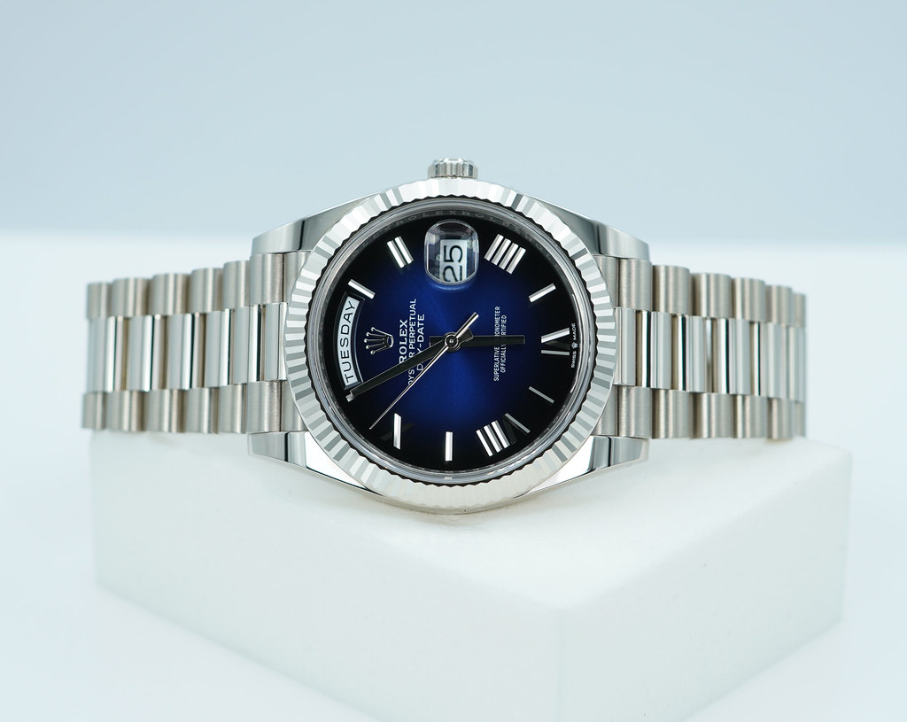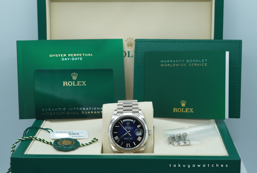 FSOT: Rolex 228239 DAY DATE 40 WHITE GOLD BLUE OMBRE ROMAN DIAL 2025 COMPLETE SET