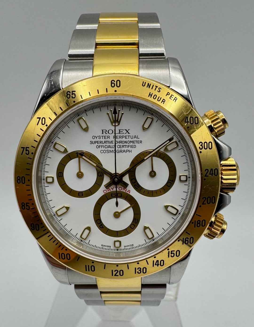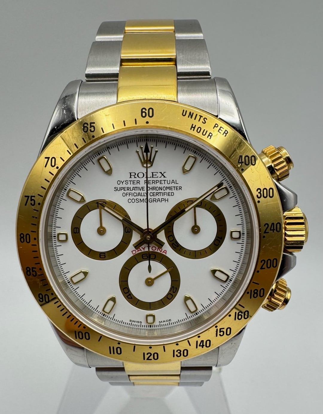 Rolex Daytona 116523 in two-tone steel and yellow gold, fully original and preserved in never-polished condition. The case shows light signs of wear yet remains in very good shape, maintaining its sharp profile. The yellow gold bezel displays minor surface scratches but is completely intact and untouched. The original white dial is flawless, presenting a clean and striking contrast typical of this reference. The bracelet retains all 12 links and shows no stretch, an uncommon trait for a watch of this age. The movement was last serviced in December 2024 and runs properly. The watch was recently pressure tested to 3ATM (30m) to confirm water resistance. This example is offered as a complete set, including the original box, booklets, and papers dated 2004. It was recently acquired directly from the original owner. **Reference:** 116523 **Size:** 40mm **Year:** 2004 📜 Includes: Original box & papers 💵 Price: $18,450 + FREE overnight shipping with FedEx fully insured. [Timestamp](https://imgur.com/a/KEKJI6v) 🔥 Follow us on [Instagram](https://www.instagram.com/bogossiajewelers) 📍 Location: New York 🔒 Authenticity: 100% guaranteed, buy with confidence. We have 160+ reviews on Chrono24 with 180+ transactions, and Excellent rating score on Trustpilot. Visit our [profile](https://www.reddit.com/u/BoghossianJewelry/s/vm81HAdB7o) for links and references. 📦 Domestic Shipping: Ships with FedEx overnight, within 24 business hours of payment, from New York, NY to CONUS. The shipment is fully insured against damage, loss or theft. 🌍 International Shipping: Incurs an additional $100. 💳 Payment: PayPal/CC (+4%), Web, or Face-to-face deal in NY. 🔐 [Seller References](https://bogossia.com/authenticity) 🔗 [Other Listings](https://www.reddit.com/u/BoghossianJewelry/s/vm81HAdB7o) 📸 [IG: @bogossiajewelers](https://www.instagram.com/bogossiajewelers)