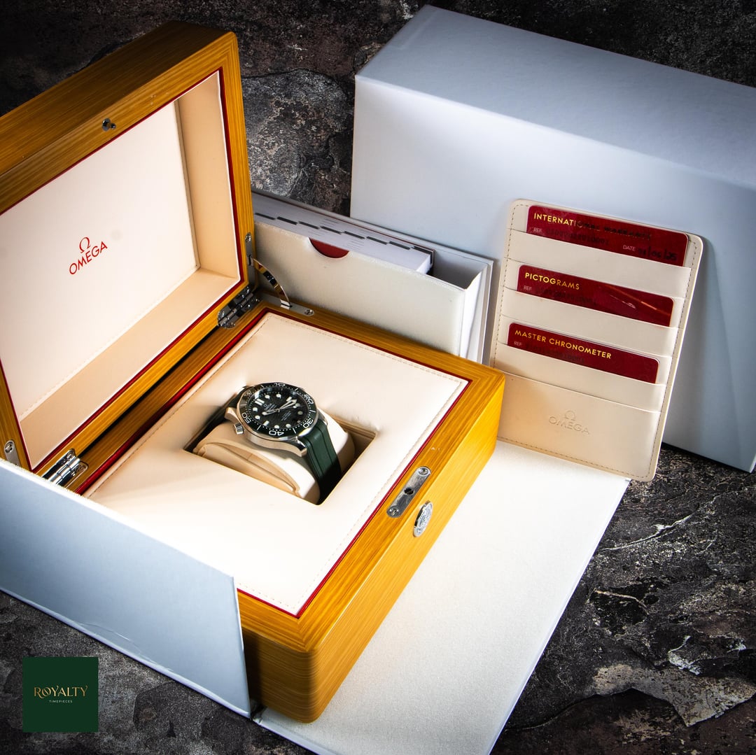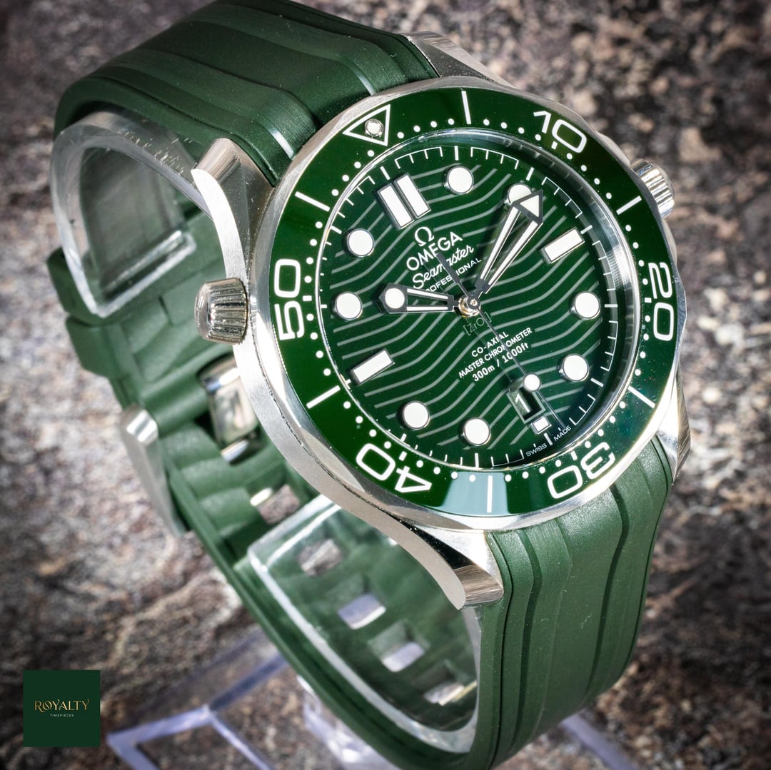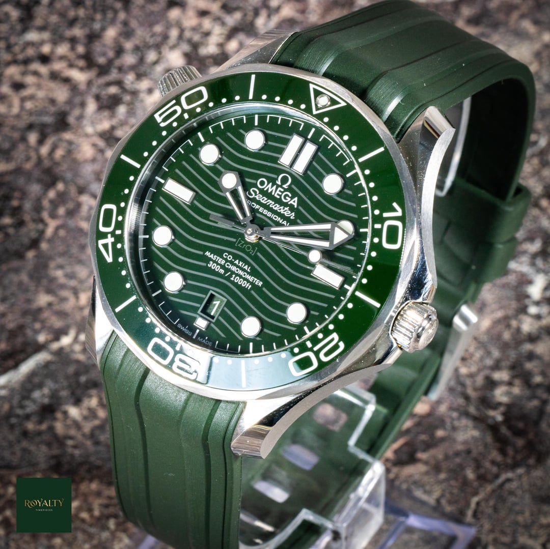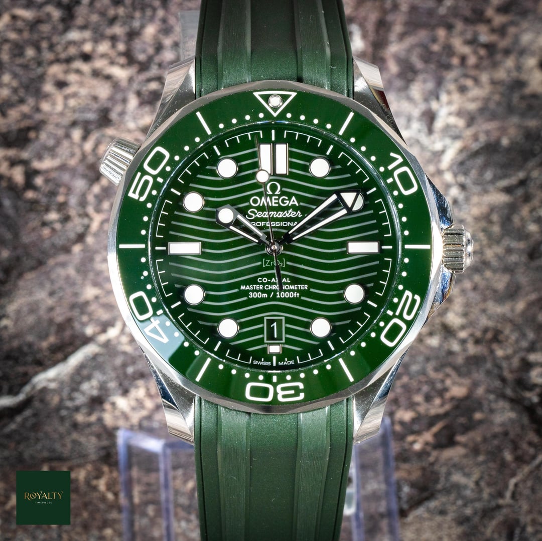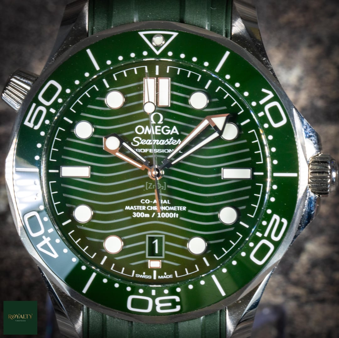 Omega Seamaster Diver 300M Green Dial “Seaweed” 210.32.42.20.10.001 Case: 42mm Condition: This timepiece is in excellent condition, having been worn sparingly and with care. The case and crystal are pristine. Mechanically, it runs perfectly, as expected for a watch of this vintage. Accessories: This offering is a complete, collector-grade set, including: * The original **Omega Presentation Box**. * **Instruction Manual**. * **Pictogram Card**. * **Master Chronometer Card**. * **International Warranty Card dated 2024**. * The watch comes on its original **Omega Green Rubber Strap**. The Omega Seamaster Diver 300M has enjoyed a legendary following since 1993, celebrated for its ocean heritage and pioneering innovation. The Reference 210.32.42.20.10.001, affectionately nicknamed the **"Seaweed"** by collectors, brings a sophisticated, earthy tone to the collection. Its polished green ceramic dial, featuring the iconic laser-engraved waves, is perfectly matched by a green ceramic bezel and integrated rubber strap. Powered by the Master Chronometer Calibre 8800, this timepiece is not just a rugged professional diver but a stunning statement of modern luxury. $4️⃣9️⃣0️⃣0️⃣ + 🏷️ MSRP: \~6.3k Shipping available to anywhere in CONUS. Shop with confidence, many references available and authenticity guaranteed! NY residents subject to sales tax without resale certificate IG: royalty.timepieces Timestamp: [https://imgur.com/TL4K0Vi](https://imgur.com/TL4K0Vi)