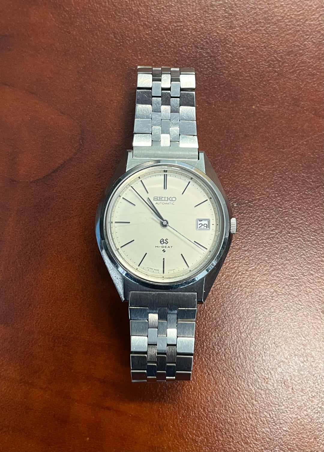 Up for sale is a beautiful vintage Grand Seiko 5645-7010, powered by the high-beat 5645 automatic movement. This is a clean, honest example with a lovely patinated dial and the rare original bracelet included. **Case**: 36mm stainless steel; **Unpolished**, retaining its crisp factory lines and sharp edges. Light surface wear from normal use; can be refreshed easily with a gentle polish if desired **Dial**: Originally white, now evenly aged to an **elegant cream tone**; No spotting, stains, or damage; Text and markers remain sharp and clean **Crystal:** Some surface scratches and minor edge dents; All can be polished out without issue **Bracelet**: Equipped with the original **GS XQB070 brick-style bracelet**; These bracelets alone frequently sell for **$400–500** today; Includes **30 links**, fitting a wide range of wrists; Scarce to find one complete **Movement**: Running accurately; **Crown winds tightly**; a future service is recommended, and the pricing reflects this. **Price: $749**, PayPal Friends & Family; Includes insured U.S. shipping A timestamp is included in the last photo. Feel free to message me with any questions or to request additional photos. Thanks for looking!