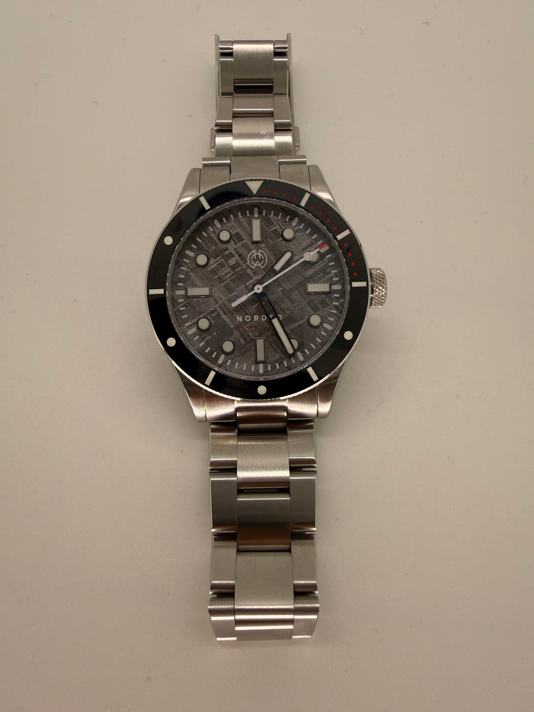 **Nordsø Meteorite** is our take on the ultimate watch, with a dial made from a 4 billion year old piece of space-history: The Muonionalusta meteorite. DETAILS * Premium 9039 Automatic movement * Meteorite-stone dial * Sapphire crystal glass * Ultra-slim, 10.5 mm * Swiss BGW9 luminous * 200 meter / 660 ft / 20 ATM water resistance * Original Danish design * Bracelet with toolless on-the-fly micro-adjustment * Hand assembled in Pforzheim, Germany 💵 Price: $550 OBO 📦 Shipping: CONUS included, otherwise calculated to your destination 💲 Payment: PayPal or Venmo F&F or G&S (buyers add 4.6%) 🚫 No trades at this time