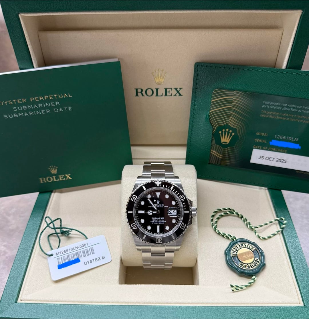 Hey guys! I have a brand new 10/2025 Submariner Date complete set available in mint condition if anyone needs/wants! Ref. 126610LN Year: 10/2025 Contents: Complete set with card, manuals, and both hang tags. Double boxed with new green box! Runs and functions perfectly with no issues. Zero desk rash on clasp and no wear on case. Price is $14,400 + label Timestamp: https://imgur.com/a/unxVRN3 Zelle or Wire payment preferred. Credit Cards accepted as well +3.5% I have many solid references and have done tons of successful transactions throughout the watch groups online. Please buy in confidence! Thank you and please reach out if you have any questions or concerns. Located in Louisiana! Louisiana residents subject to 5% sales tax fee