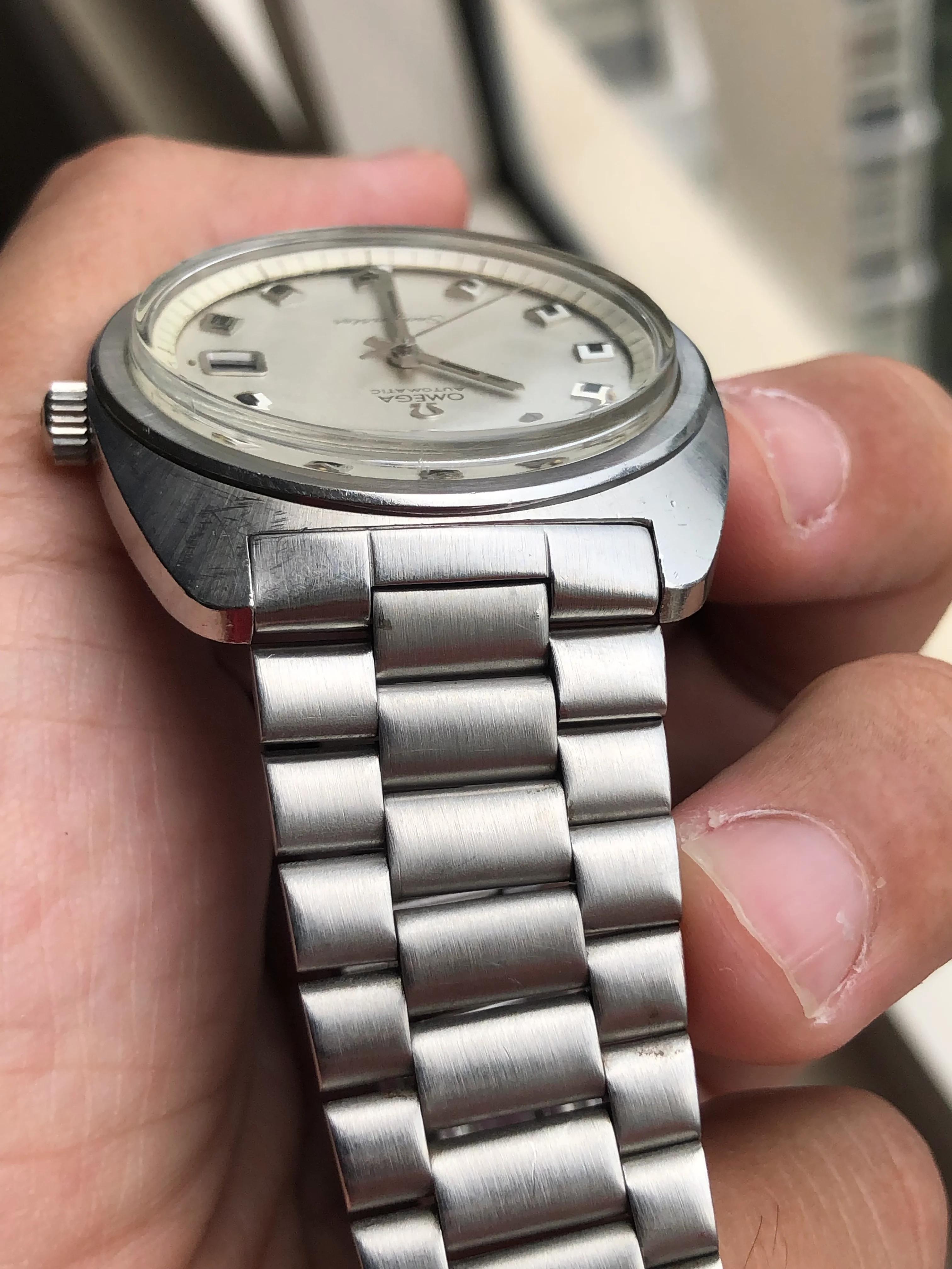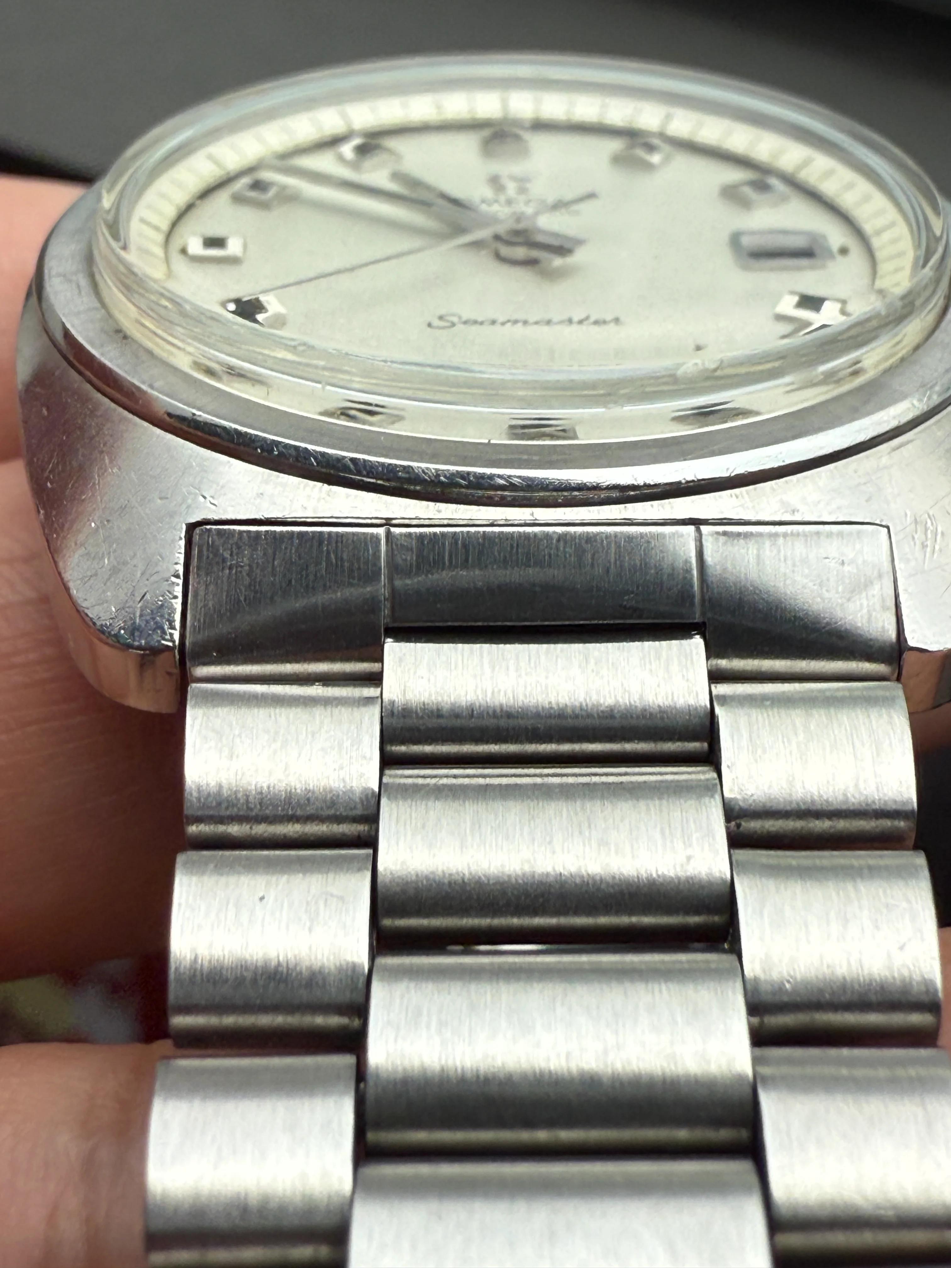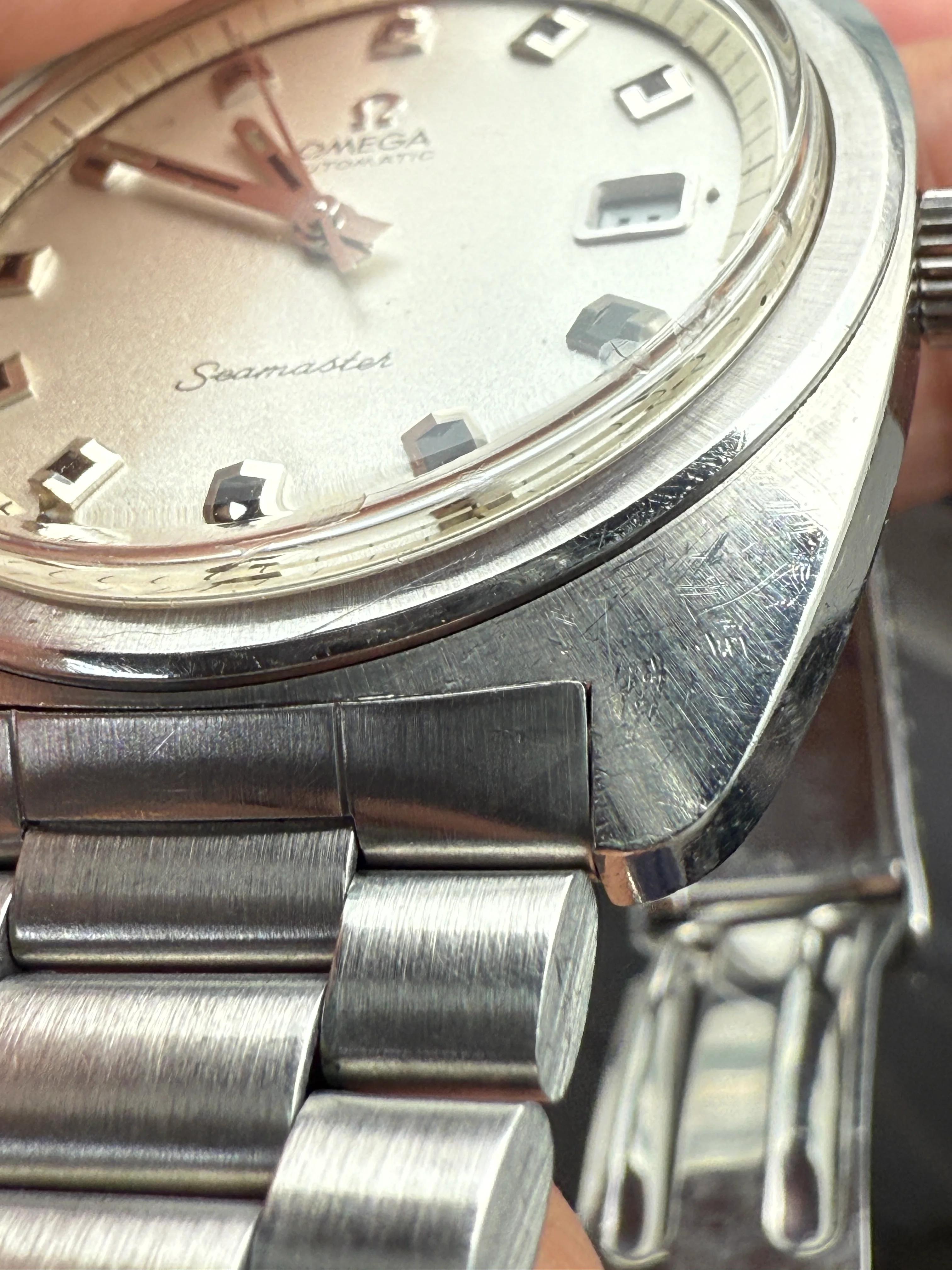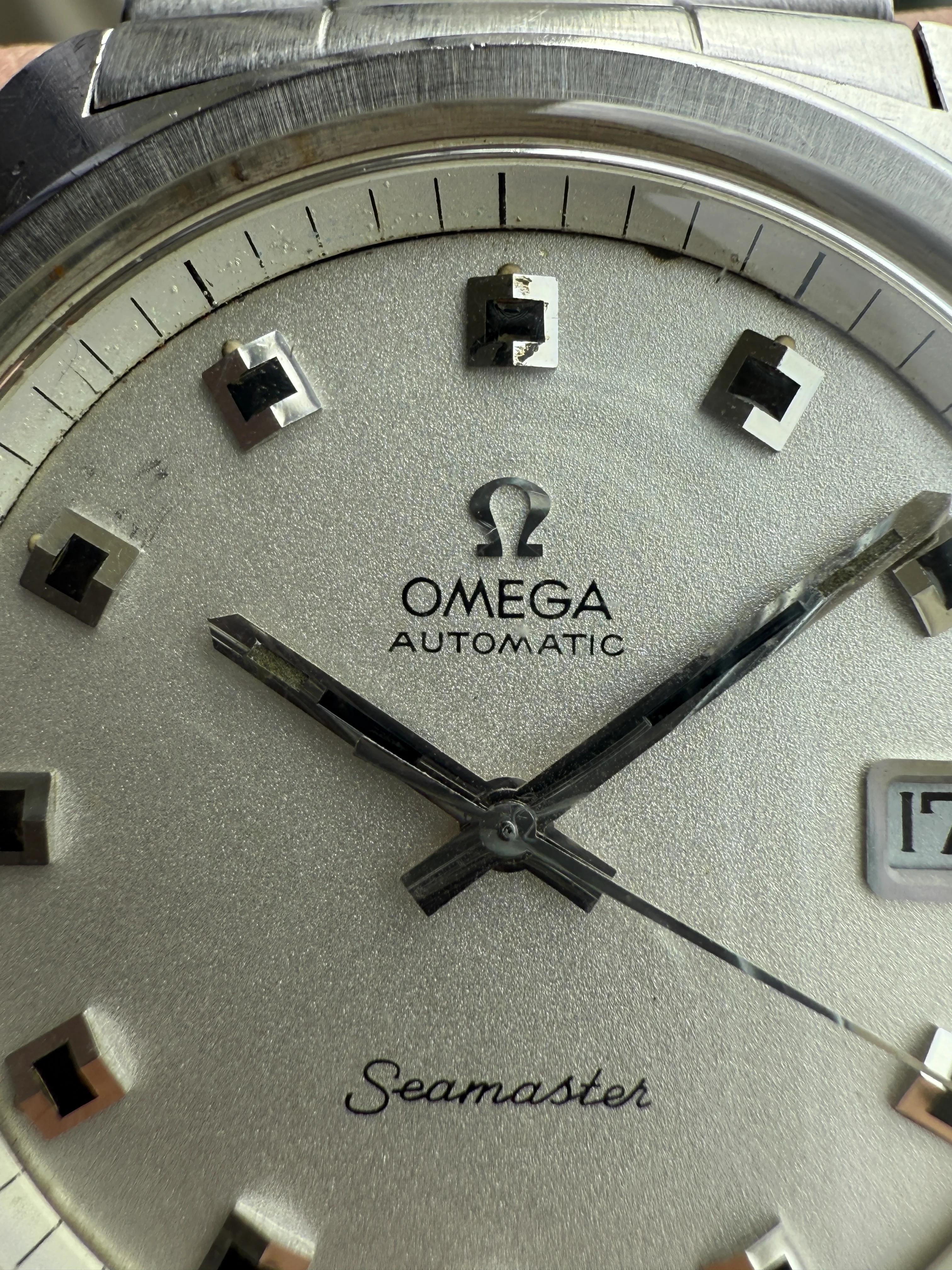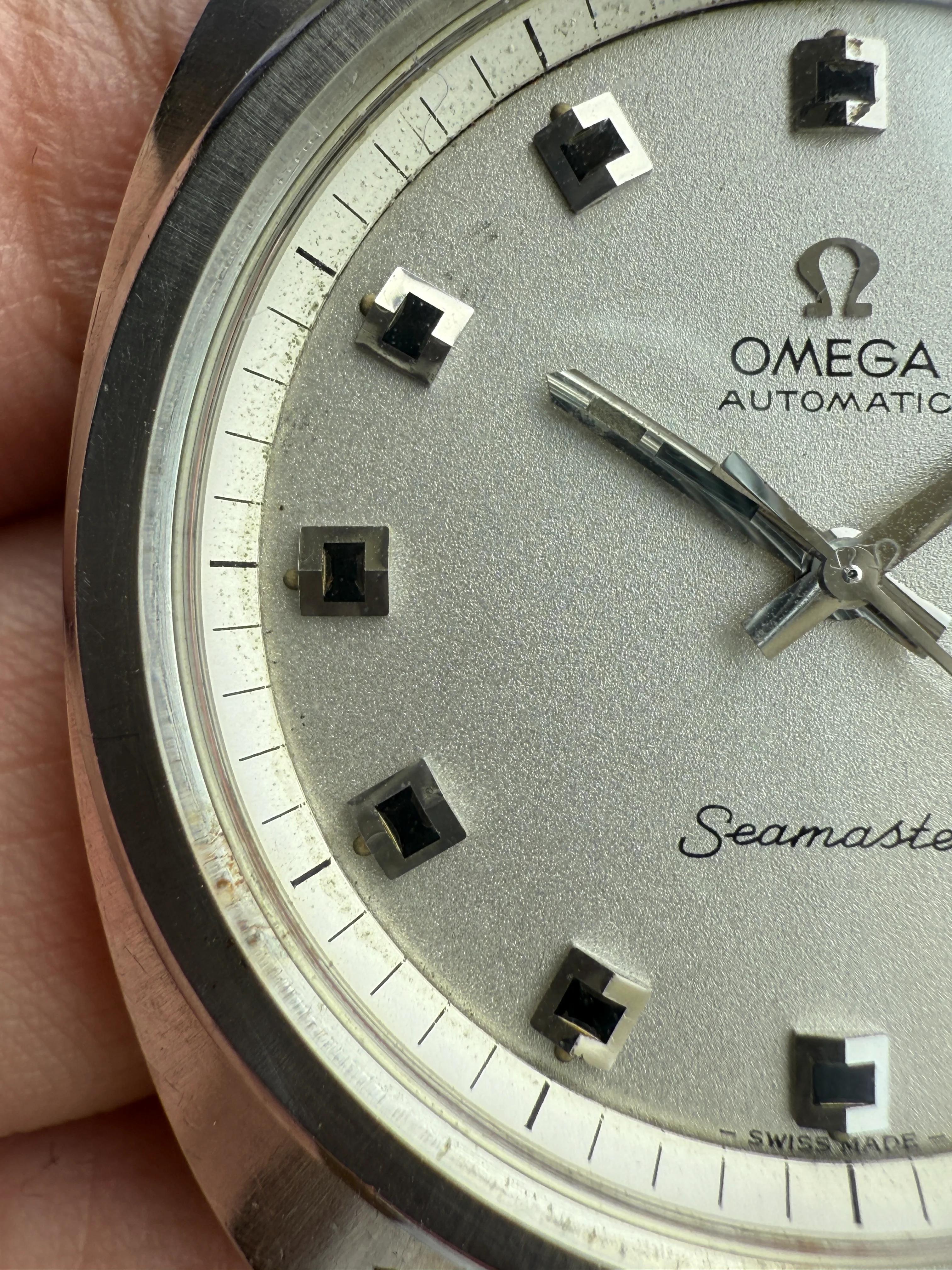 • Dial: Original silver sparkle dial with "roof shaped" hour markers; date-aperture frame at 3; stick hands; tritium lume; applied Omega logo; white inner bezel; prints, hands, lume and hour markers are all good. There are some signs of age and stain on the upper left corner of the inner bezel.