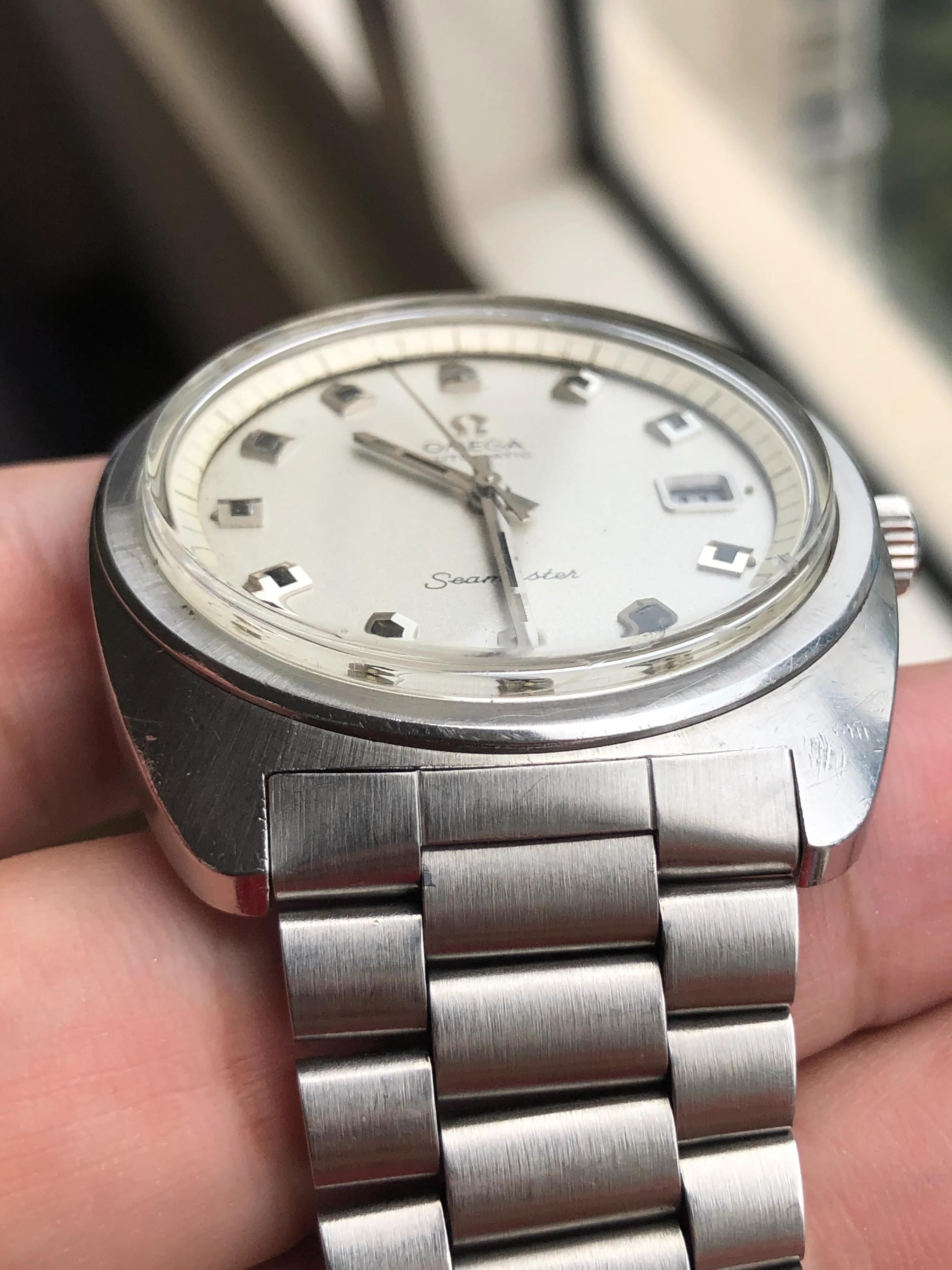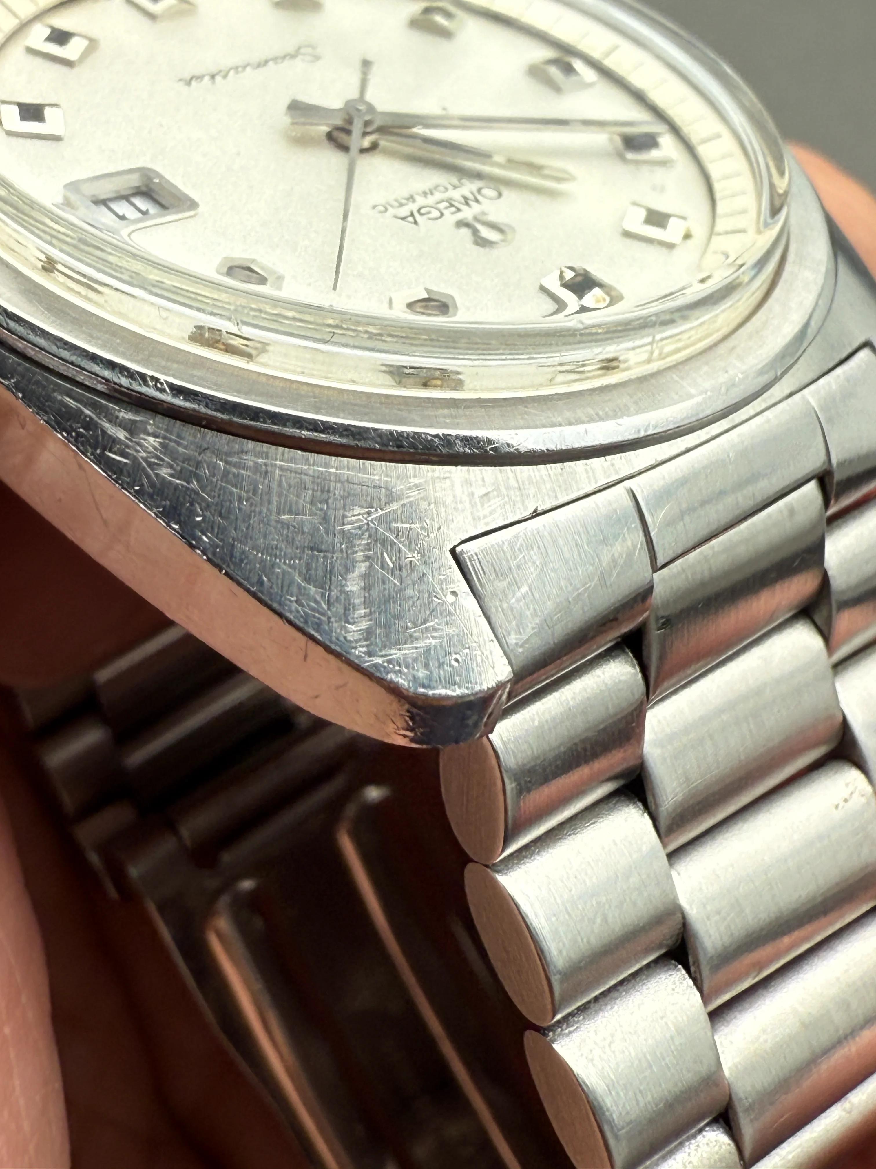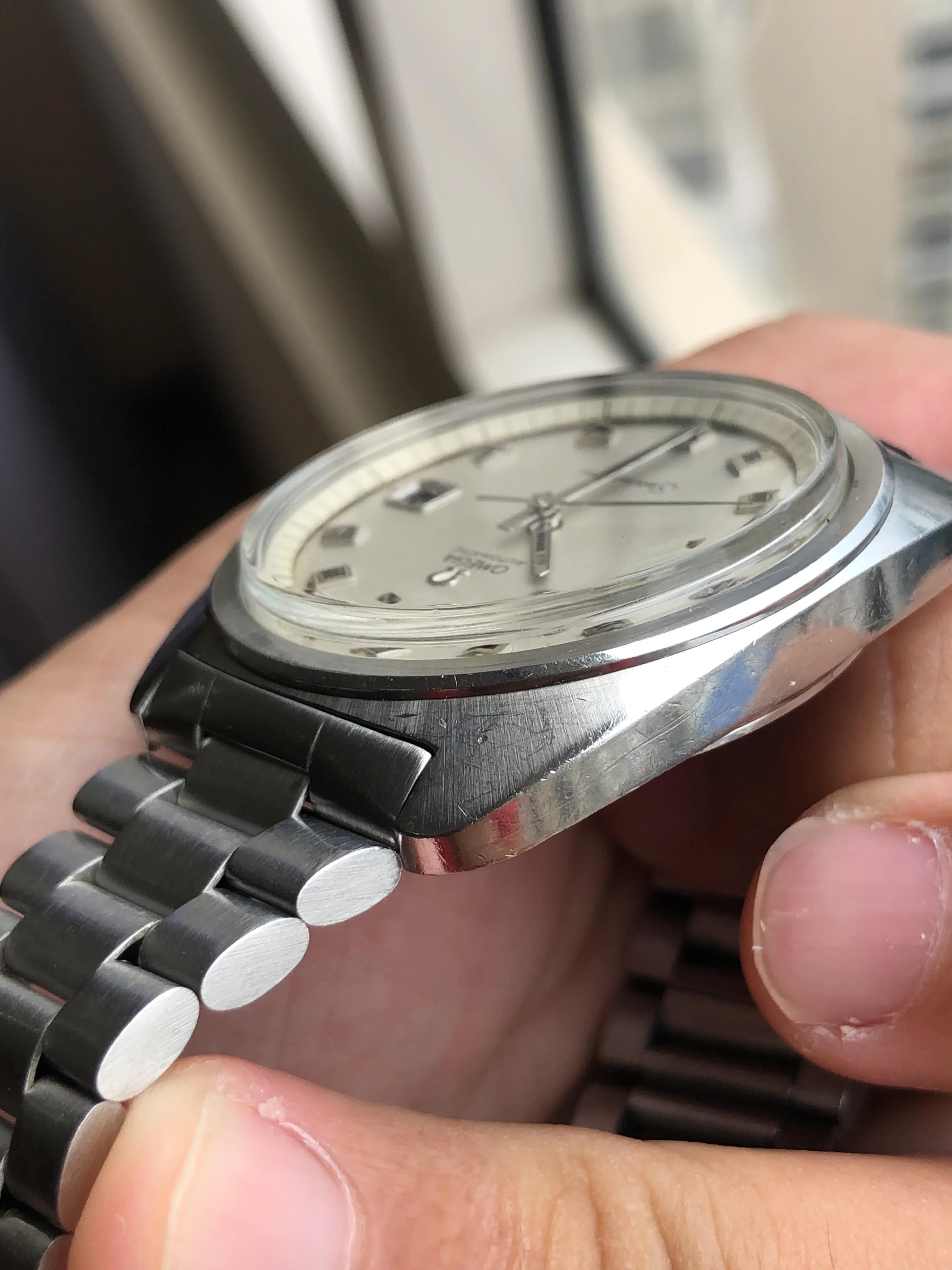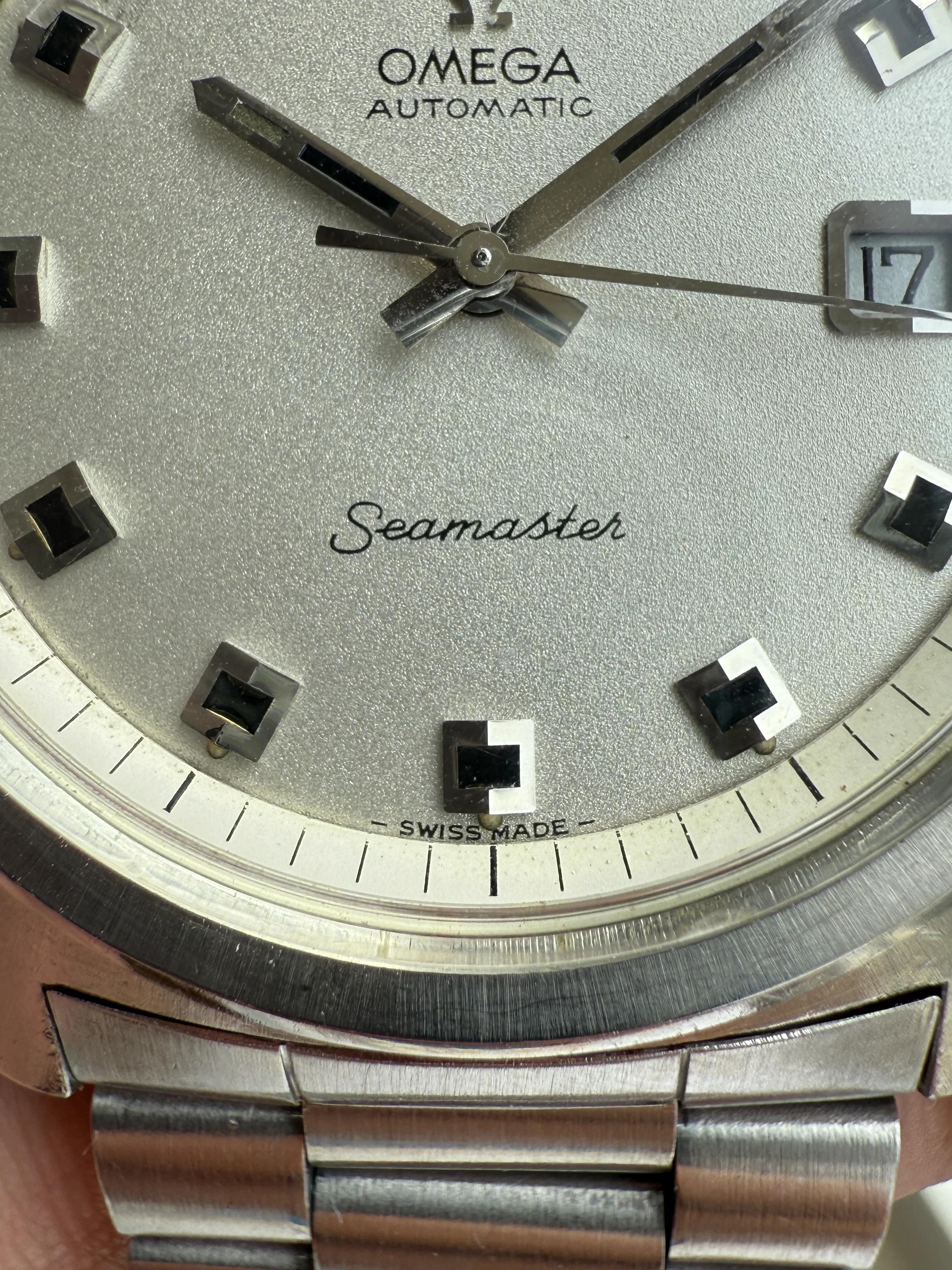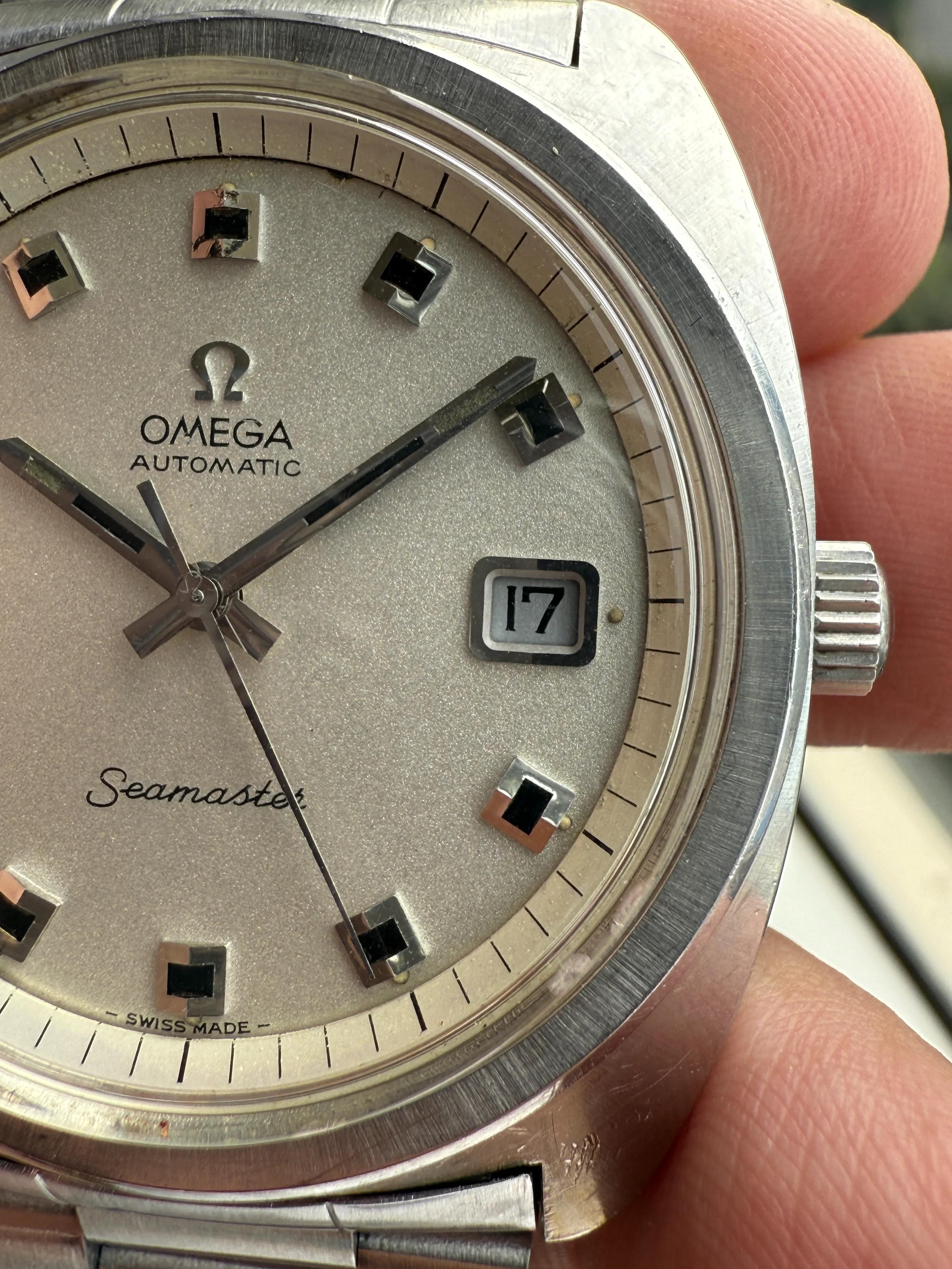 • Dial: Original silver sparkle dial with "roof shaped" hour markers; date-aperture frame at 3; stick hands; tritium lume; applied Omega logo; white inner bezel; prints, hands, lume and hour markers are all good. There are some signs of age and stain on the upper left corner of the inner bezel.
