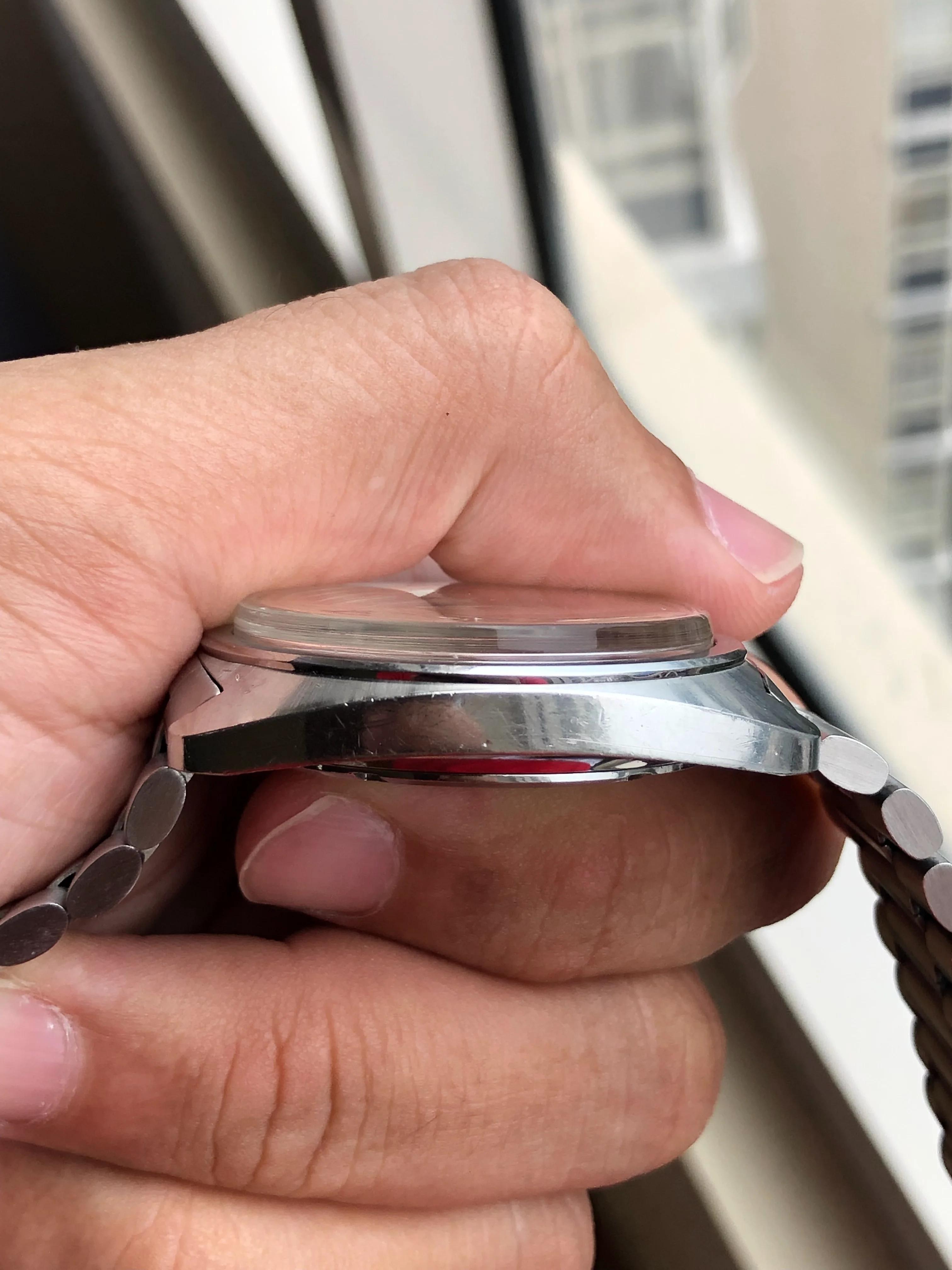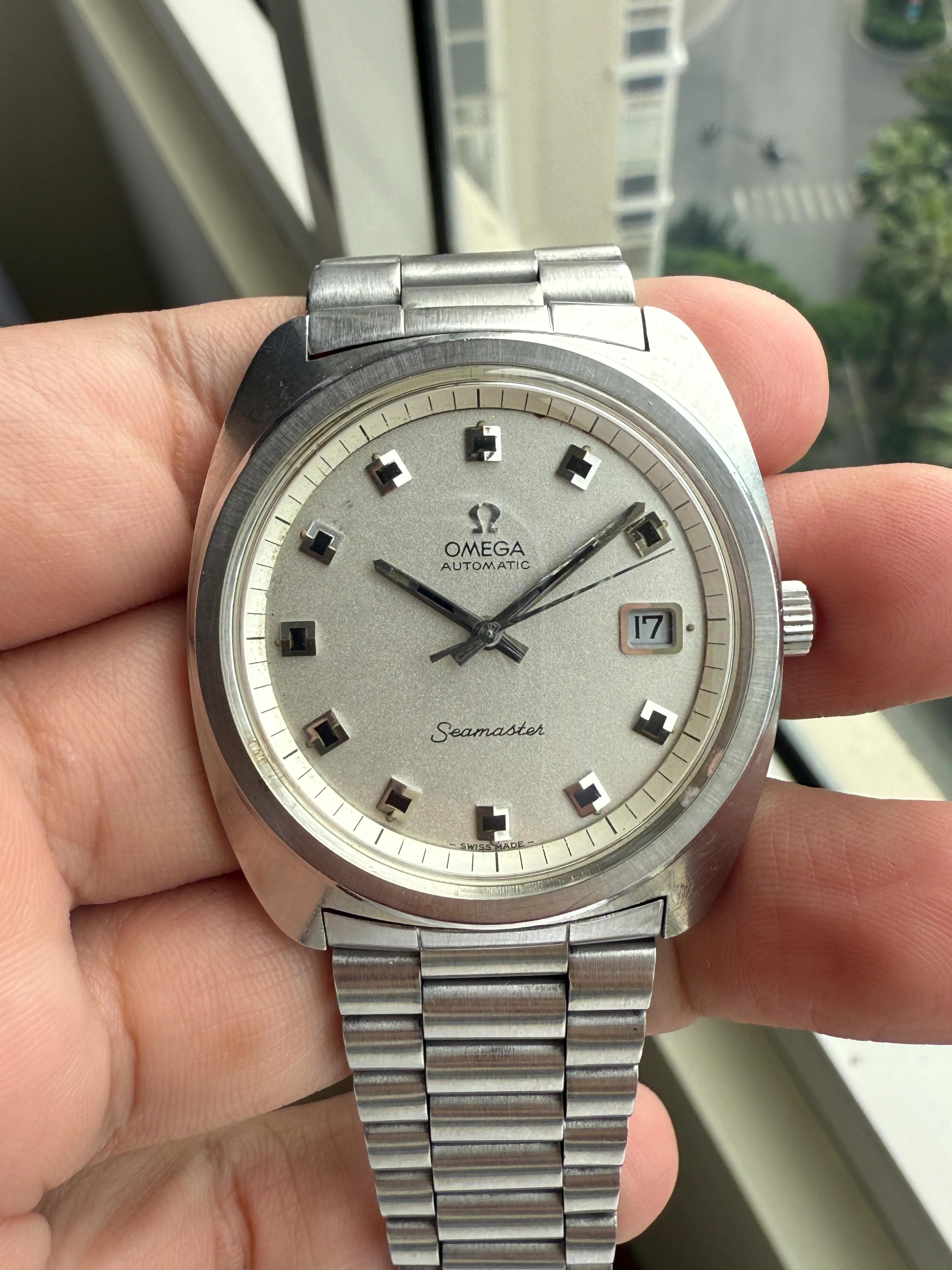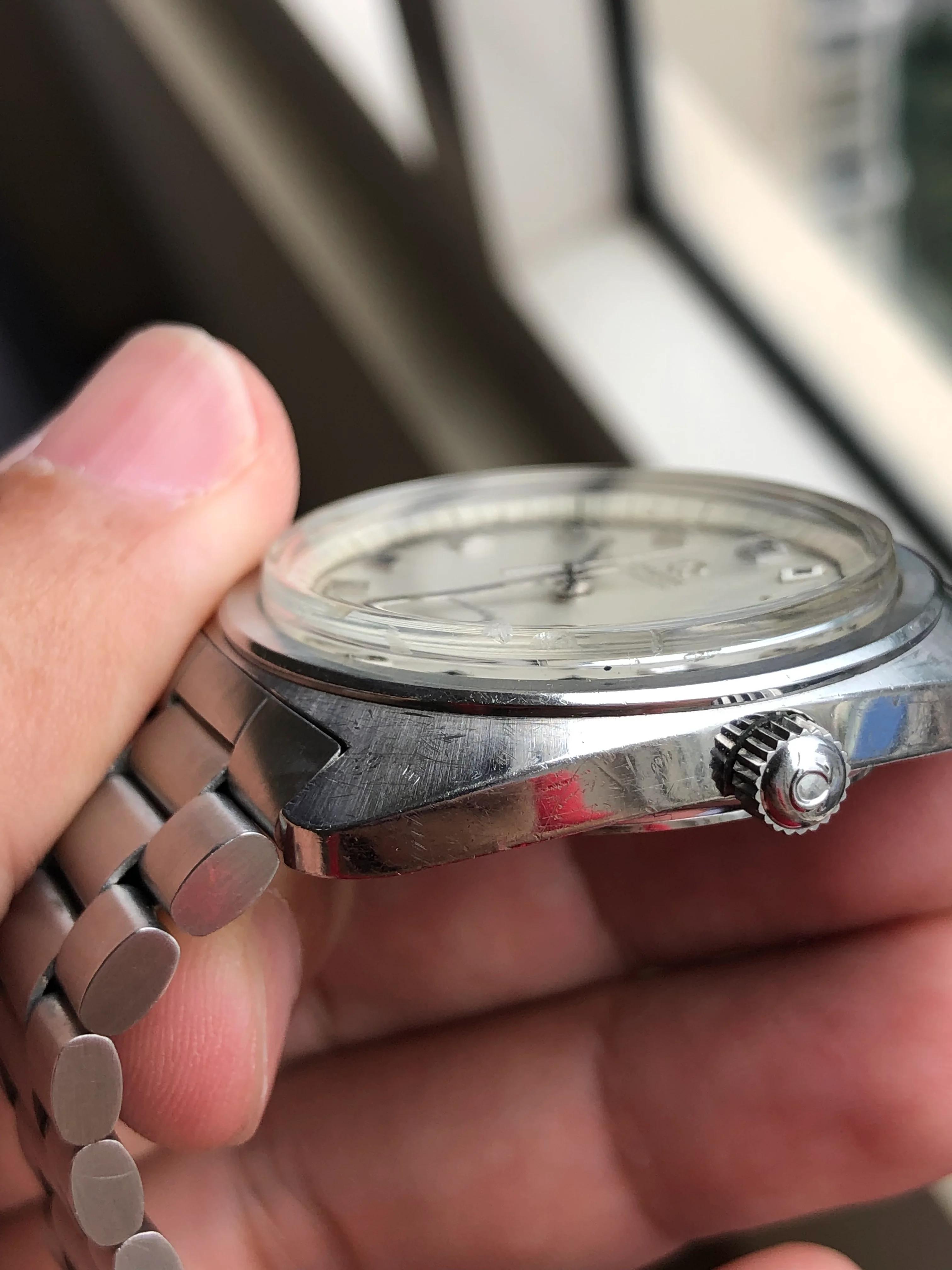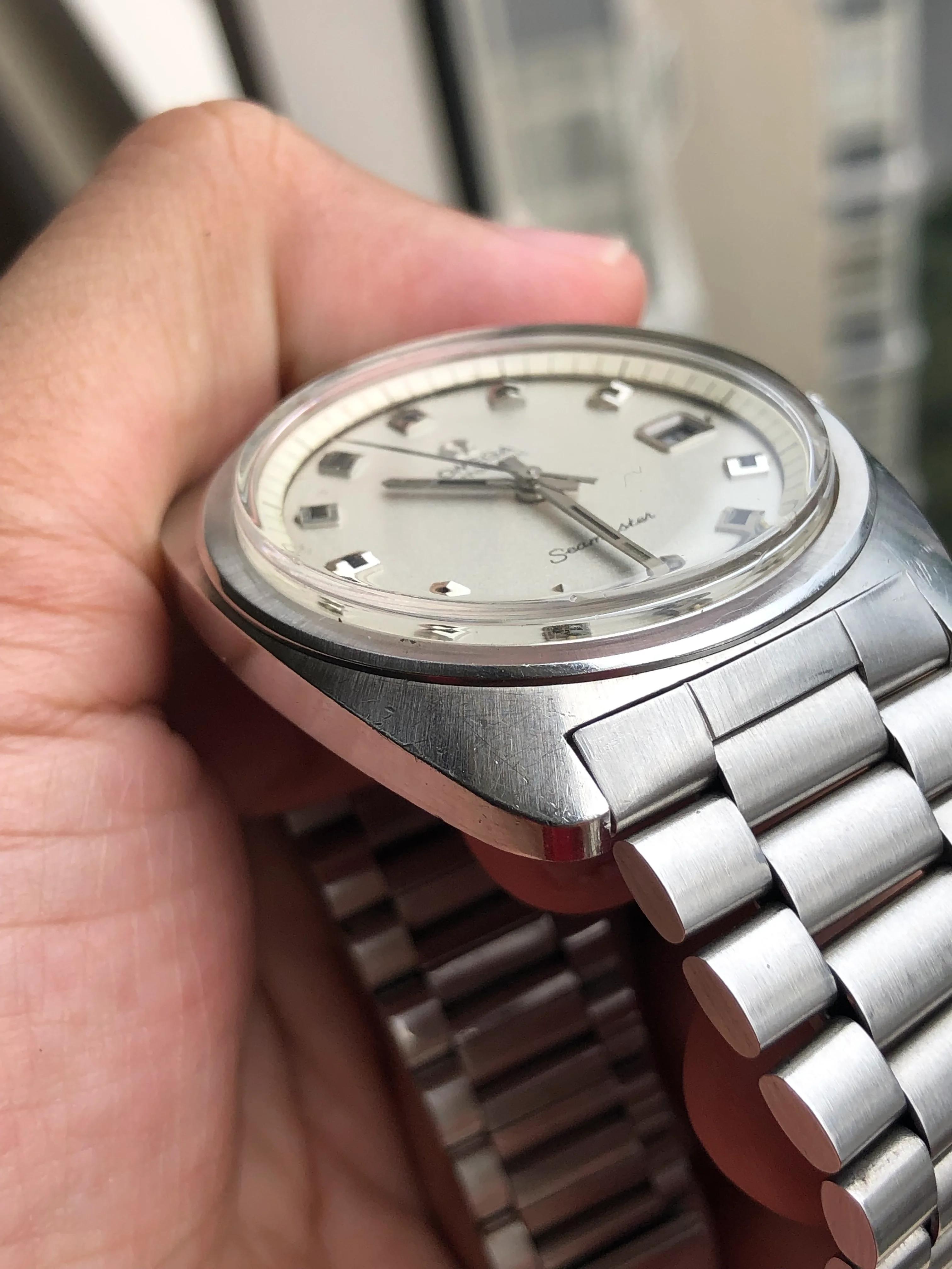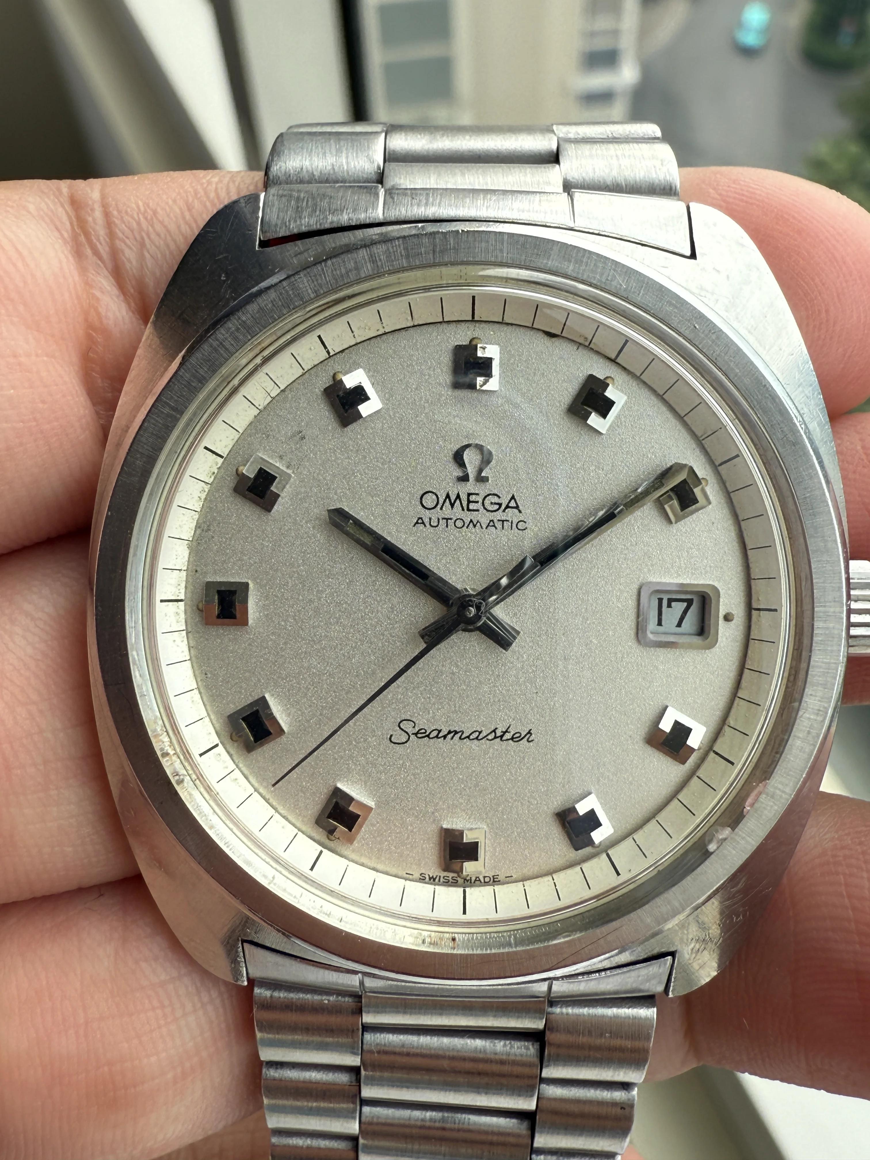 • Dial: Original silver sparkle dial with "roof shaped" hour markers; date-aperture frame at 3; stick hands; tritium lume; applied Omega logo; white inner bezel; prints, hands, lume and hour markers are all good. There are some signs of age and stain on the upper left corner of the inner bezel.