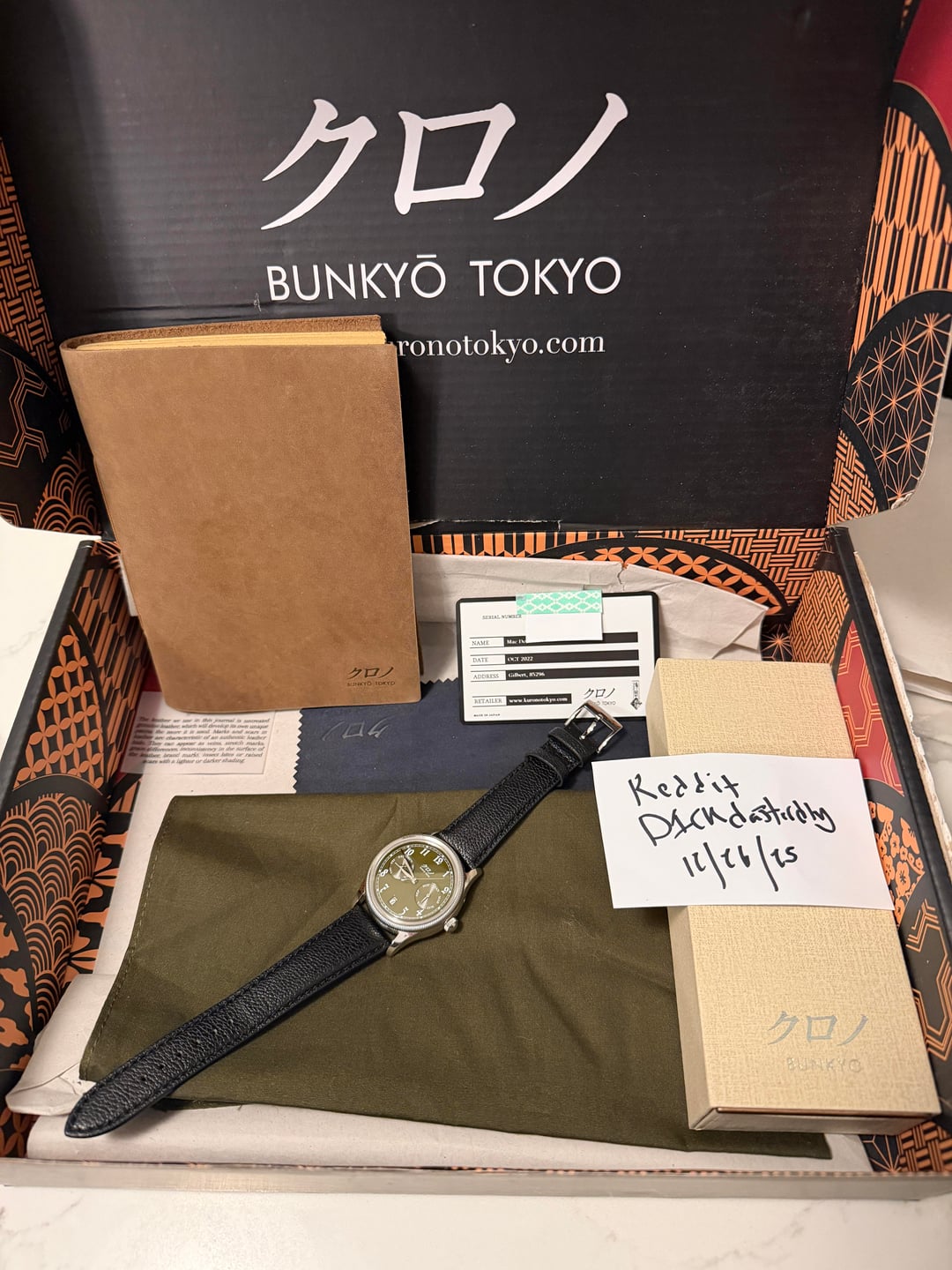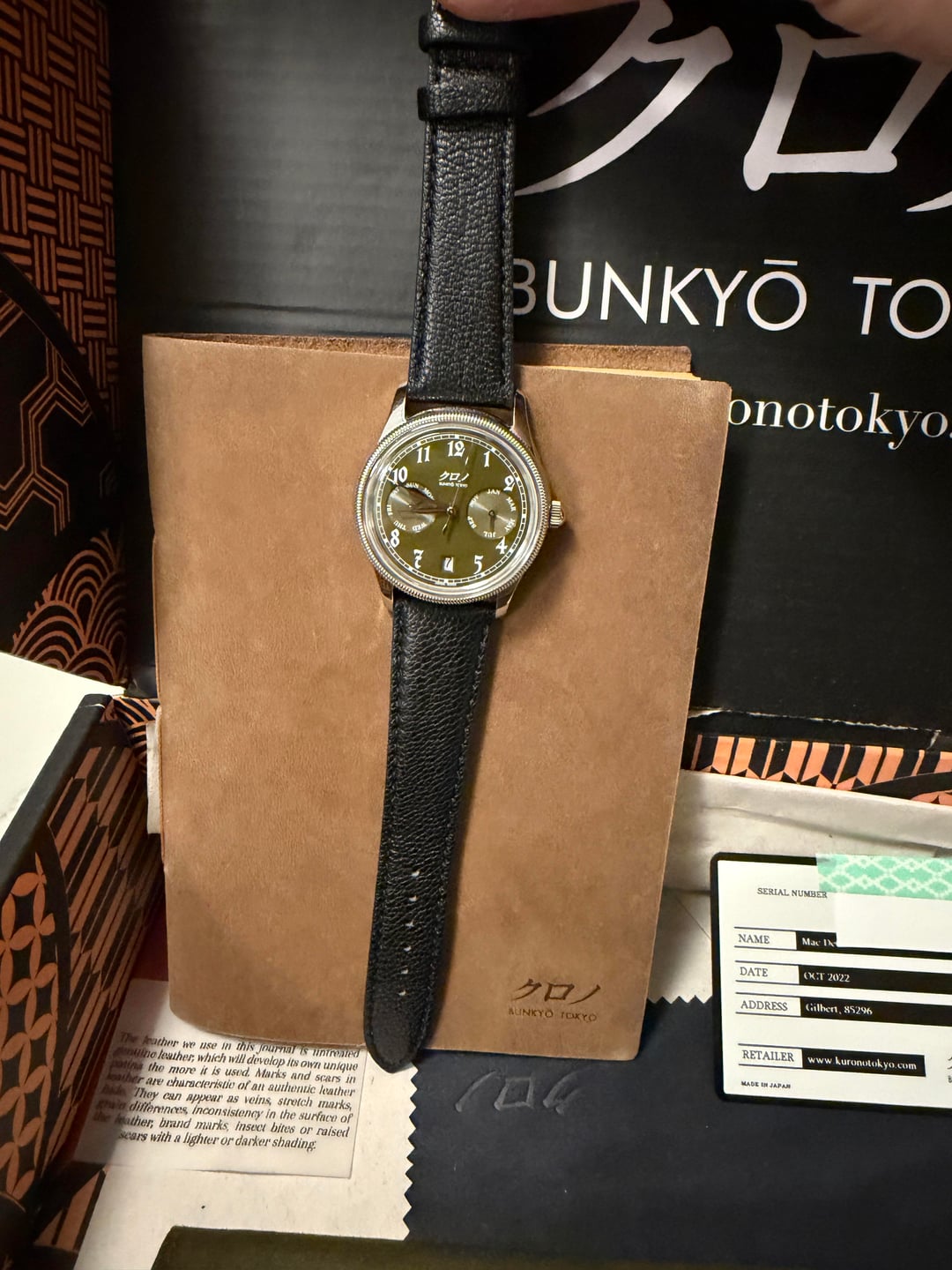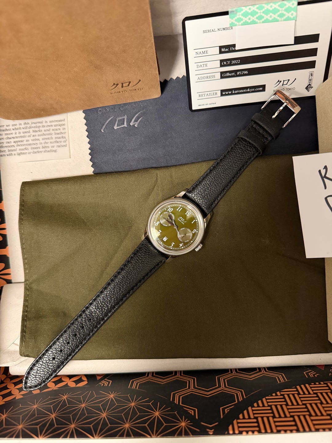 Selling a used Kurono Calendrier 'Type I'. Condition is very good. No significant marks to speak of. Please see pics and video for details. This comes with all items as originally purchased - cloths, box, leather journal, warranty card. Strap has seen little use. $2000 Shipped CONUS via paypal G&S. Video: [https://imgur.com/a/9AOI9kK](https://imgur.com/a/9AOI9kK)