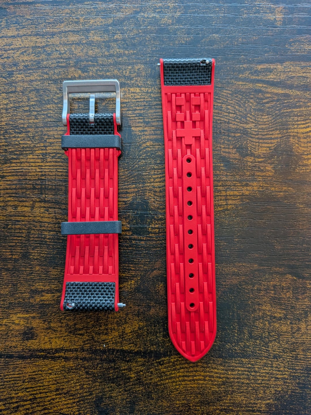 For Sale: **Christopher Ward 22mm Black Red Hybrid Rubber Strap $50** 316L Steel Clasp **$50** Shipped (CONUS). Ships from Texas. International Shipping on your label. Glad to do a FaceTime/video call or provide more photos if needed. Accept Zelle, Venmo, PayPal (Buyer pays fees).