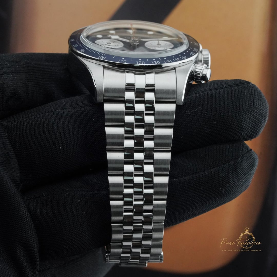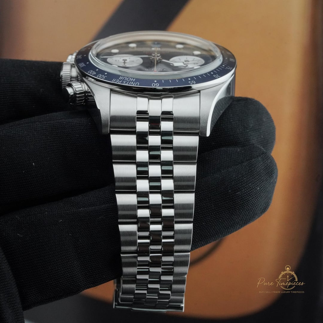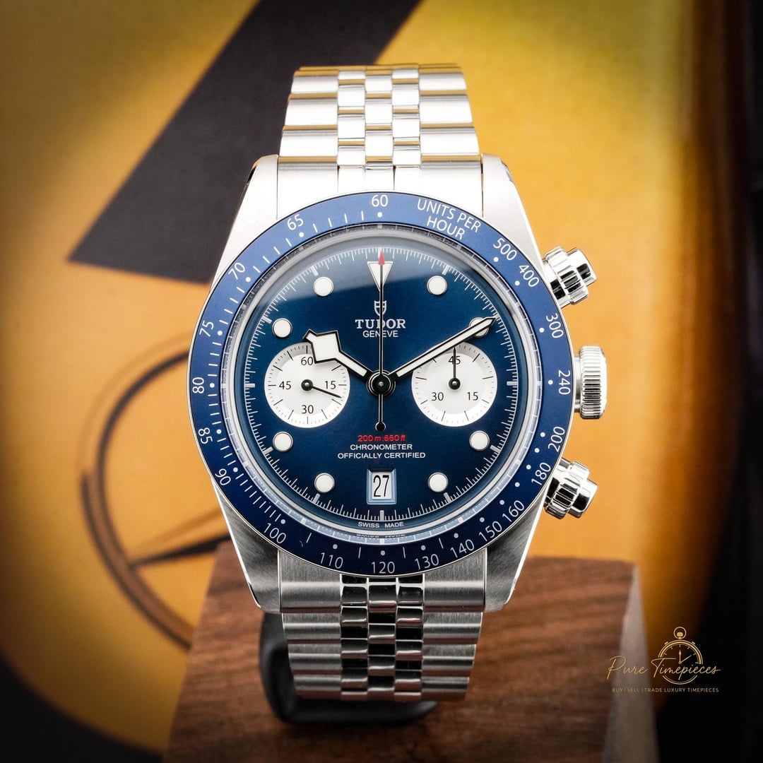 For sale is a **Tudor Black Bay Chrono 79360B** with Blue dial on stainless steel bracelet. The watch is in **excellent condition, like new and unworn** **Specs:** • 41mm stainless steel case • Automatic Tudor Calibre MT5813 • 70-hour power reserve • Blue dial • Sapphire crystal • 200m water resistance • Dated 2025 **Included:** • Original Tudor outer box • Warranty card & manuals, full link **Price:** **$4,990 USD shipped** **Payment:** Wire transfer accepted | Crypto +2.5% **Shipping:** Insured shipping included **Location:** Canada / USA friendly **Website:** [https://puretimepiecesco.com/](https://puretimepiecesco.com/) **IG:** pure.timepieces