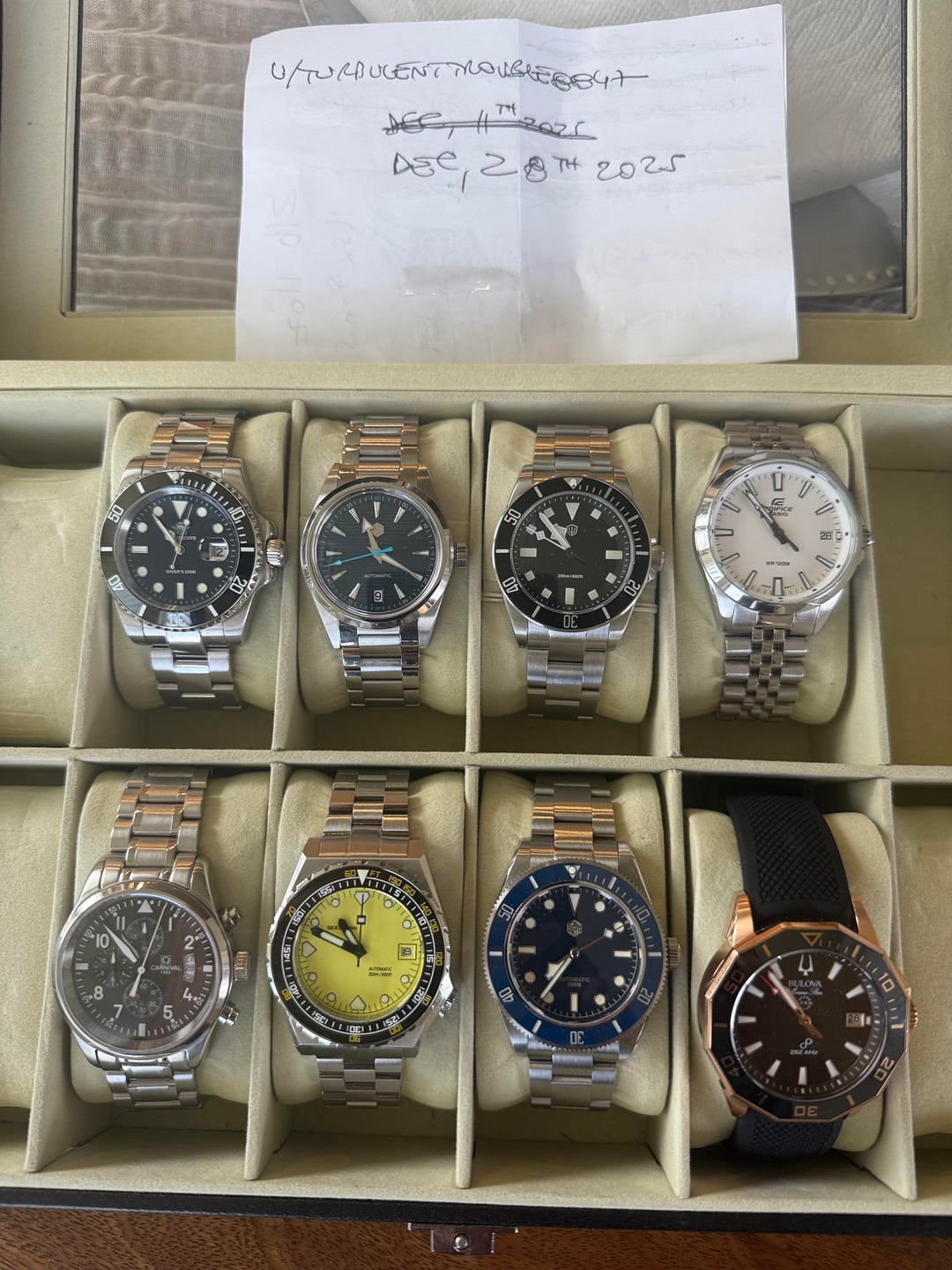 I’m downsizing my collection. All well taken care of. Priced to sell, low ballers will be ignored. If any doesn’t sell, I’ll gladly keep them. That’s the excuse I need, lol. Prices Include CONUS shipping. If you need more pictures/video, please let me know **Addiesdive Black Sub Quartz NIB $60** **San Martin Aqua Terra Blue SN0113W NH35 auto $160** **Watchdives 1969 PRO Sweep seconds quartz $85** **Casio Edifice White Quartz $80** **Carnival Chronograph Quartz $80** **Seestern Sub 600T yellow NH35 auto $120** Happy to go on a video call or send more pictures upon request. Venmo / Zelle