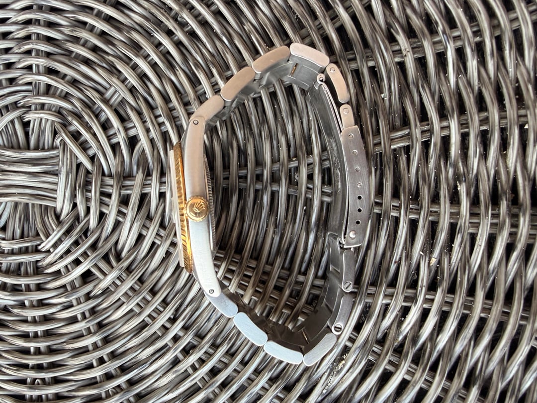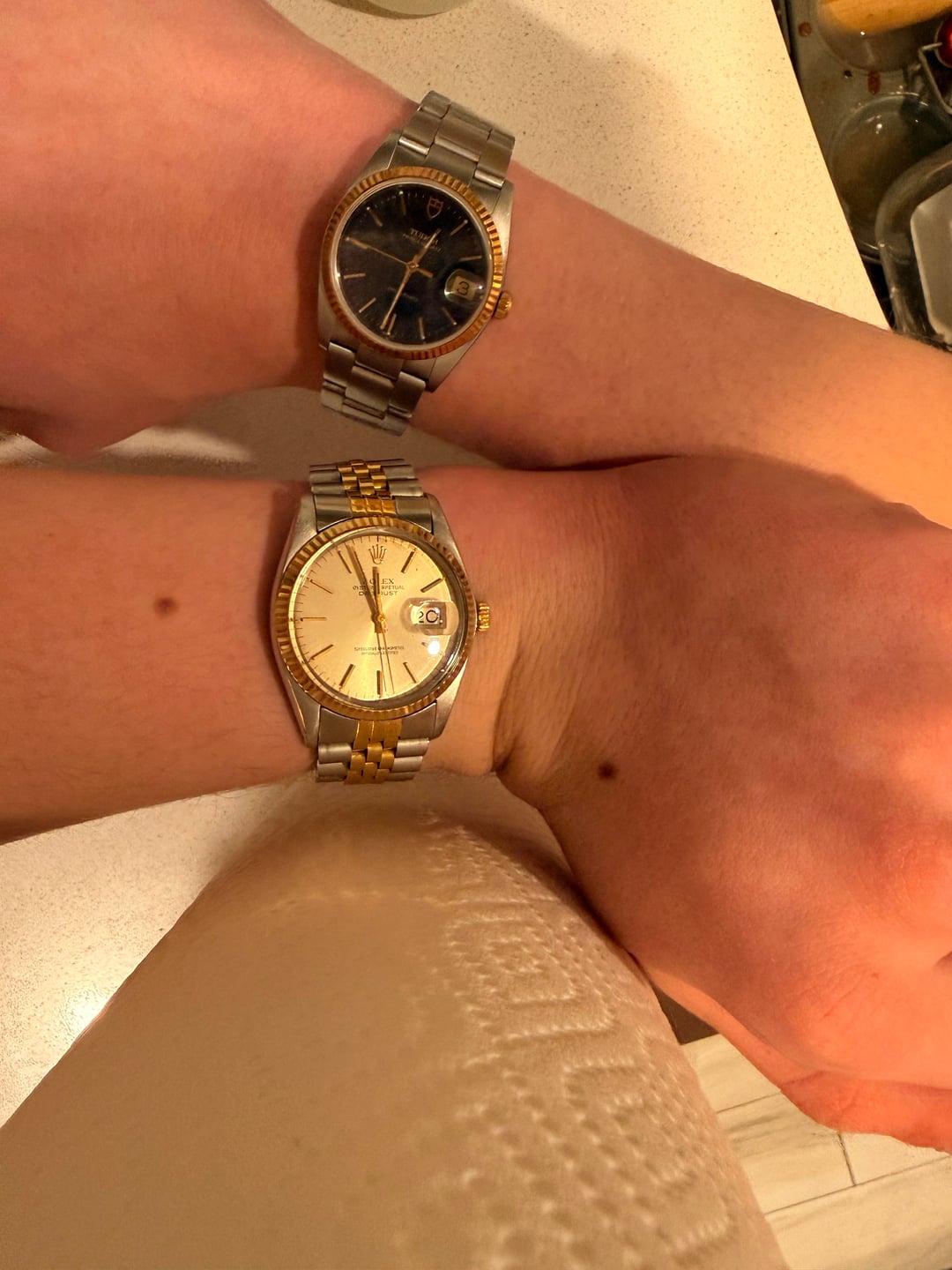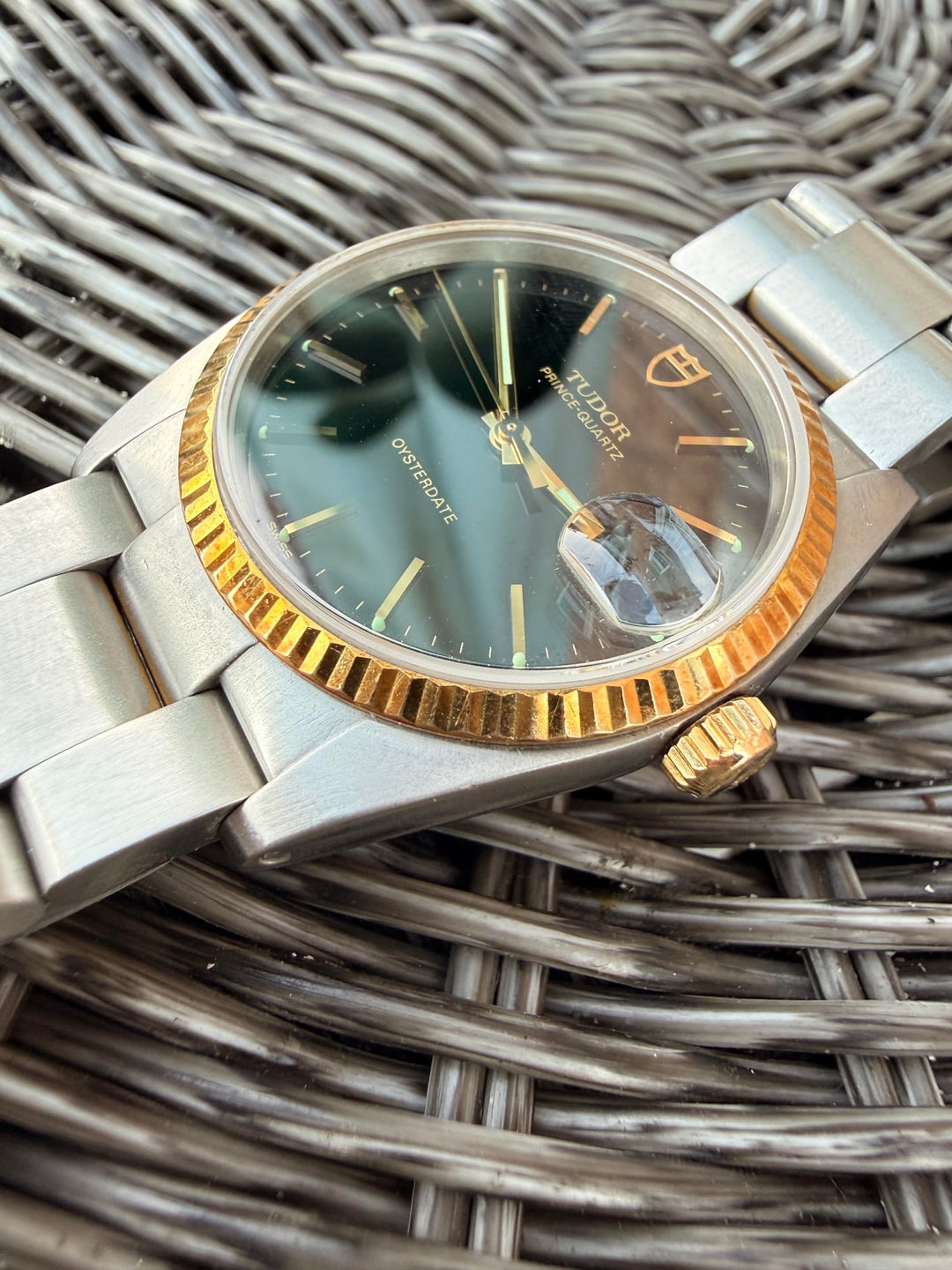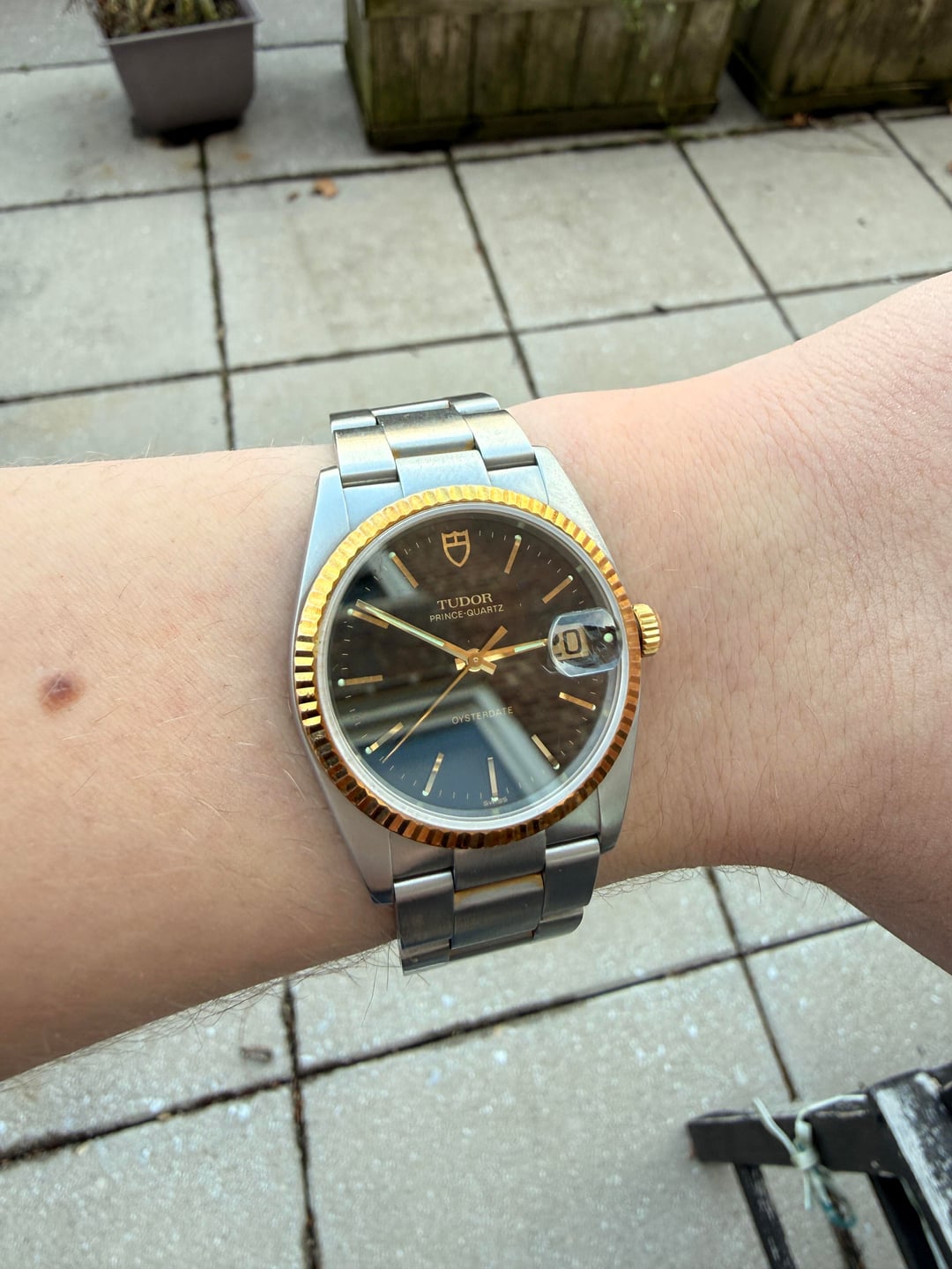 Welcome to Starry Seconds! A new page ran by two experienced sellers. Condition: — The watch has been brushed throughout, and is priced accordingly. I honestly think this gives it an understated look, and it looks really good. The crown is rolex signed and solid gold. The watch runs perfectly, as expected from an oysterquartz. The bracelet is integrated and in pretty good condition with minimal stretch. The bracelet fits my 6.25in wrist with two spare links. The 18k solid gold bezel and crown are also in immaculate condition, and the dial is gorgeous. I attached a photo with it next to my 36mm datejust as well, to show how nice this Tudor looks on wrist. These are prince quartz tudors are rare, especially with the black dial. Asking $1200 1100 USD SHIPPED Through paypal FF or Zelle. CONUS ONLY Please feel free to also check out my other listings! PLEASE COMMENT BEFORE PM.