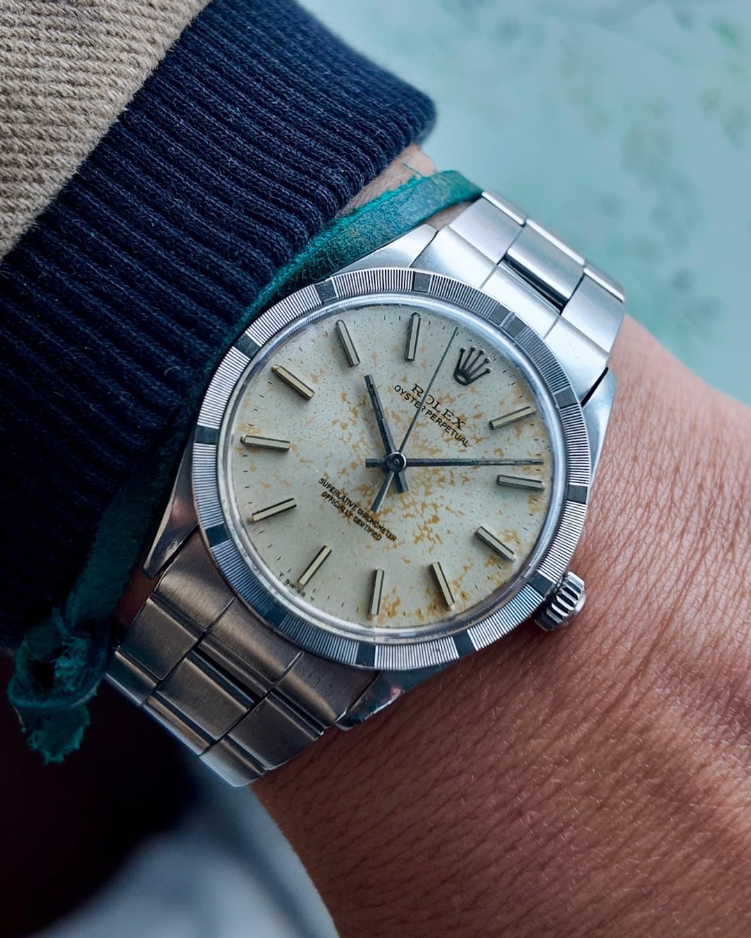 Rolex Oyster Perpetual ref. 1007 circa 1969 The midsize OP series is arguably a perfectly proportioned piece and clearly inspires the modern popular OP series today. This 1007 features an engine turned style steel bezel that frames a caramel speckled tres leches patina’ed dial attached to the original folder oyster bracelet. The automatic movement is running per Rolex factory specifications on the timegrapher with a strong amplitude without service history. Overall, the watch has honest wear with no damage, condition notes or signs of over polish _________________________________ Timestamp, pix Videos and timegrapher: https://drive.google.com/drive/folders/1AvFQjdGi5brkl57Grzy_8XWbBv0mFWb_?usp=sharing Specifications: 34mm case X 19 lug width X 39h X 12cc with acrylic (wears bigger as pics are on a 6.9in wrist) Box and papers: papers no but vintage box not original to the watch included Bracelet: can accommodate up to a 7.25in wrist with all links installed but recommend a wrist 7in an under for both look and fit ___________________________________ * Video is the best way to view the watch if in-person test drive is not available. Due to the different characteristic of the cameras and gadgets used, the color of the watch you purchase may not be the same as shown on this website or on our Instagram. * will consider trades that make sense but please consider time, shipping, and trade value—not market. - local special: can possibly accommodate at ButterScotch in Downtown Long Beach by appointment - All sales final unless the watch is misrepresented or lost in transit (always fully insured) - Link to [feedback here](https://watchcharts.com/repcheck/user/soycowboy?source=reddit&type=feedback) ____________________________ Asking a *negotiable* **$3600** via bank wire, Zelle, and/or venmo Price includes fully insured Fedex shipping in the USA— hand delivery in long Beach with drinks or coffee on me ;).