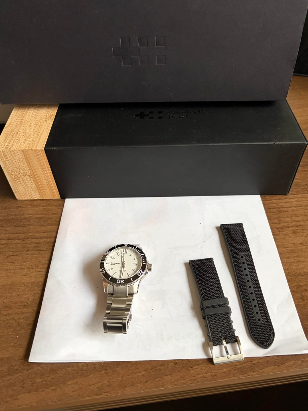 For sale is my 42mm Christopher Ward Trident Pro 600 with white dial. Watch is in excellent condition as pictured and comes with the full set including box and extra links. Also comes with the black CW hybrid strap, also pictured. Watch is running a little fast well within spec. **$700** shipped via USPS Priority Shipping within USA (shipping included in price). I take Zelle. Let me know if you have any questions and I'll be happy to answer. I'm a private seller and I don't accept returns.