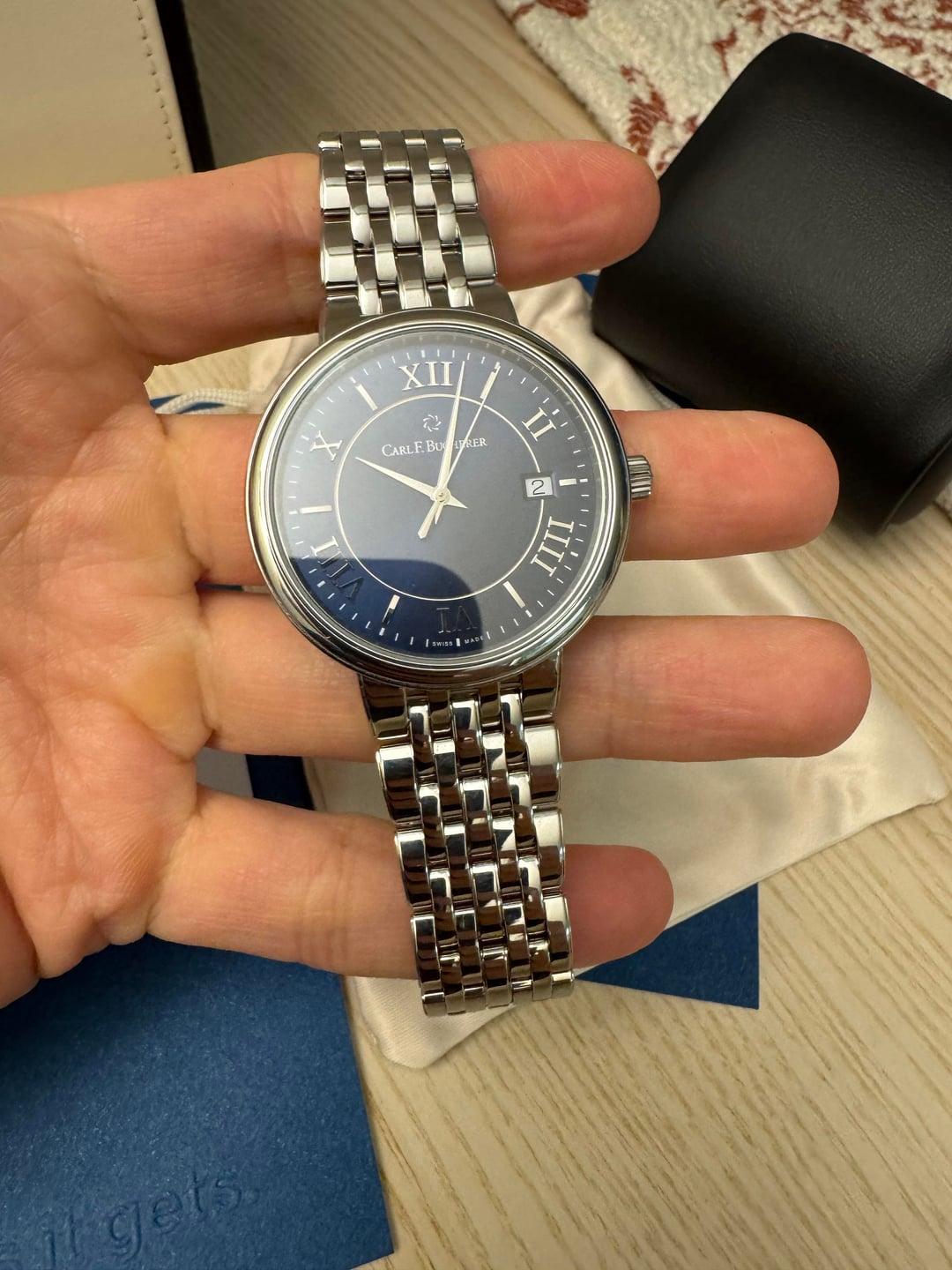 [Video](https://imgur.com/a/JeqmbUQ) [Album+Timestamp](https://imgur.com/a/ndLCvap) Hey everyone — feel free to reach out if you have any questions. Up for sale is a Carl F. Bucherer Adamavi Automatic with a blue dial in a 39mm case. It’s a great all-around size that works well for daily wear but still looks sharp dressed up. The design is clean, classic, and understated. The movement is nicely finished with perlage and heat-blued screws, details you usually see on higher-priced watches. The bracelet uses screws instead of pins, which is a nice quality touch. Overall, this watch really punches above its weight and reflects the attention to detail CFB is known for. The watch will come with an official eBay Authentication card, confirming it passed inspection and is 100% authentic. Condition • Like-new showroom condition with tags • Never worn, running perfectly • Very light handling marks (barely noticeable) • Sapphire crystal is clean and scratch-free Details • Brand: Carl F. Bucherer • Model: Adamavi Automatic • Reference: 00.10314.08.55.21 • Dial: Blue • Case Size: 39mm • Movement: Swiss automatic • Crystal: Sapphire • Swiss made Included • Leather travel case & pouch • Original hang tag (MSRP $2,750) • eBay Authentication card Price $725 shipped — lowest priced blue dial available (checked thoroughly) Payment • PayPal Friends & Family • Zelle • Bank wire Shipping • USPS Priority • Signature required Location • California • CONUS only Notes I’ve sold multiple higher-end watches and can provide solid references if needed