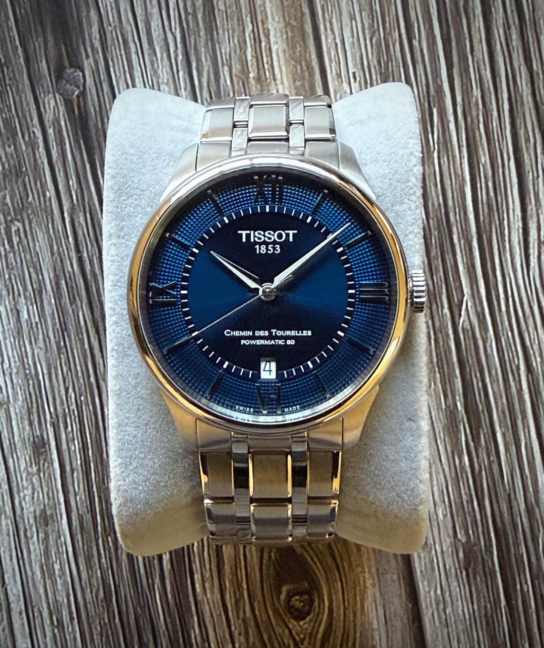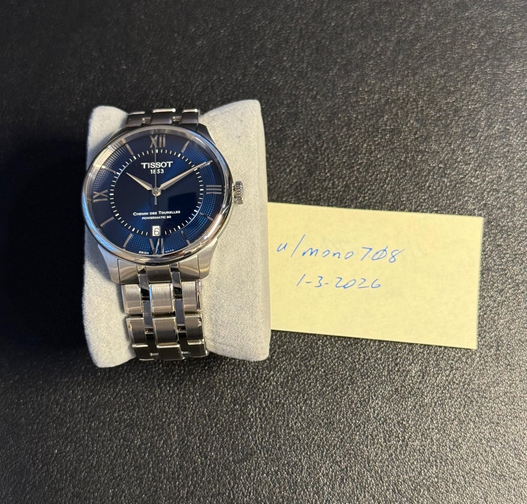 Excellent condition Tissot Chemin de Tourelle with the Powermatic 80 movement. 39mm case, deep blue sunburst dial, sapphire crystal, exhibition case back. Runs strong with \~80-hour power reserve. If you’ve never tried on this watch, you’ll be pleasantly surprised how comfortable this watch drapes over the wrist. The transition from the case to the bracelet is exceptionally smooth and adds to its wearability. Also, if you look closely at the case back photo, you’ll see it has quick-release pins where the bracelet meets the case, making it a breeze to swap straps. Wish all bracelets had this feature. **Dimensions & Specs** * **Case diameter:** 39.0 mm * **Lug-to-lug:** 43.7 mm * **Thickness:** 11.2 mm * **Lug width:** 20 mm * **Case material:** Stainless steel * **Power Reserve:** 80 hours Bought new in September 2024 and worn 1-2 times a month as part of a broader collection. Minor case wear as indicated in photos. Comes with original bracelet and box. **Photos:** High-resolution photos and timestamp available here: [**https://imgur.com/a/mo4BejV**](https://imgur.com/a/mo4BejV) **Price:** $395 shipped CONUS **Payment:** PayPal F&F or G&S (buyer covers fee) **Location:** Atlanta GA area **Buy With Confidence:** * **Questions:** Happy to provide more pics or answer any questions by phone, zoom etc! * **References**: I’m a longtime Redditor with 100% positive transactions on r/Watchexchange. * **Video Confirmation**: Available to schedule a video/facetime viewing, provide timestamped photos, etc. – just let me know. Please comment before messaging. Thanks for looking!