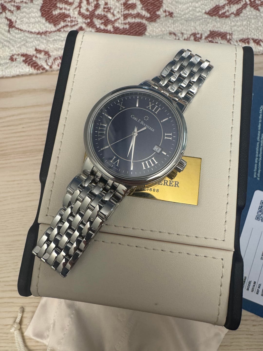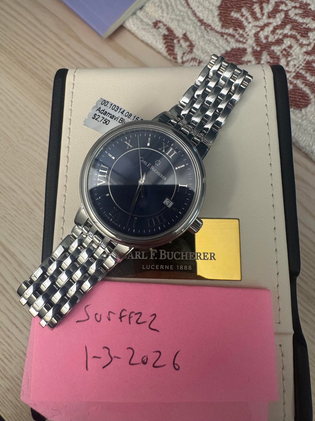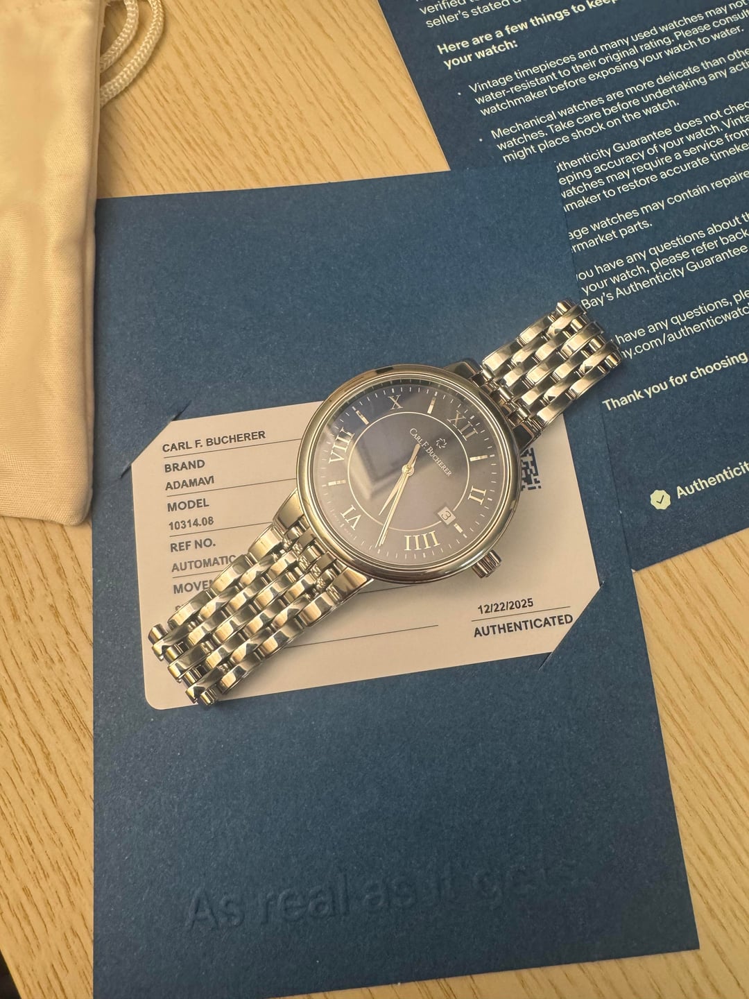 [Album+Timestamp](https://imgur.com/a/6etW6IR) [Video](https://imgur.com/a/carl-qUd3G4U) Hey everyone — feel free to reach out if you have any questions. Up for sale is a Carl F. Bucherer Adamavi Automatic with a blue dial in a 39mm case. It’s a great all-around size that works well for daily wear but still looks sharp dressed up. The design is clean, classic, and understated. The movement is nicely finished with perlage and heat-blued screws, details you usually see on higher-priced watches. The bracelet uses screws instead of pins, which is a nice quality touch. Overall, this watch really punches above its weight and reflects the attention to detail CFB is known for. The watch will come with an official eBay Authentication card, confirming it passed inspection and is 100% authentic. Condition • Like-new showroom condition with tags • Never worn, running perfectly • Very light handling marks (barely noticeable) • Sapphire crystal is clean and scratch-free Details • Brand: Carl F. Bucherer • Model: Adamavi Automatic • Reference: 00.10314.08.55.21 • Dial: Blue • Case Size: 39mm • Movement: Swiss automatic • Crystal: Sapphire • Swiss made Included • Leather travel case & pouch • Original hang tag (MSRP $2,750) • eBay Authentication card Price $749 shipped — lowest priced blue dial available (checked thoroughly) Payment • PayPal Friends & Family • Zelle • Bank wire Shipping • USPS Priority • Signature required Location • California • CONUS only Notes I’ve sold multiple higher-end watches and can provide solid references if needed