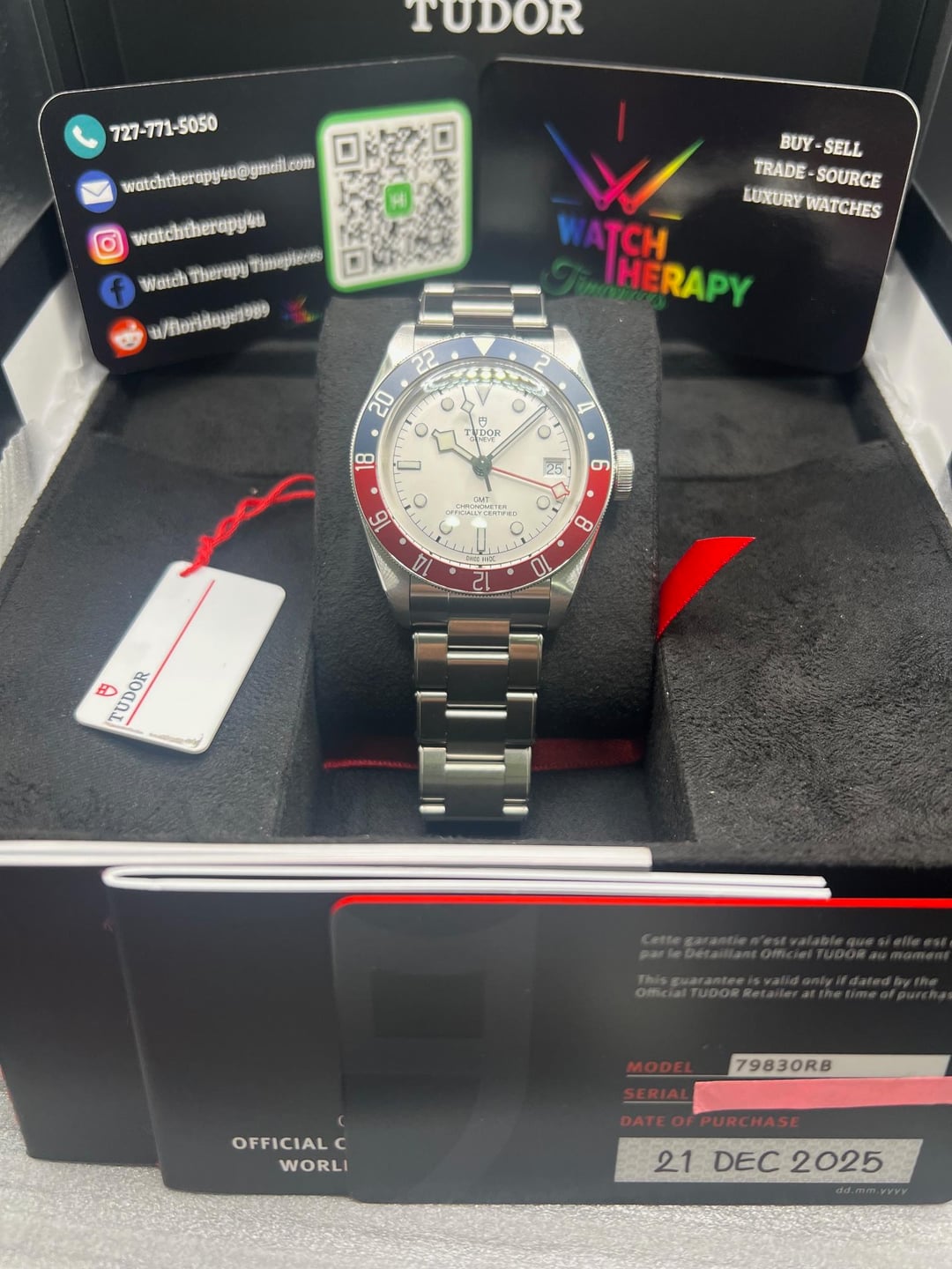 **F/S: New Tudor Black Bay GMT Pepsi White Dial Opaline Ref# 79830RB** **Specs:** \* Beautiful opaline domed dial \* Automatic self-winding \* 41mm \* SS Riveted Bracelet \* 200M Water Resistance \* 70-hour power reserve \* MT5652 (COSC) movement **Includes**: Warranty card 12/25, double boxed, booklets and tag. **Condition:** 10/10 unworn unsized **Price: $4,150.00 + Insured shipping to your local FedEx for pick-up in Con US**. I am also open to a face-to-face public transaction in or around the Tampa Florida Region, within reason. I have many strong and viable references within Reddit and from Buy/Sell/Trade Watch Facebook groups. Always willing to jump on a call or meeting link to show you the watch. Thank you and please reach out if you have any questions or concerns. Florida residents may be subject to sales tax w/o a valid reseller cert. ***No Trades, TY*** **Location**: Tampa Florida **Payment:** Zelle or Wire Timestamp: [https://imgur.com/a/pTodHL6](https://imgur.com/a/pTodHL6) FB: Watch Therapy Timepieces IG: [@watchtherapy4u](https://www.reddit.com/u/watchtherapy4u/)