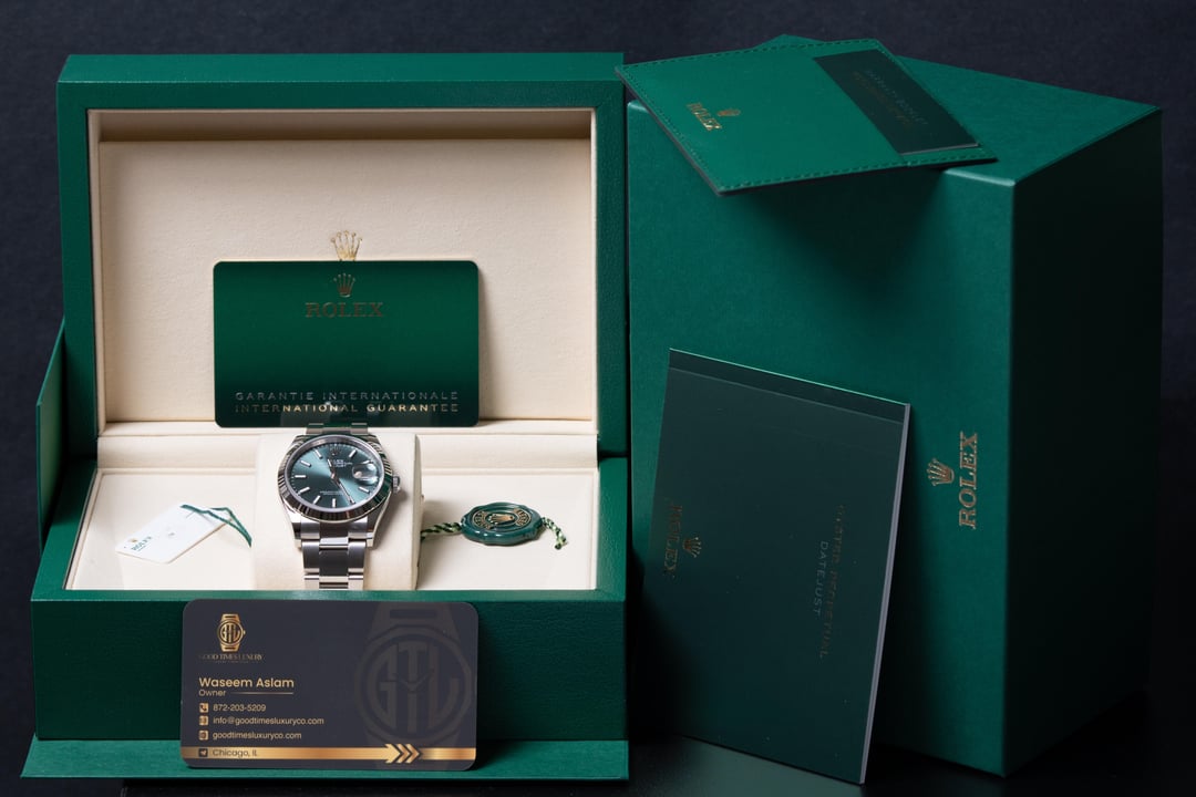 - Timestamp: https://imgur.com/a/q9agtqR ******************************************************* * Reference: 126234 * Condition: Brand New, Never Worn or Sized * Box and Papers? Yes, Complete Set * Warranty Card Date: Dec 2025 (Under warranty until 2030) **Key Features:** * Case Size: 36mm Oystersteel and white gold case * Bracelet: Fully Linked Oyster bracelet with Oysterclasp and Easylink 5mm comfort extension link * Dial Color: Striking Green with sunray finish aka Mint Green * Hour Markers: Luminous baton-style markers with Chromalight display for long-lasting blue luminescence * Bezel: Fluted bezel crafted from 18k white gold * Crystal: Scratch-resistant sapphire with Cyclops lens over the date * Movement: Perpetual, mechanical, self-winding Caliber 3235 * Water Resistance: Waterproof to 100 meters (330 feet) * Date Feature: Instantaneous date with rapid setting; stop-seconds for precise time setting ******************************************************* 💳 Payment options: * All MajorCredit Cards * Bank Wire * Crypto (1% fee) For your convenience, you may divide payments into various forms of payment. ******************************************************* **💰Bank Wire: $13,495, CC: $14,035 includes fully insured UPS or FedEx Shipping** ******************************************************* 📍 Location: Chicago, IL 🚀 Shipping: Every package is insured for its full value and shipped via FedEx Overnight service to your nearest FedEx Office or Delivered straight to your door via UPS Next Day service. ********************************************************** 📩 Contact: * 📞 872-203-5209 Call/Text/Whatsapp ******************************************************* 📸 Insta: @goodtimesluxury ⭐️ Check Reviews on Google and Trust Pilot 🌐 Google us: Good Times Luxury Chicago 👨🏻💻 Website: goodtimesluxuryco dot com About me 🙋🏻♂️: My name is Waseem Aslam, Owner of Good Times Luxury. Please don’t hesitate to contact me with any questions. I’m happy to jump on a facetime call to show the watch and answer any questions you may have until you’re confident in your purchase. Talk soon, thanks! *******************************************************