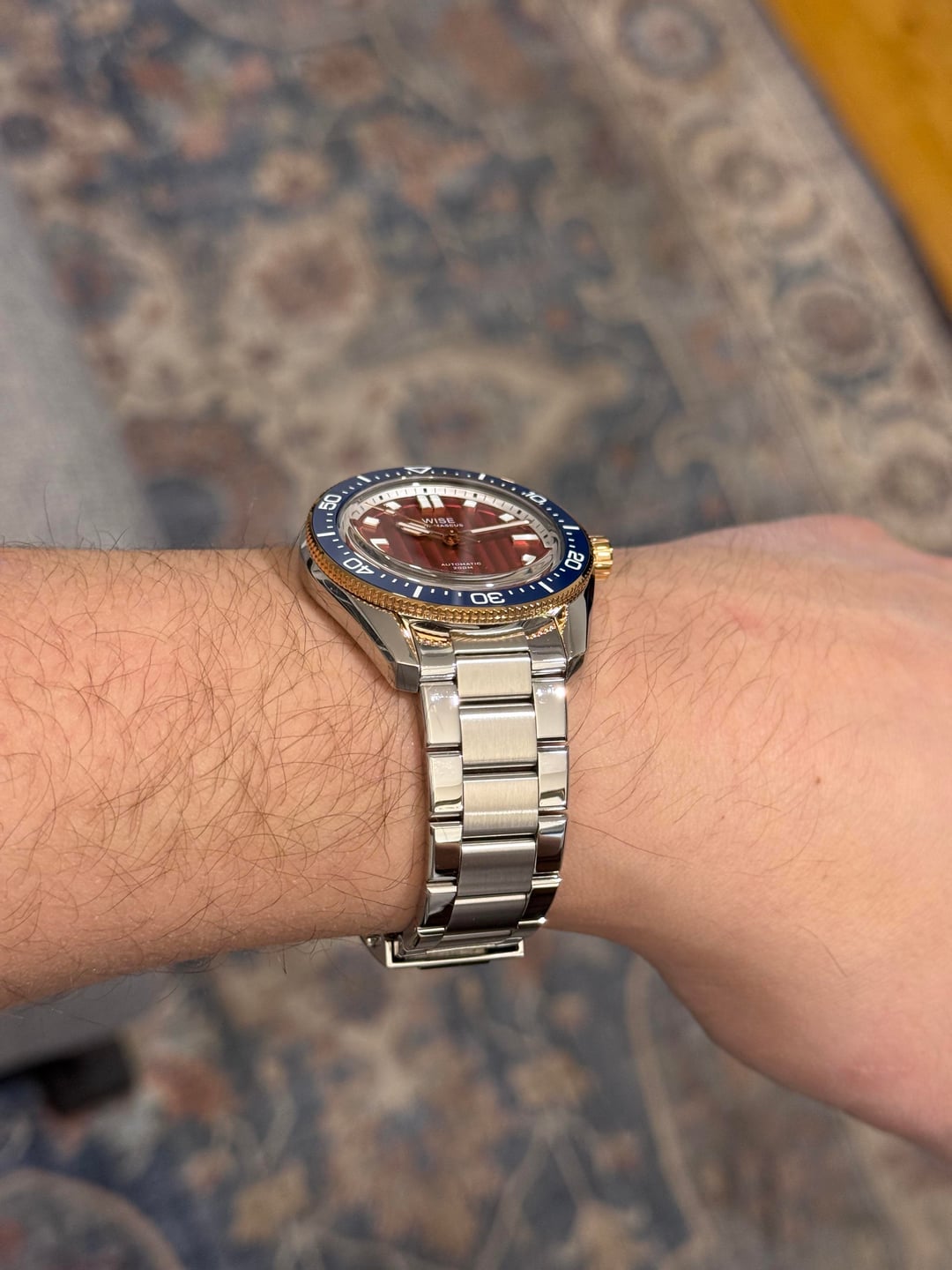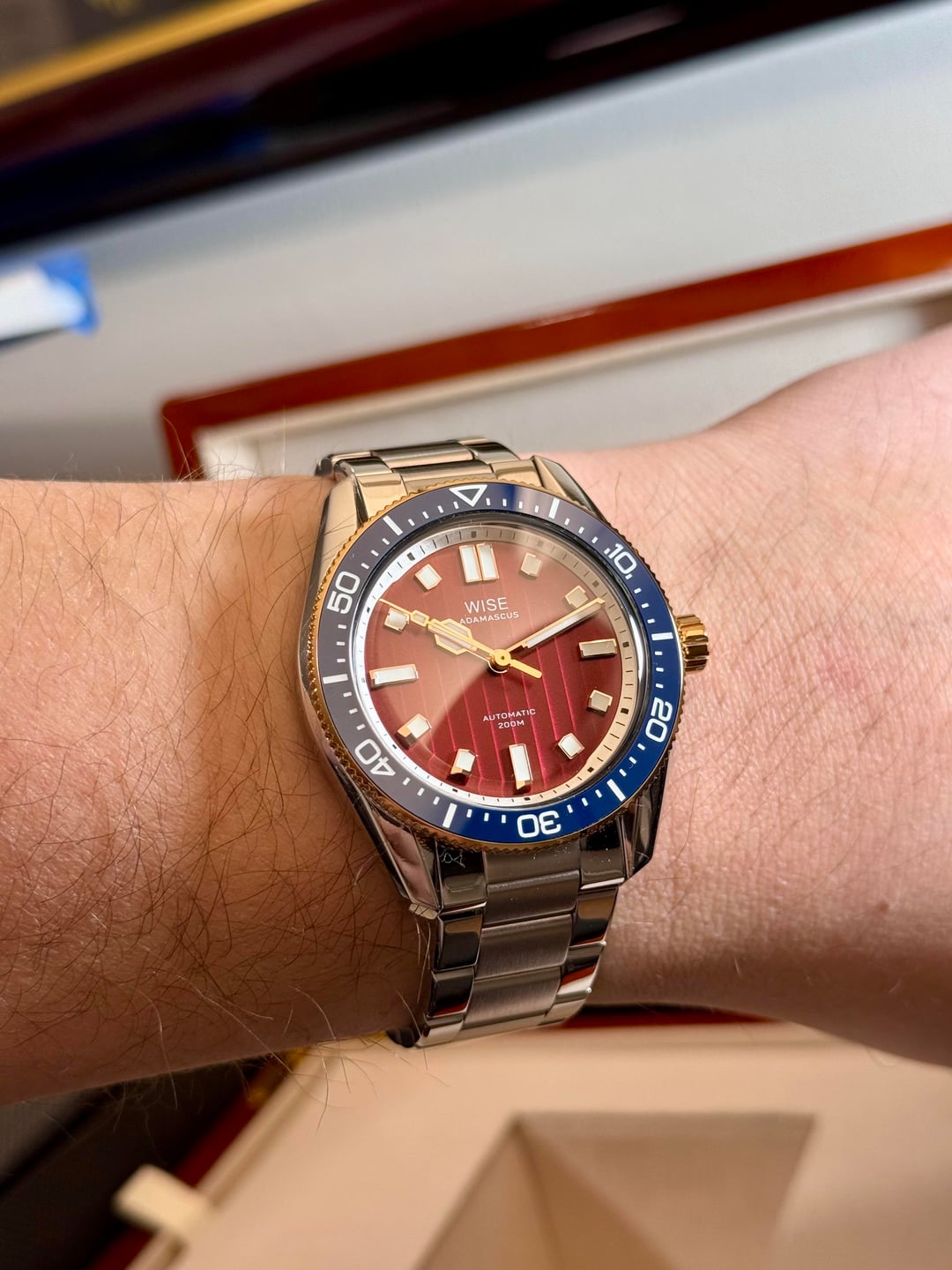 Hello Watchex, Up for sale is my Wise Adamascus AD8 Shades of Thailand LE, featuring a striking burgundy horizontal wave (ribbed) dial. The dial has a deep wine-red tone with strong texture that catches the light beautifully, shifting from crimson to raspberry depending on angle. Paired with the blue ceramic bezel, it’s a stunner. The watch is in excellent condition, running perfectly and keeping great time. Worn sparingly and well cared for. Price: $800 USD shipped CONUS Payment: Zelle No trades at this time, need to fundraise for something. Thank you! ⸻ Specs: • Brand / Model: Wise Adamascus • Movement: Miyota 9015 automatic • Case: Stainless steel • Case Diameter: 41 mm • Thickness: ~12 mm • Lug Width: 20 mm • Crystal: Sapphire (with AR coating) • Bezel: Unidirectional dive bezel (blue) • Dial: Burgundy / wine red horizontal wave textured dial • Water Resistance: 200 meters • Bracelet: Stainless steel bracelet with solid end links Full kit. Timestamp/video: https://imgur.com/a/PCdBCLp