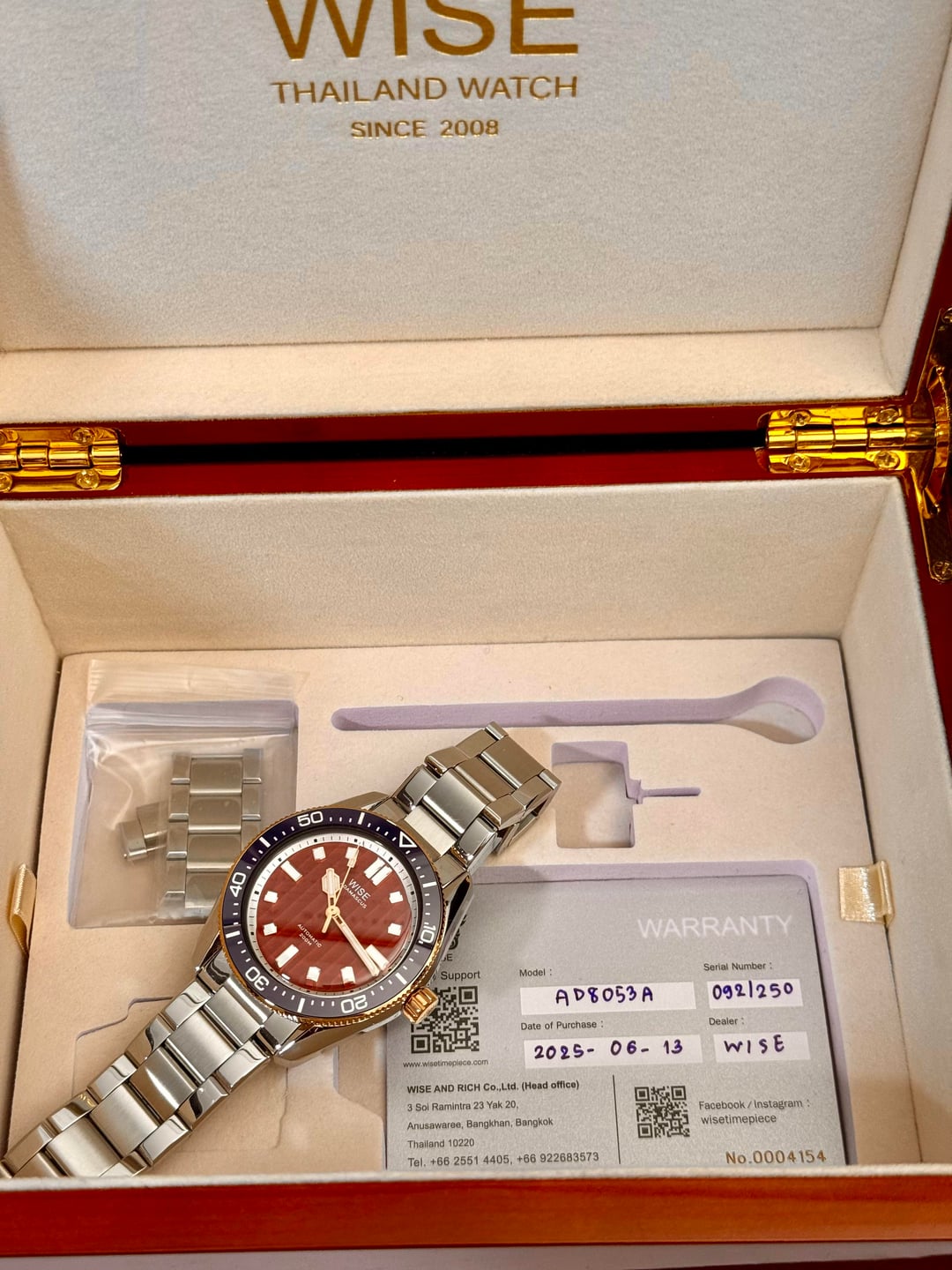 español![[WTS] Wise Adamascus AD8 “Shades of Thailand” Limited Edition of 250 - Stunning Textured Wine Red Dial/Blue Ceramic Bezel - 904L steel - On the Fly Clasp - Full Kit - The Thai Grand Seiko for Only $800 shipped CONUS (SOLD OUT Wise and my most complimented watch) 1](https://cdn-cf.watchpatrol.net/600x600/img/full/eeef001ef16e4aa599ebff76230ff123501dded6.jpg)