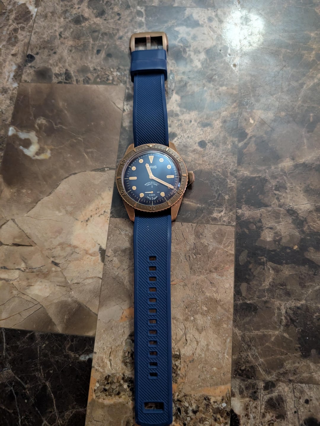 Hello WatchEx, Up for sale an Oris Carl Brashear Cal 401 limited edition, number 1934/2000. Watch is in good shape and showing normal bronze patina which can be cleaned up if you desire. Comes as a complete kit with box and papers. Has original Erika's strap with bronze hardware. Currently sitting on a Barton rubber strap with bronze hardware. Tough to let this one go, but its just not getting wrist time. I will ship from and to the CONUS and will pay for the label. Asking $2,200. Please feel free to ask questions. Information from Oris below: Reference Number 01 401 7764 3185-Set Case Multi-piece bronze case, bronze minute scale top ring. Sapphire, domed on both sides, anti-reflective coating inside. Stainless steel, special engravings, screwed. 40.00 mm Size 10 bar Water Resistance 20 mm Interhorn Width Movement Centre hands for hours and minutes, subsidiary second at 6 h, fine timing device and stop-second 120 hrs Power reserve Caliber CALIBRE 401 (no date) Dimensions Ø 30.00 mm, 13 1/4’’’ Winding Automatic winding, uni-directionally rotating rotor Vibrations 28’800 A/h, 4 Hz Dial Blue Strap Textile